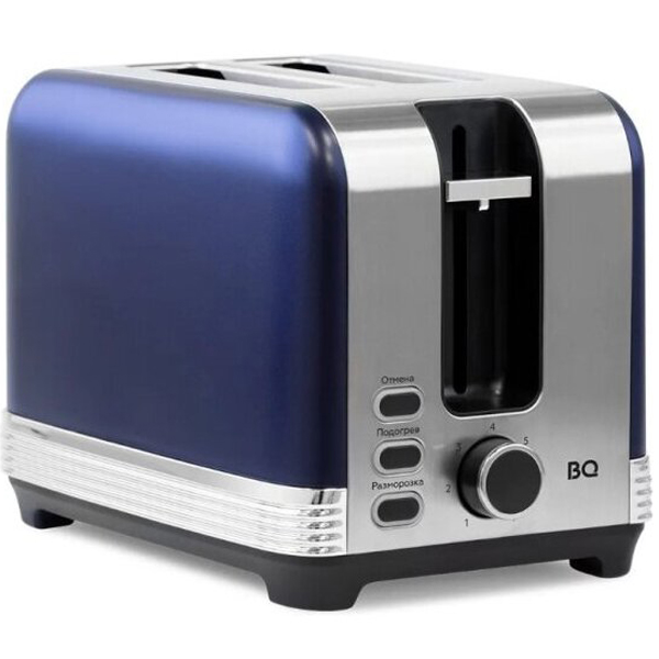 Тостер BQ T1000 413827 серебристо-синей расцветки обладает максимальной мощностью энергопотребления 1000 Вт. К электросети прибор подключается посредством сетевого кабеля длиной 65 см. Модель оснащена двумя отсеками длиной 13,5 см и шириной 3,5 см. Есть семь режимов степени поджаривания тостов, кнопка «Стоп», функции «Автоматическое центрирование» и «Подогрев». Управление электронное. Световая индикация оповещает о включении тостера.