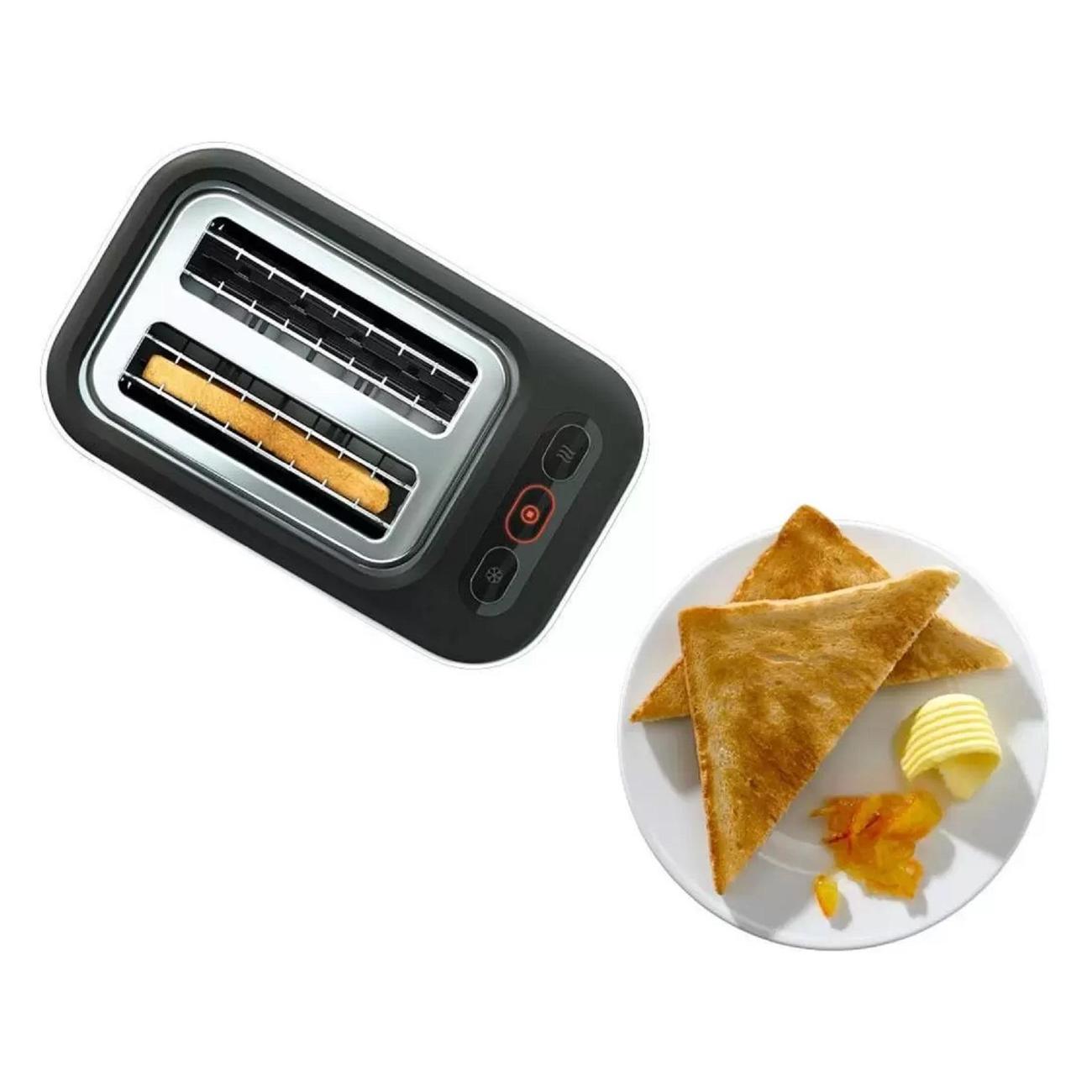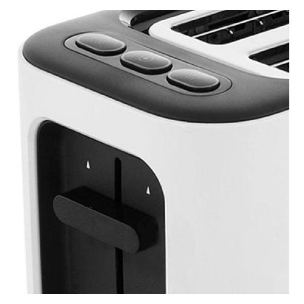 Крошки попадают в поддон, который легко вынимается для очистки. Предусмотрена система защиты от перегрева, которая отключит тостер при риске поломки. Прибор потребляет 1000 Вт, подключается к сети при помощи кабеля длиной 0,8 м. Корпус изготовлен из пластика, оснащен отсеком для намотки шнура. Размеры устройства: 19,5х24,5х15 см, вес — 1,5 кг.