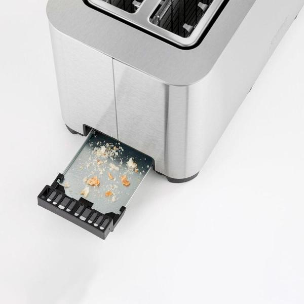 Тостер самостоятельно центрирует тосты во время загрузки и автоматически подает их после завершения работы. Все крошки, которые образуются в процессе работы тостера, скапливаются в специальном поддоне, который можно легко снять для очистки. Тостер работает при мощности от 1,18 кВт до 1,4 кВт.