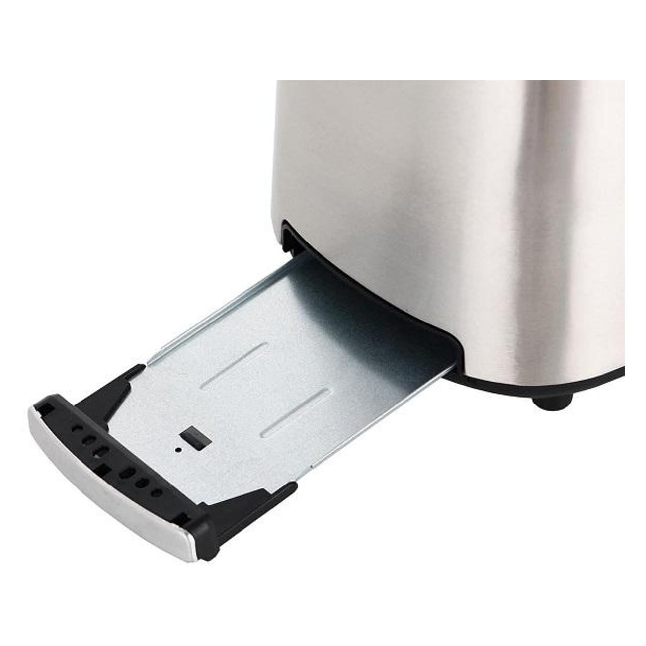 Тостер оснащен аналоговым регулятором температуры. На корпусе располагается индикация работы. Переключатели также подсвечиваются. Тосты поднимаются автоматически + предусмотрен рычаг для их ручного извлечения. Прибор самостоятельно отключается по окончании работы. Прорезиненные ножки обеспечивают устойчивость тостера горизонтальной поверхности. В комплект входит съемная решетка для подогрева кусочков хлеба, выдвижной поддон для сбора крошек.