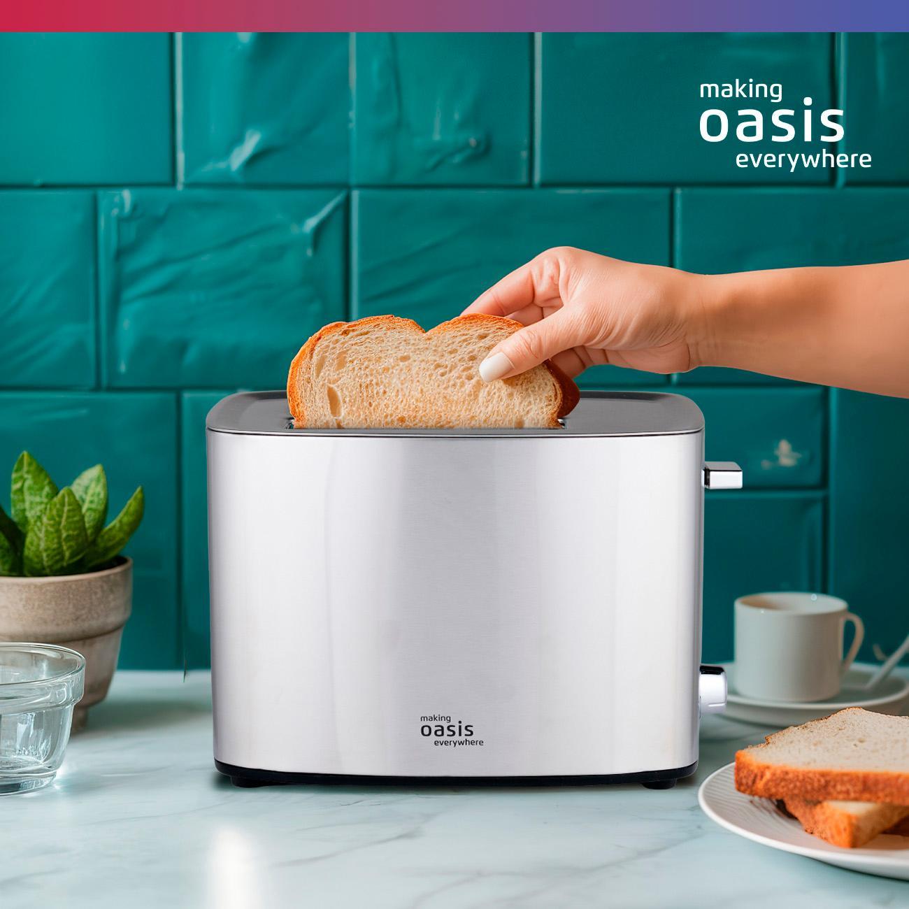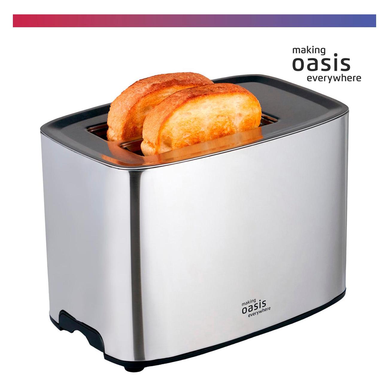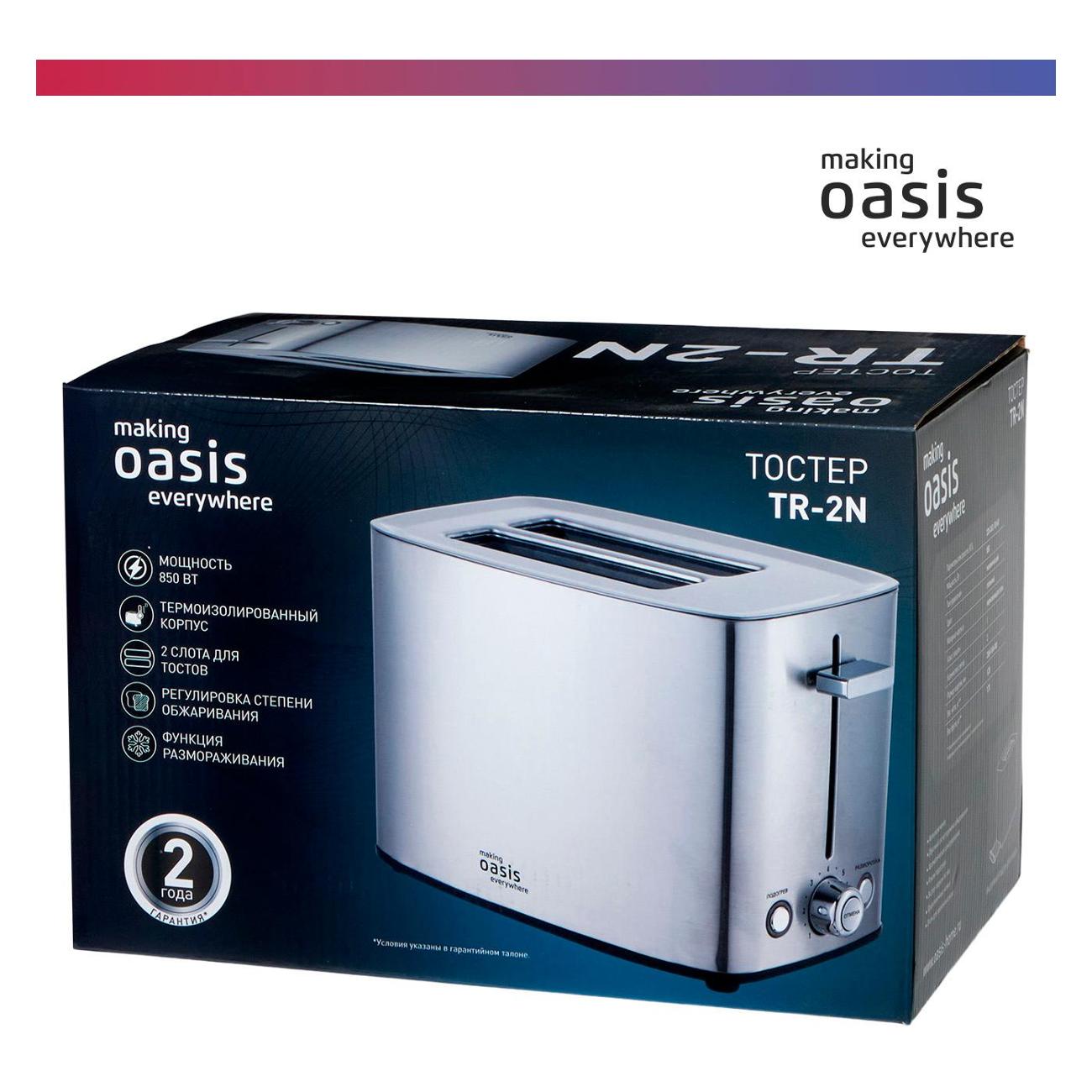 Тостер «making Oasis everywhere» TR-2N — модель с габаритными размерами 16х26,5х18 см весом 1,28 кг. Термоизолированный корпус, произведённый из нержавеющей стали, уменьшает вероятность возникновения ожогов в процессе эксплуатации. За сохранение чистоты на поверхности стола отвечает поддон для крошек. Прорезиненные ножки исключают соскальзывание с любой горизонтальной поверхности. Шнур длиной 0,75 м хранится в небольшом отсеке.