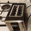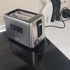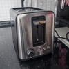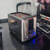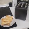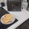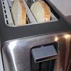 Регулировка степени обжарки в тостере осуществляется плавно от минимального уровня (самый светлый оттенок) до максимального (золотистые тосты с хрустящей корочкой). После завершения приготовления механизм автоматически приподнимает хлеб для его удобного извлечения вилкой или руками. Боковой рычаг отвечает за автоматическую загрузку новых ломтиков.