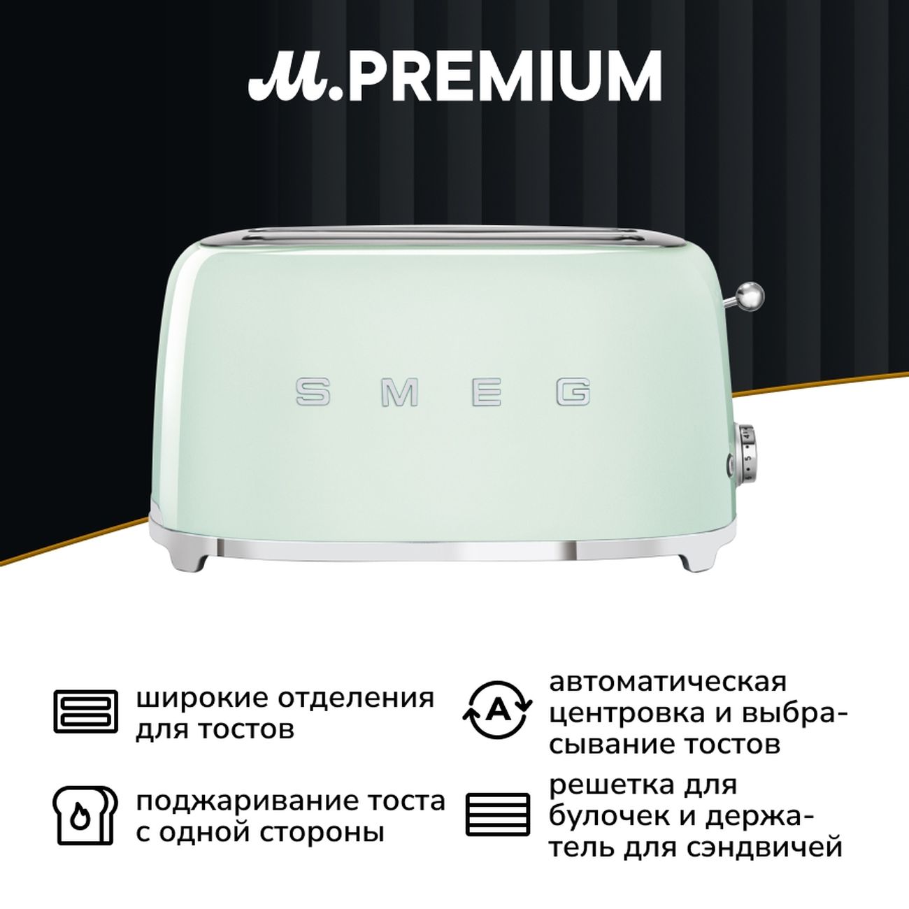 Тостер Smeg TSF02PGEU имеет крупные прорези, позволяющие нагревать до четырёх ломтиков хлеба одновременно. Система автоматического центрирования не допускает их перекашивания, становящегося причиной пригорания.