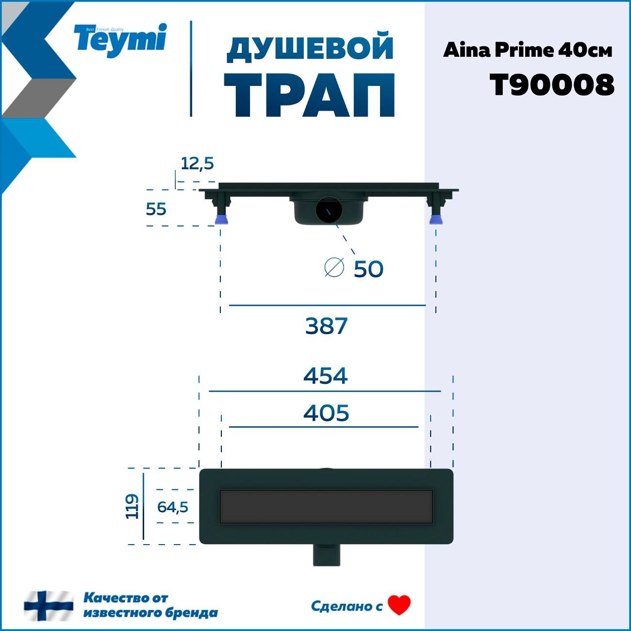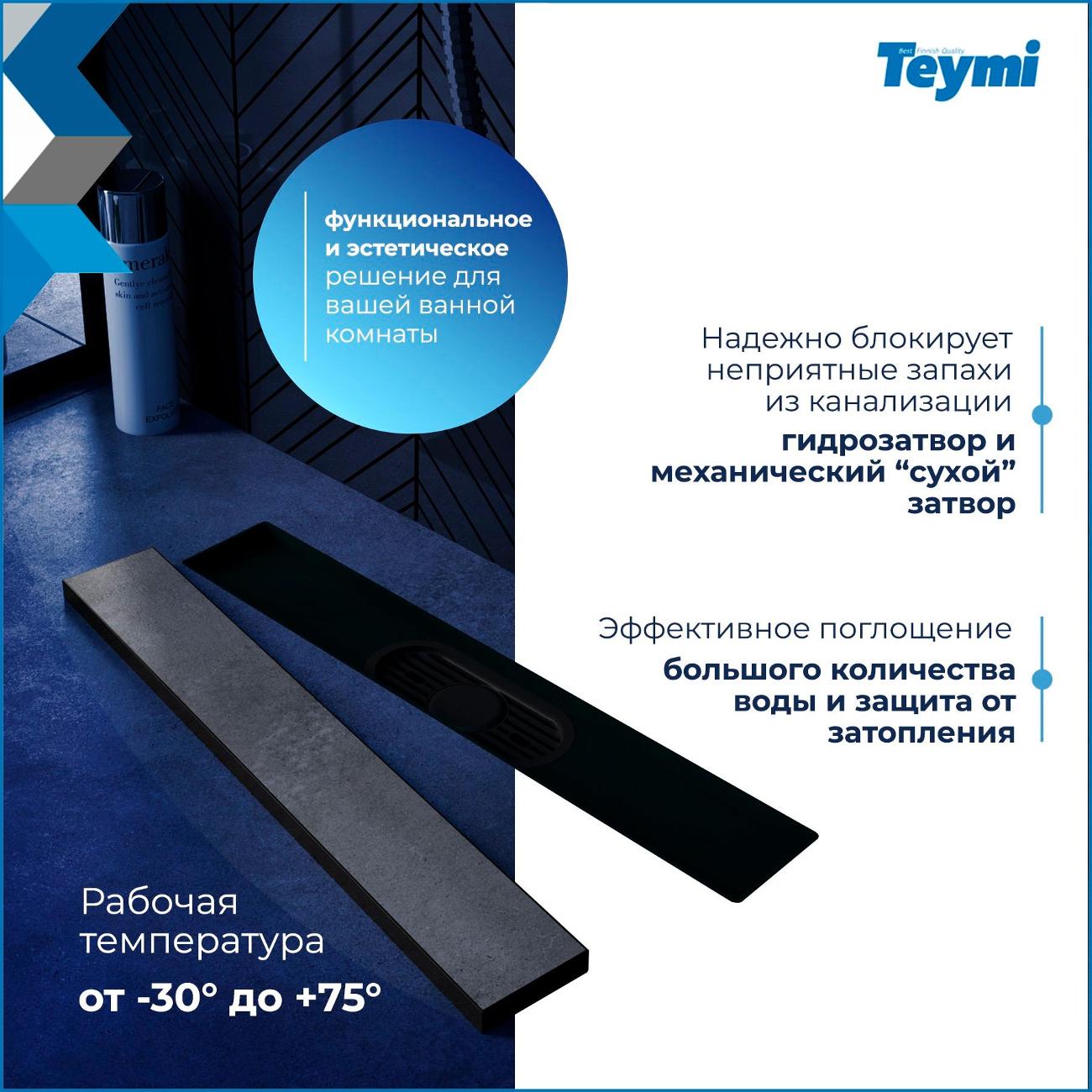 Душевой трап Teymi Aina Prime черный 40 см - инновационное решение от финского производителя для организации современной душевой зоны. Эта модель под плитку с гидрозатвором T90008 объединяет стильный дизайн, высокую функциональность и эффективный водоотвод. Конструкция из премиальной нержавеющей стали марки 304 гарантирует исключительную надежность и долговечность. Комбинированный гидрозатвор эффективно блокирует неприятные запахи из канализации, создавая комфортную атмосферу в ванной комнате. Впечатляющая пропускная способность в 32 л/мин обеспечивает быстрый отвод воды, предотвращая затопление. Трап демонстрирует высокую устойчивость к температурным колебаниям (от -30° до +75°C), что делает его идеальным выбором для различных условий эксплуатации. Оптимальные размеры (ширина 45.4 см, глубина 11.9 см, высота 7.2 см) позволяют создать элегантное напольное решение. Боковое подключение DN 50 совместимо с ПВХ-трубами, а регулируемые ножки обеспечивают точную установку при разной высоте стяжки. Особенности модели: Надежная защита от протечек; Стойкость к органическим и неорганическим веществам; Устойчивость к кислотным средам; Сопротивляемость коррозии от соленой воды; Простота монтажа и обслуживания; Гидроизоляция входит в комплект поставки. Элегантный слив под плитку позволяет создать единое визуальное пространство, где система водоотвода гармонично интегрируется в дизайн помещения. Производитель предоставляет 5-летнюю гарантию, подтверждая высокое качество продукции. Для сохранения безупречного внешнего вида рекомендуется избегать использования агрессивных чистящих средств. Регулярный уход с применением щадящих моющих составов продлит срок службы изделия. Трап для душа Aina Prime станет идеальным выбором для тех, кто ценит современные технологии, надежность и эстетику в деталях. Это профессиональное решение для создания стильного и функционального пространства для принятия душа в вашем доме.
