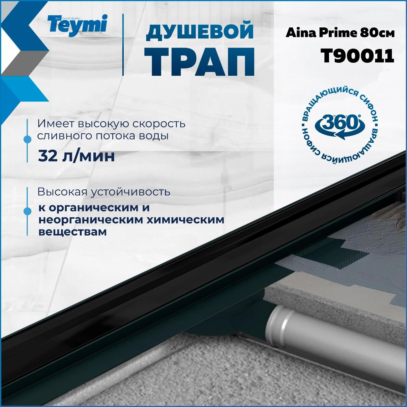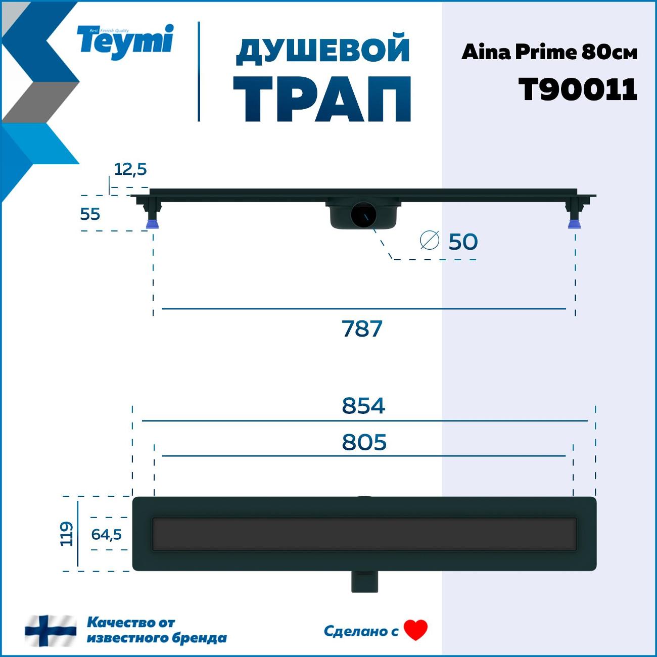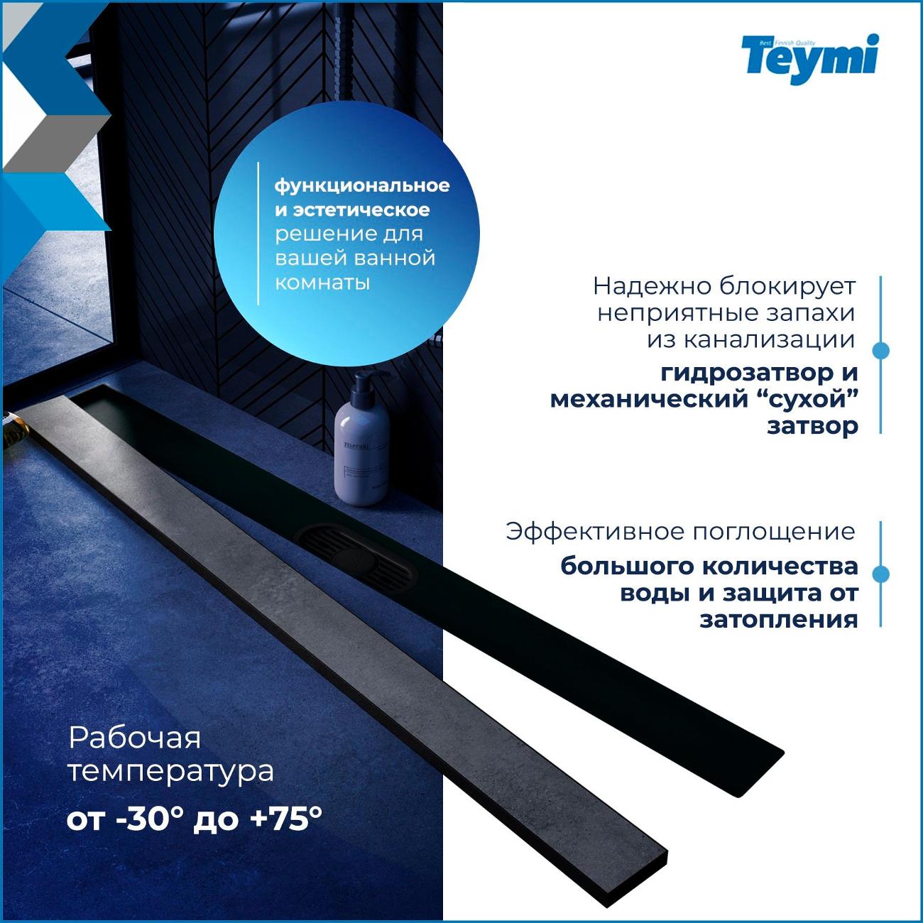 Душевой трап Teymi Aina Prime черный 80 см - инновационное решение от финского производителя для организации современной душевой зоны. Эта модель под плитку с гидрозатвором T90011 объединяет стильный дизайн, высокую функциональность и эффективный водоотвод. Конструкция из премиальной нержавеющей стали марки 304 гарантирует исключительную надежность и долговечность. Комбинированный гидрозатвор эффективно блокирует неприятные запахи из канализации, создавая комфортную атмосферу в ванной комнате. Впечатляющая пропускная способность в 32 л/мин обеспечивает быстрый отвод воды, предотвращая затопление. Трап демонстрирует высокую устойчивость к температурным колебаниям (от -30° до +75°C), что делает его идеальным выбором для различных условий эксплуатации. Оптимальные размеры (ширина 85.4 см, глубина 11.9 см, высота 7.2 см) позволяют создать элегантное напольное решение. Боковое подключение DN 50 совместимо с ПВХ-трубами, а регулируемые ножки обеспечивают точную установку при разной высоте стяжки. Особенности модели: Надежная защита от протечек; Стойкость к органическим и неорганическим веществам; Устойчивость к кислотным средам; Сопротивляемость коррозии от соленой воды; Простота монтажа и обслуживания; Гидроизоляция входит в комплект поставки. Элегантный слив под плитку позволяет создать единое визуальное пространство, где система водоотвода гармонично интегрируется в дизайн помещения. Производитель предоставляет 5-летнюю гарантию, подтверждая высокое качество продукции. Для сохранения безупречного внешнего вида рекомендуется избегать использования агрессивных чистящих средств. Регулярный уход с применением щадящих моющих составов продлит срок службы изделия. Трап для душа Aina Prime станет идеальным выбором для тех, кто ценит современные технологии, надежность и эстетику в деталях. Это профессиональное решение для создания стильного и функционального пространства для принятия душа в вашем доме.