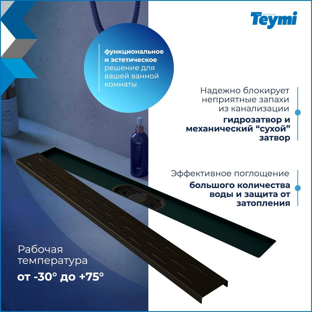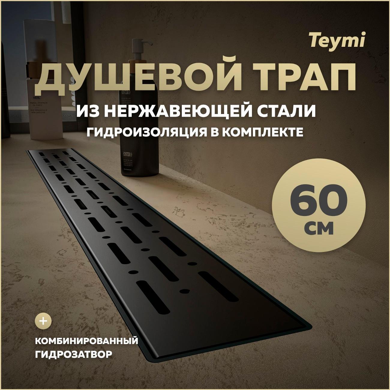 Душевой трап Teymi Helmi Prime 60 см чёрный решетка из нержавеющей стали - инновационное решение от финского производителя для организации современной душевой зоны. Эта модель с гидрозатвором T90340 объединяет стильный дизайн, высокую функциональность и эффективный водоотвод. Конструкция из премиальной нержавеющей стали марки 304 гарантирует исключительную надежность и долговечность. Комбинированный гидрозатвор эффективно блокирует неприятные запахи из канализации, создавая комфортную атмосферу в ванной комнате. Впечатляющая пропускная способность в 32 л/мин обеспечивает быстрый отвод воды, предотвращая затопление. Трап демонстрирует высокую устойчивость к температурным колебаниям (от -30° до +75°C), что делает его идеальным выбором для различных условий эксплуатации. Оптимальные размеры (ширина 65.4 см, глубина 11.9 см, высота 7.2 см) позволяют создать элегантное напольное решение. Боковое подключение DN 50 совместимо с ПВХ-трубами, а регулируемые ножки обеспечивают точную установку при разной высоте стяжки. Особенности модели: Надежная защита от протечек; Стойкость к органическим и неорганическим веществам; Устойчивость к кислотным средам; Сопротивляемость коррозии от соленой воды; Простота монтажа и обслуживания; Гидроизоляция входит в комплект поставки. Элегантная чёрная решётка из нержавеющей стали позволяет создать визуальное пространство, где система водоотвода гармонично интегрируется в дизайн помещения. Производитель предоставляет 5-летнюю гарантию, подтверждая высокое качество продукции. Для сохранения безупречного внешнего вида рекомендуется избегать использования агрессивных чистящих средств. Регулярный уход с применением щадящих моющих составов продлит срок службы изделия. Трап для душа Helmi Prime станет идеальным выбором для тех, кто ценит современные технологии, надежность и эстетику в деталях. Это профессиональное решение для создания стильного и функционального пространства для принятия душа в вашем доме.