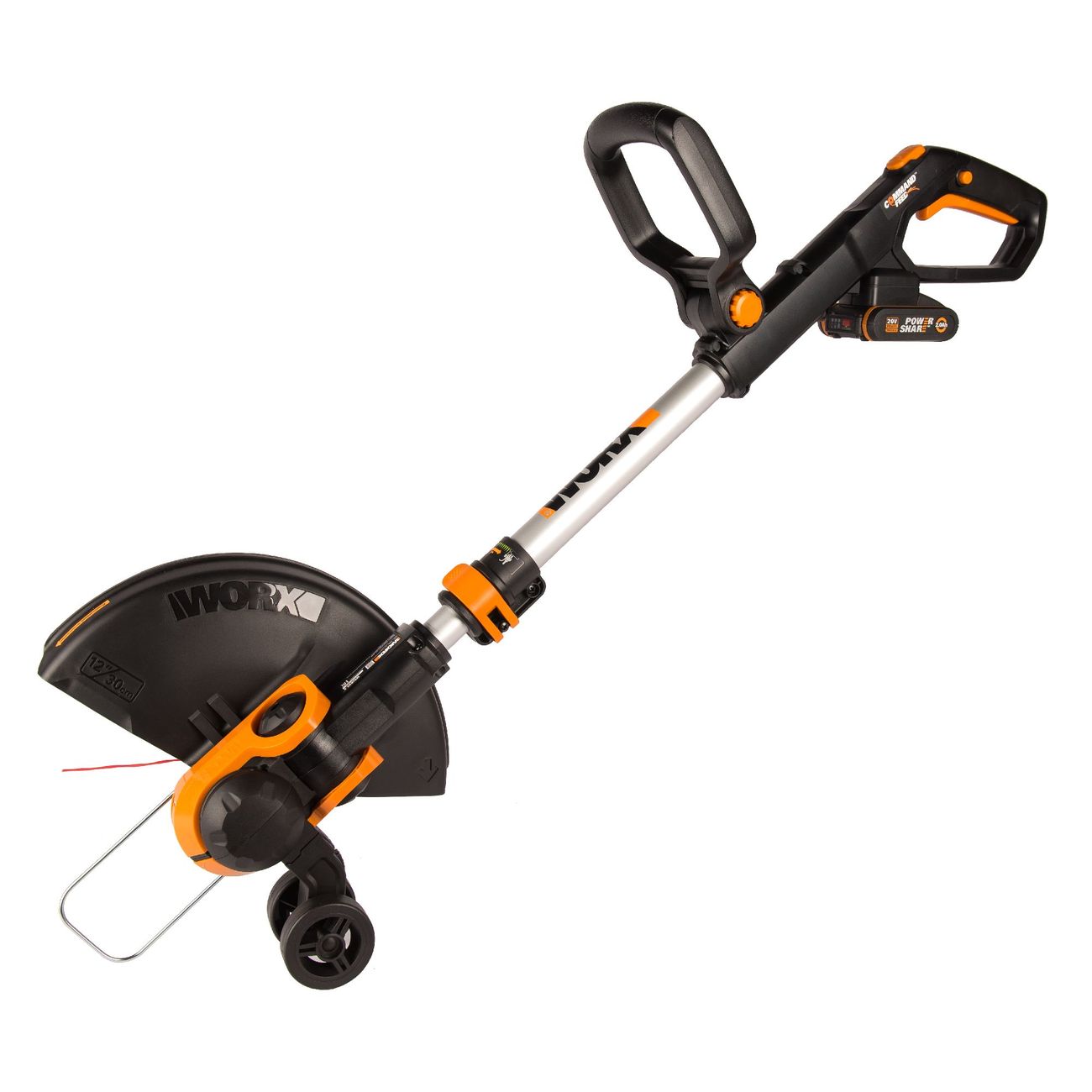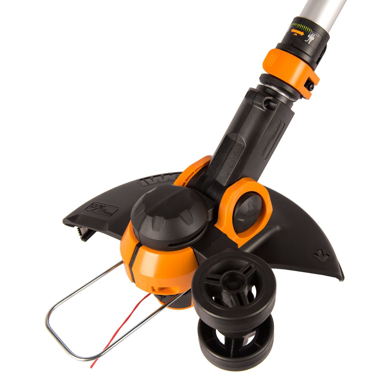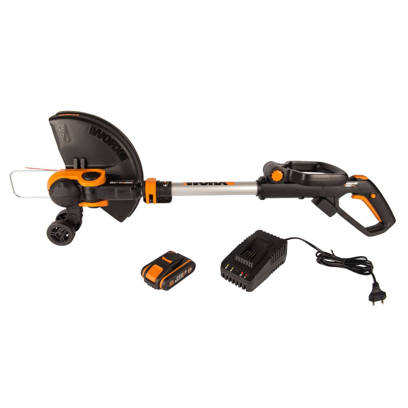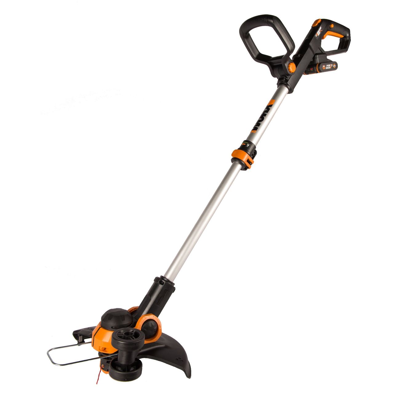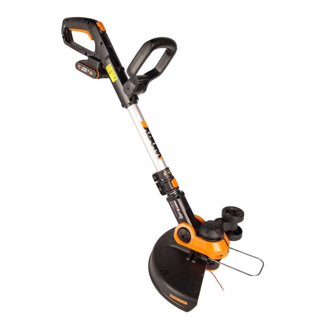 Электрический триммер Worx работает от литий-ионного аккумулятора мощностью 20 В.Его габариты 85 х 13 х 18 см, а вес — 2,6 кг: за счет компактности возможно с меньшими усилиями обрабатывать труднодоступные участки.