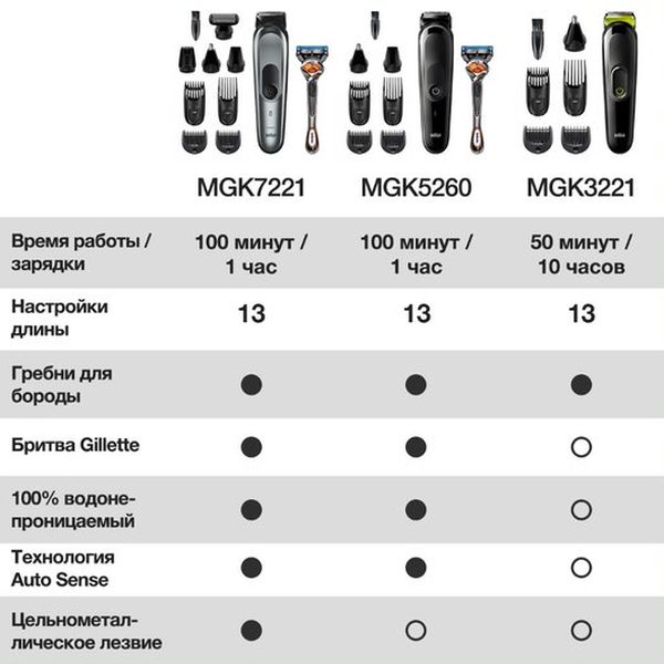 С триммером Braun MGK 3221 вы в домашних условиях сможете ухаживать за собой ничуть не хуже, чем в барбершопе. Благодаря богатой комплектации разнообразными насадками вы получите возможность стричь волосы на голове и теле, придавать форму бороде, бакенбардам и усам, удалять растительность из носа и ушей.