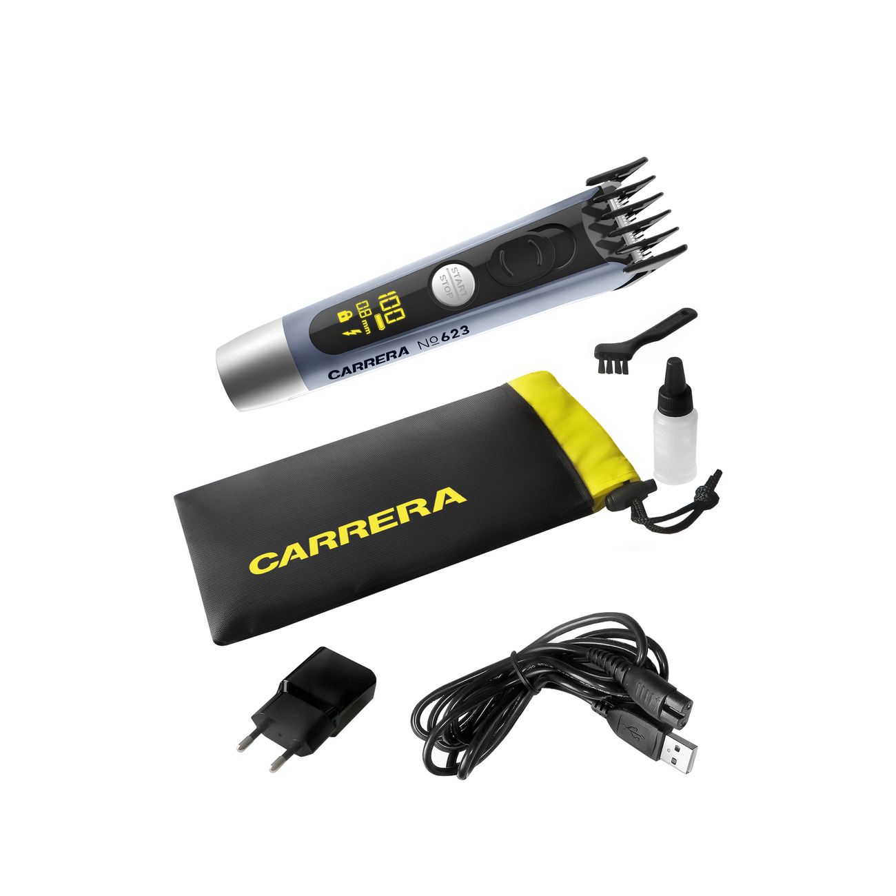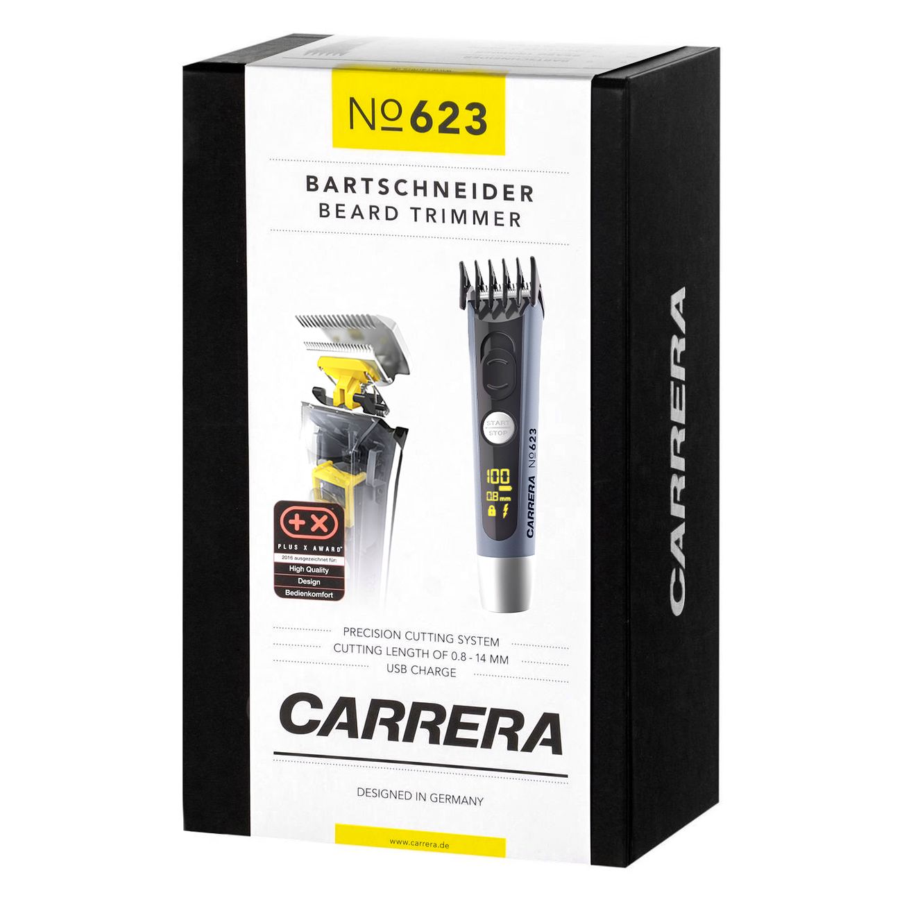 Триммер Carrera № 623 в корпусе из пластика оборудован лезвиями из высоколегированной нержавеющей стали. Длина стрижки составляет от 0,8 мм до 14 мм. Предусмотрена точная регулировка длины стрижки в пределах от 0,8 мм до 2 мм. Питание модели производится при помощи литиево-ионного аккумулятора и электросети 220 В. Для полной зарядки батареи требуется до 90 мин, что обеспечивает 60 мин непрерывной работы.