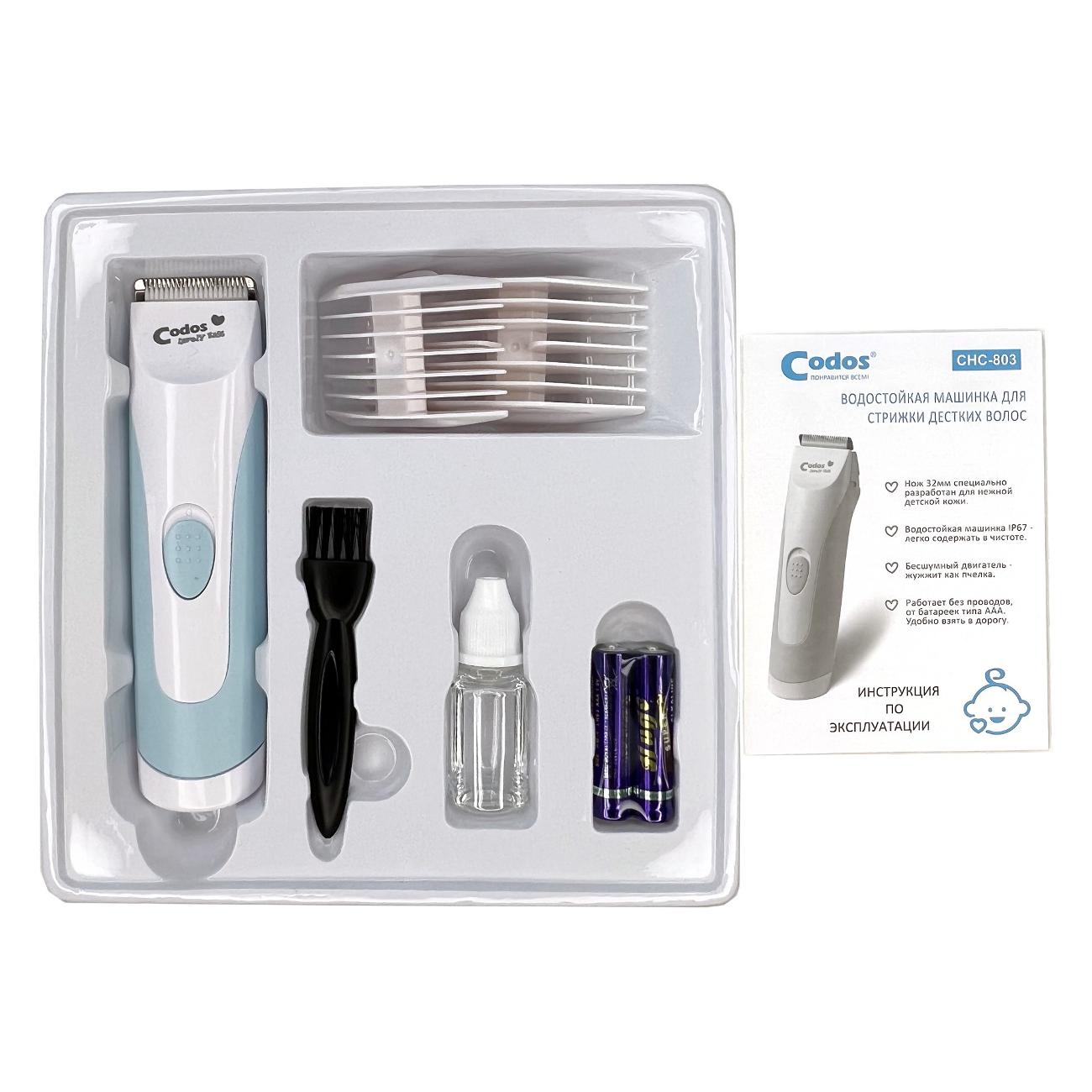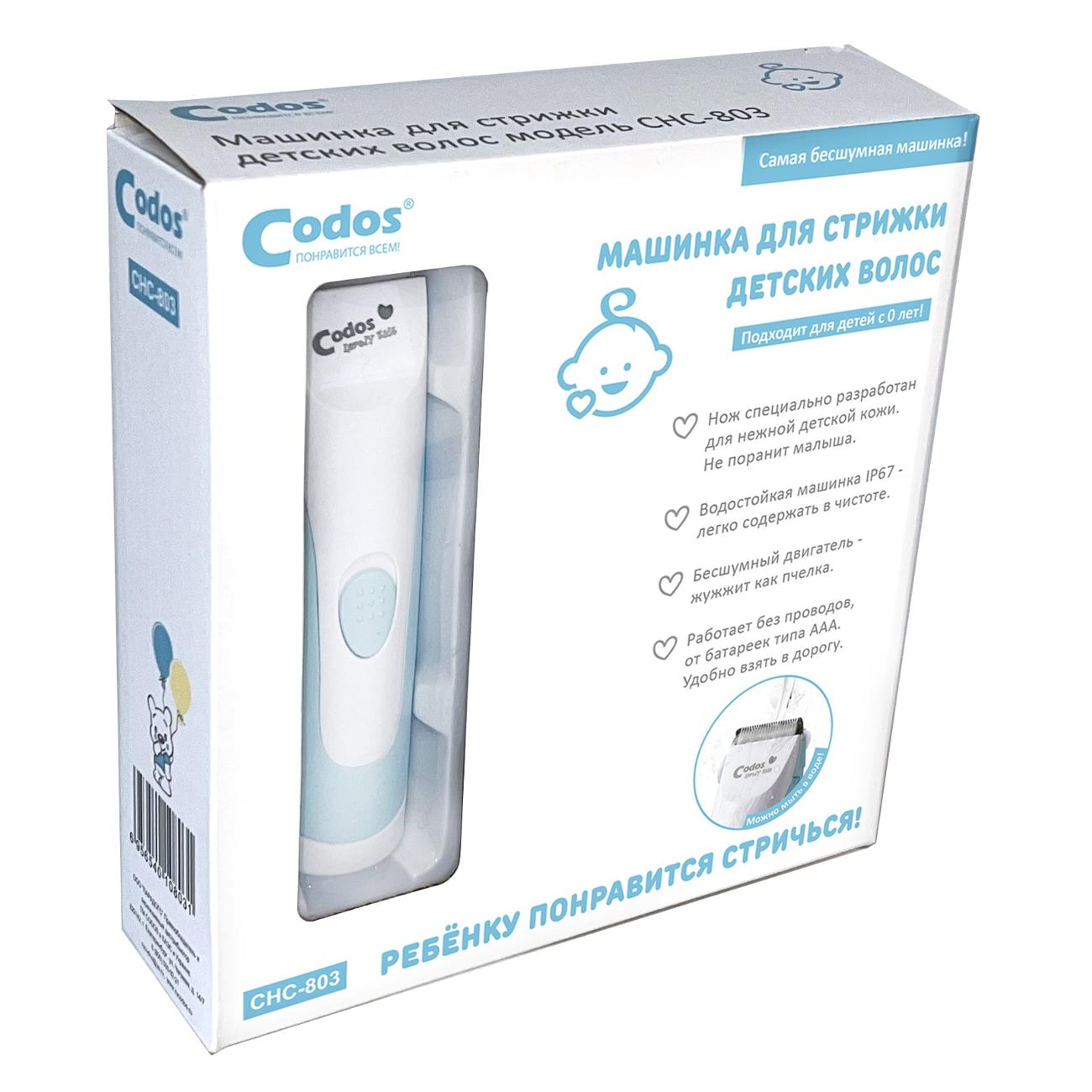 Триммер Codos CHC-803 подойдет для стрижки волос малышей с самого рождения. Оснащен безопасными лезвиями, выполненными из керамики и нержавеющей стали. Ножи можно мыть под водой. Устройство работает практически бесшумно, в качестве источника питания используются две батареи типа ААА. Корпус сделан из качественного пластика, защищен он влаги.