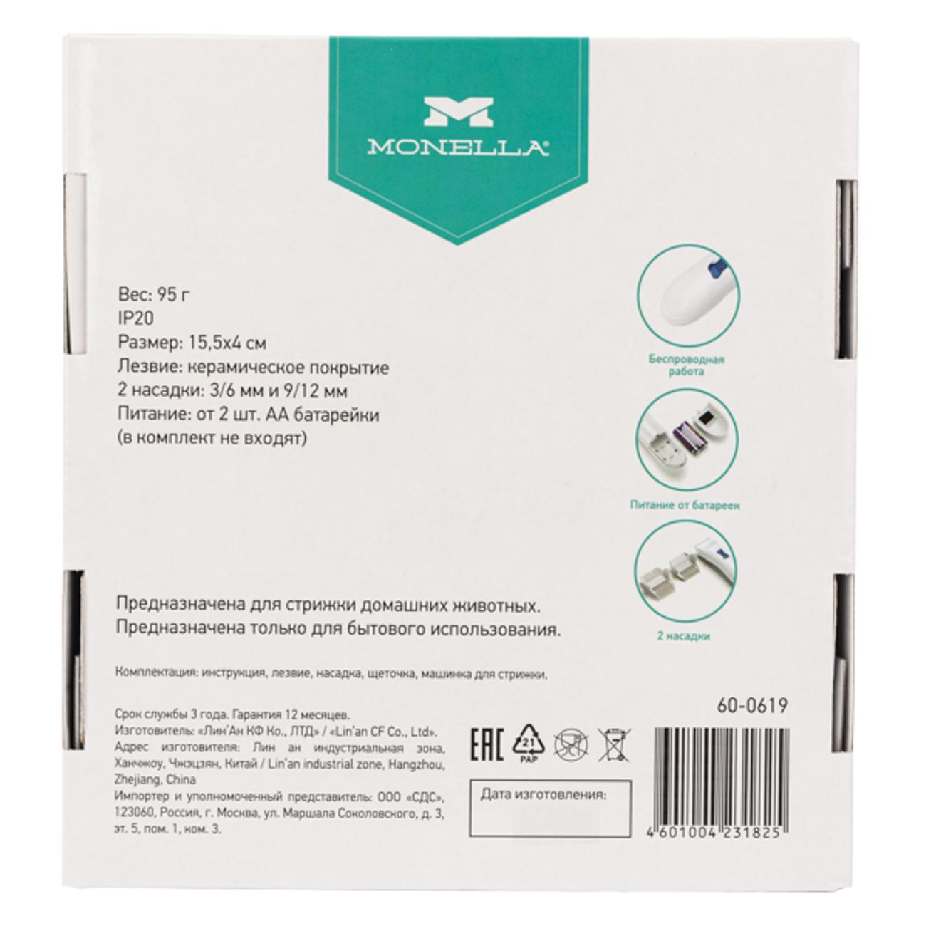 Триммер для животных Monella 60-0619 питается от двух батареек типоразмера АА. С ними можно не заряжать аккумулятор в течение долгого времени. Прибор не предназначен для профессионального использования.