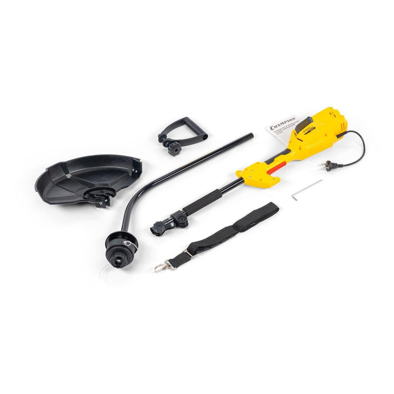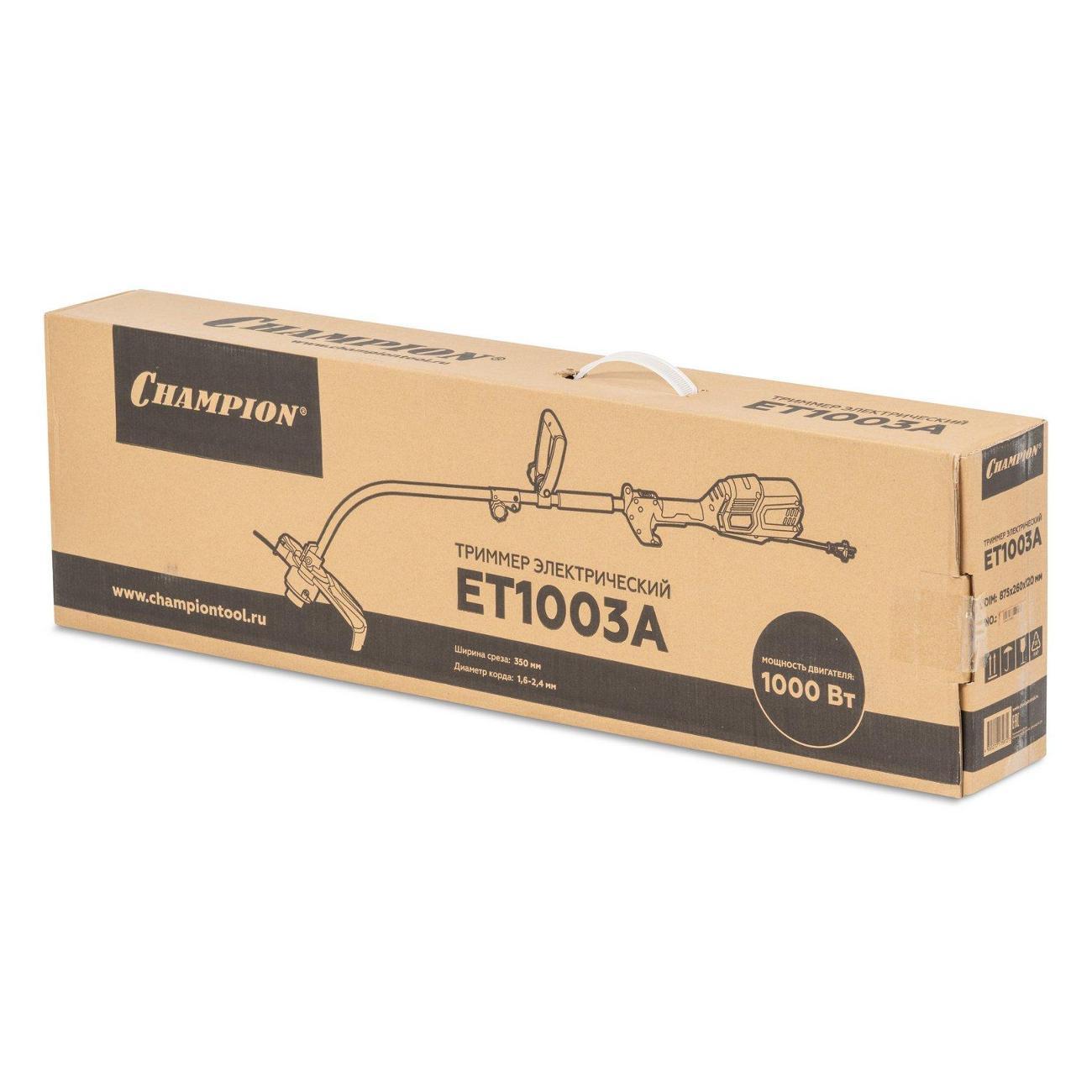 Триммер электрический Champion ET 1003 A - бытовой триммер большой мощности для средних и больших площадей площадей с грубой травой и сорняками. Рекомендуемая площадь обработки до 12-ти соток. Ручка регулируется под рост оператора. Шпуля с леской полуавтоматическая, что позволяет подавать леску нажатием об землю во время работы. Широкий защитный кожух хорошо защитит оператора от летящей травы. Благодаря наличию в комплекте наплечного ремня, снижается нагрузка на позвоночник оператора во время работы. Благодаря разъему на валу триммера, коса складывается пополам, что существенно упрощает транспортировку.