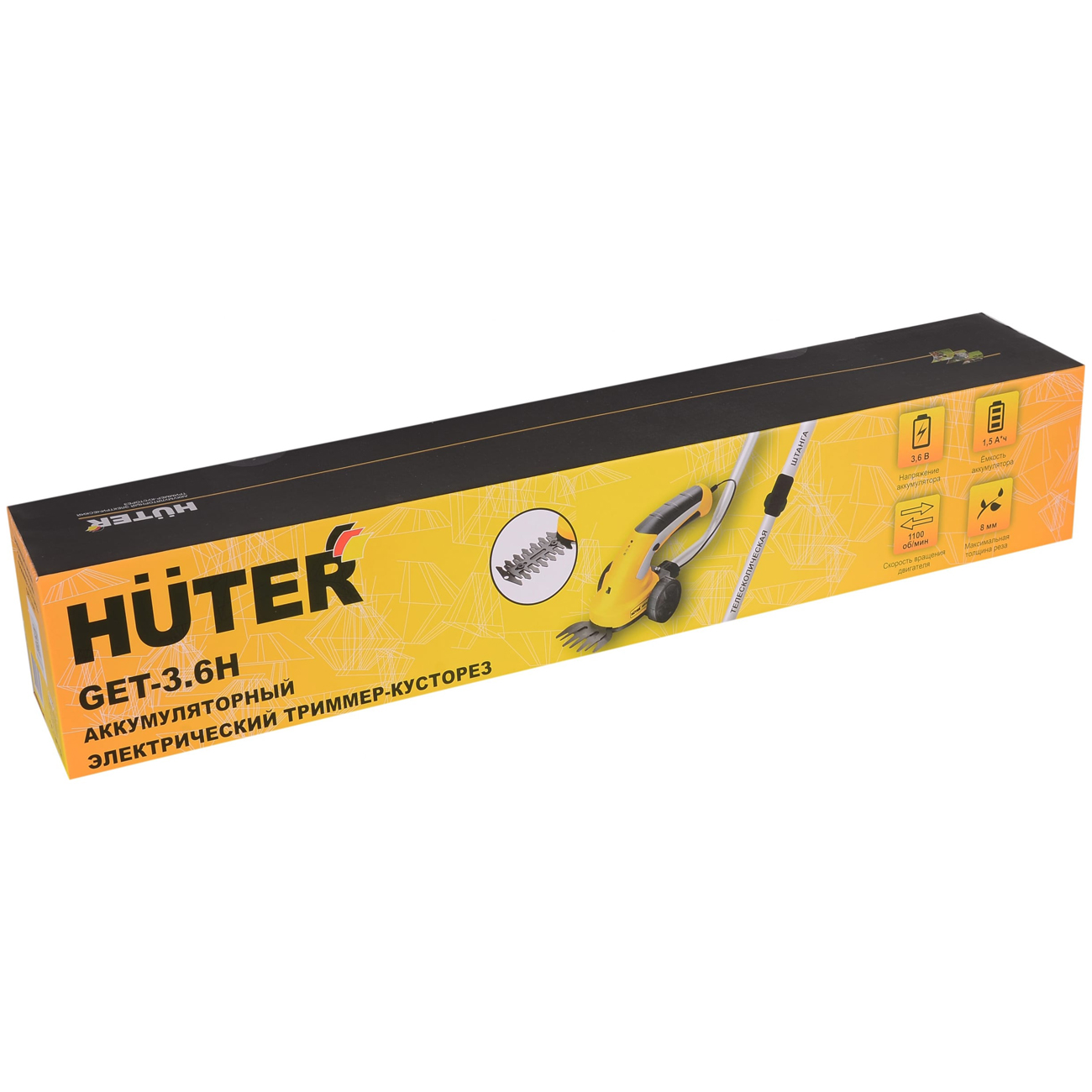 Huter GET-3,6Н — электрический триммер на ручке для кошения кустов. Питается от встроенного Li-Ion-аккумулятора емкостью 1500 мАч с напряжением 3,6 В. Время работы от аккумулятора составляет 0,5 часов. Максимальное число оборотов холостого хода — 1100 об/мин. Диаметр реза достигает 8 мм.