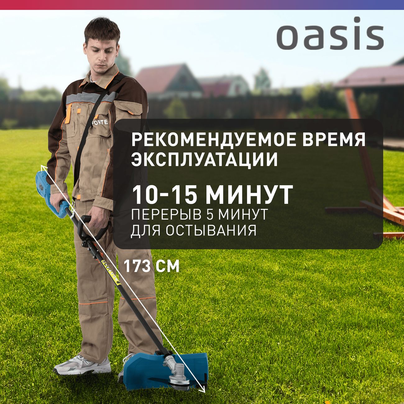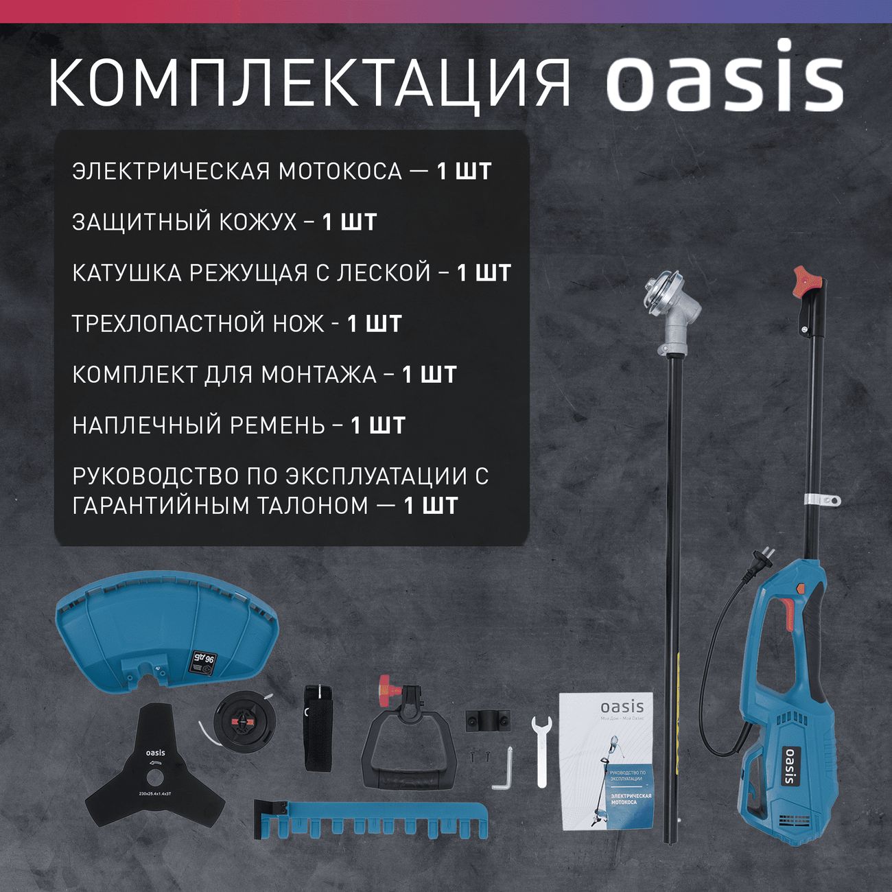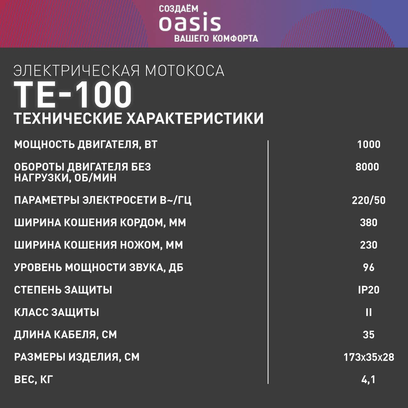 Oasis TE-100 — электрическая мотокоса. Двигатель мощностью 1000 Вт выдаёт 8000 об/мин на холостом ходу.