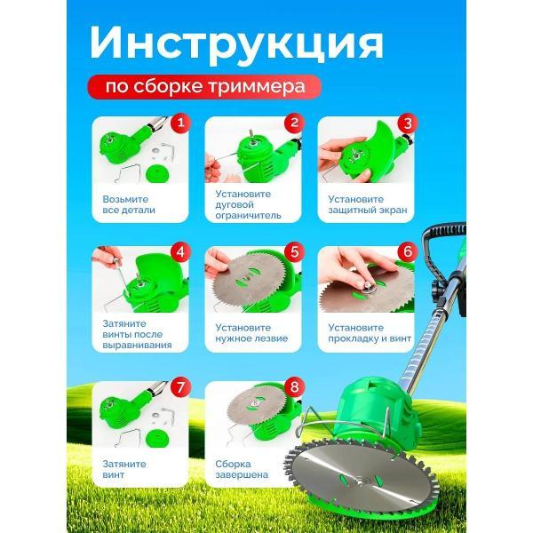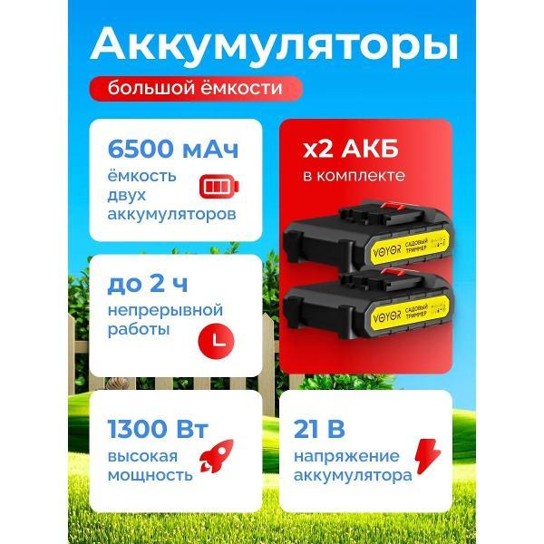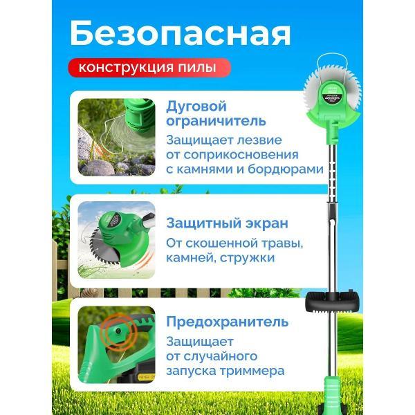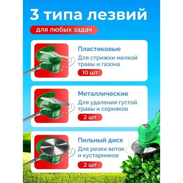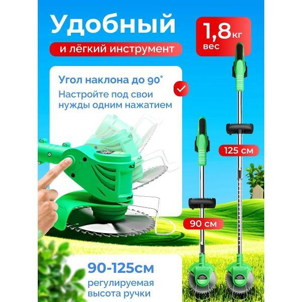 Аккумуляторный триммер - это идеальный инструмент для вашего сада, будь то стрижка газона, подрезка травы или веток кустов. Наш садовый триммер с частотой вращения шпинделя 25000 оборотов в минуту оснащен тремя видами насадок: 10 пластиковыми лезвиями для стрижки газона, 2 металлическими ножами для удаления сорняков и 2 круглыми пильными дисками для удаления кустарников и веток. Устройство дополнено защитным металлическим ограничителем. Он защищает триммер от повреждения твердыми предметами на земле. Прибор оснащен возможностью регулировки высоты и угла скоса, системой быстрой зарядки. Прибор способен спилить ветки до 7 см в диаметре, что позволит вам легко поддерживать порядок в вашем саду. Рукоятка с комфортной ручкой позволяет легко использовать косилку как на небольших участках, так и на больших газонах, а телескопическая штанга регулируется, что позволяет использовать технику людям с любым ростом. Режущая головка вращается, с ней вы легко сможете скосить траву, которая растет вплотную у забора или бордюра, оформить садовую дорожку или клумбу. Газонокосилка работает от аккумулятора Li-lon. Мощность устройства 1300 Вт. Примерная продолжительность работы от полностью заряженной батареи - 40 минут. В комплектации два аккумулятора, а значит вы сможете увеличить время работы при необходимости. Наш триммер легкий, весом 1.8 кг, его несложно переносить. С беспроводным устройством удобно работать везде, где это потребуется и вам не придется беспокоиться о расположении розетки или о мешающихся под ногами во время работы шнурами. Садовый кусторез с мощным аккумулятором способен срезать даже самую жесткую поросль. Модель идеально подходит для стрижки газонов, а также подрезки кустарников и живых изгородей. Мощный двигатель мотокосы позволит вам без проблем избавляться от высокой травы и сорняков, чтобы ваш двор, сад и огород на участке у дома или на даче выглядели наилучшим образом. Универсальный дачный инвентарь - кромкорез отлично подходит для завершения ухода за газоном или поддержания свежего вида клумб. Комплект включает: триммер, 10 пластиковых лезвий, 2 металлических лезвия, 2 пильных диска, 2 аккумулятора на 21В, 1 зарядное устройство, 1 ручку, коробку и инструкцию на русском языке. У нас есть акции и распродажи, вы можете купить наши товары в подарок со скидкой!