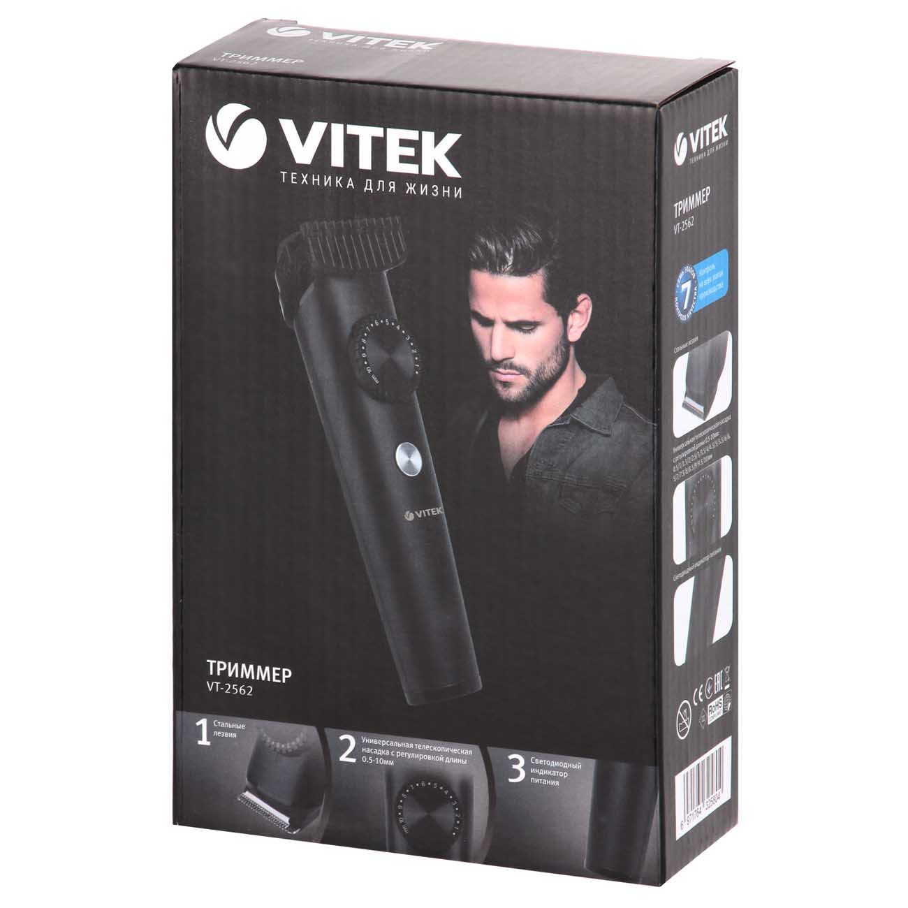 Vitek VT-2562 – компактный триммер, предназначенный для ухода за усами и бородой. Он оснащён стальными лезвиями, которые быстро и ровно срезают даже жёсткие волоски.