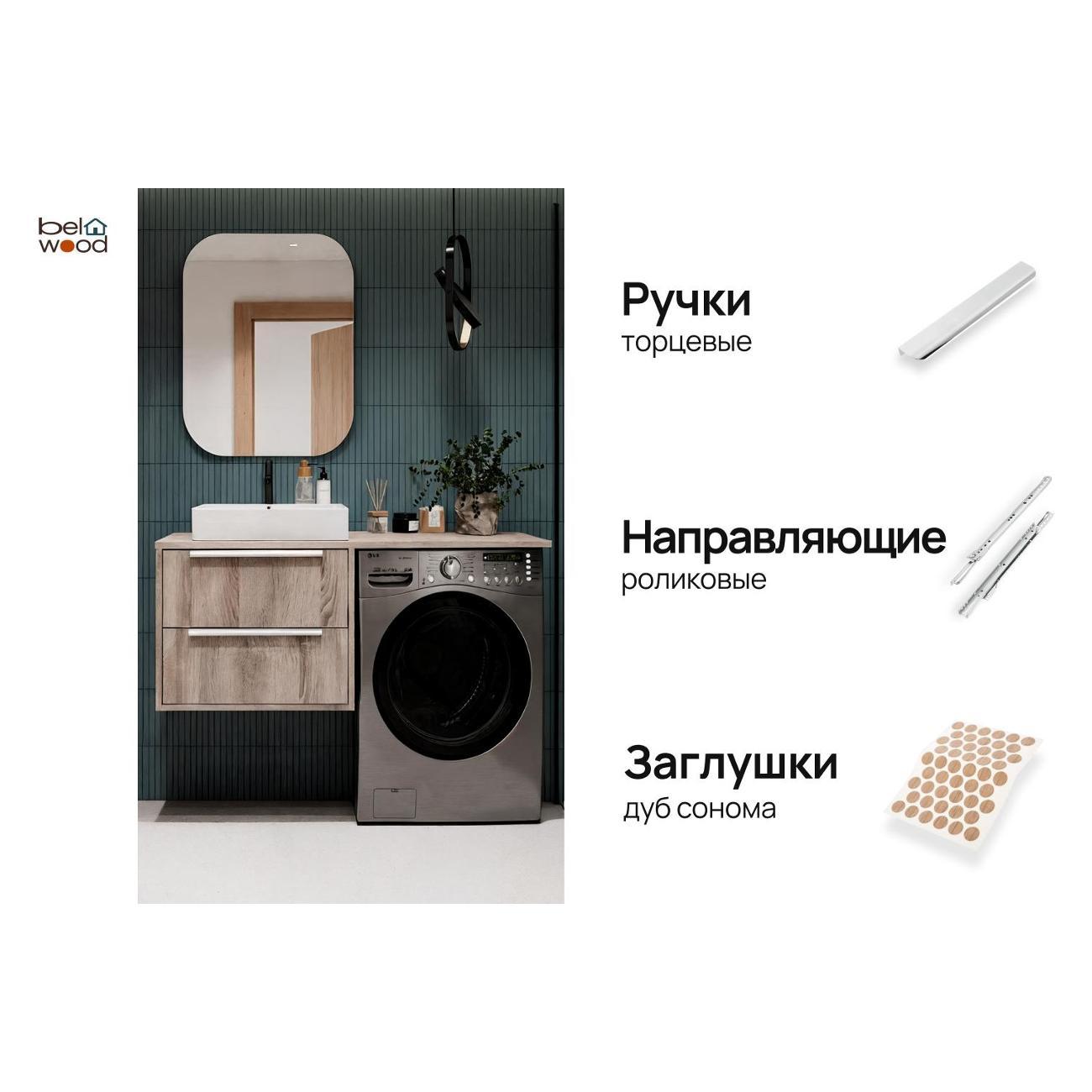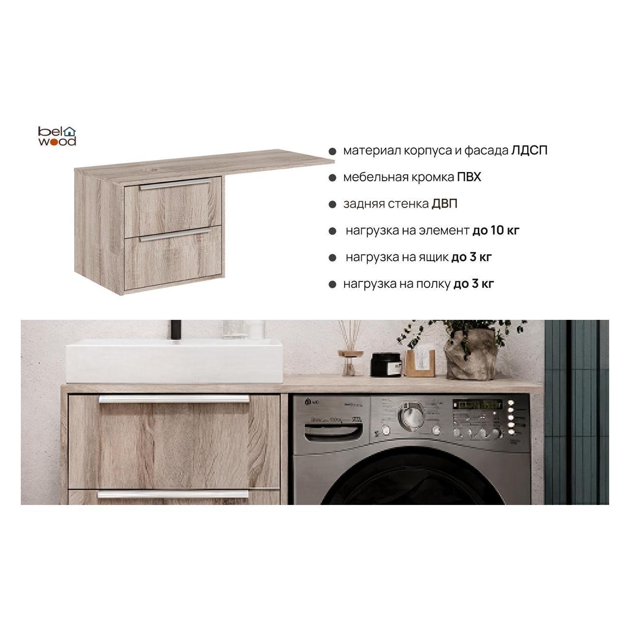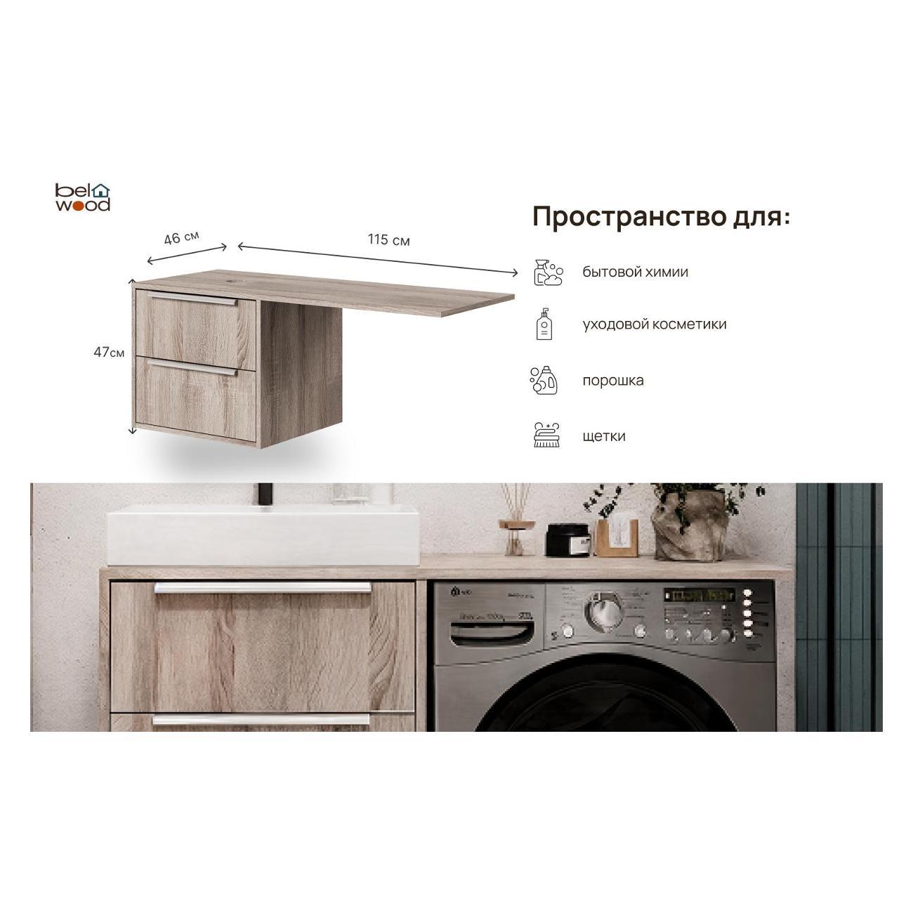 Модель оснащена двумя выдвижными ящиками, обеспечивающими удобный доступ к хранению всех необходимых принадлежностей. Столешницу тумбы можно установить над стиральной машиной, что позволяет рационально использовать пространство и особенно удобно для небольших ванных комнат.
