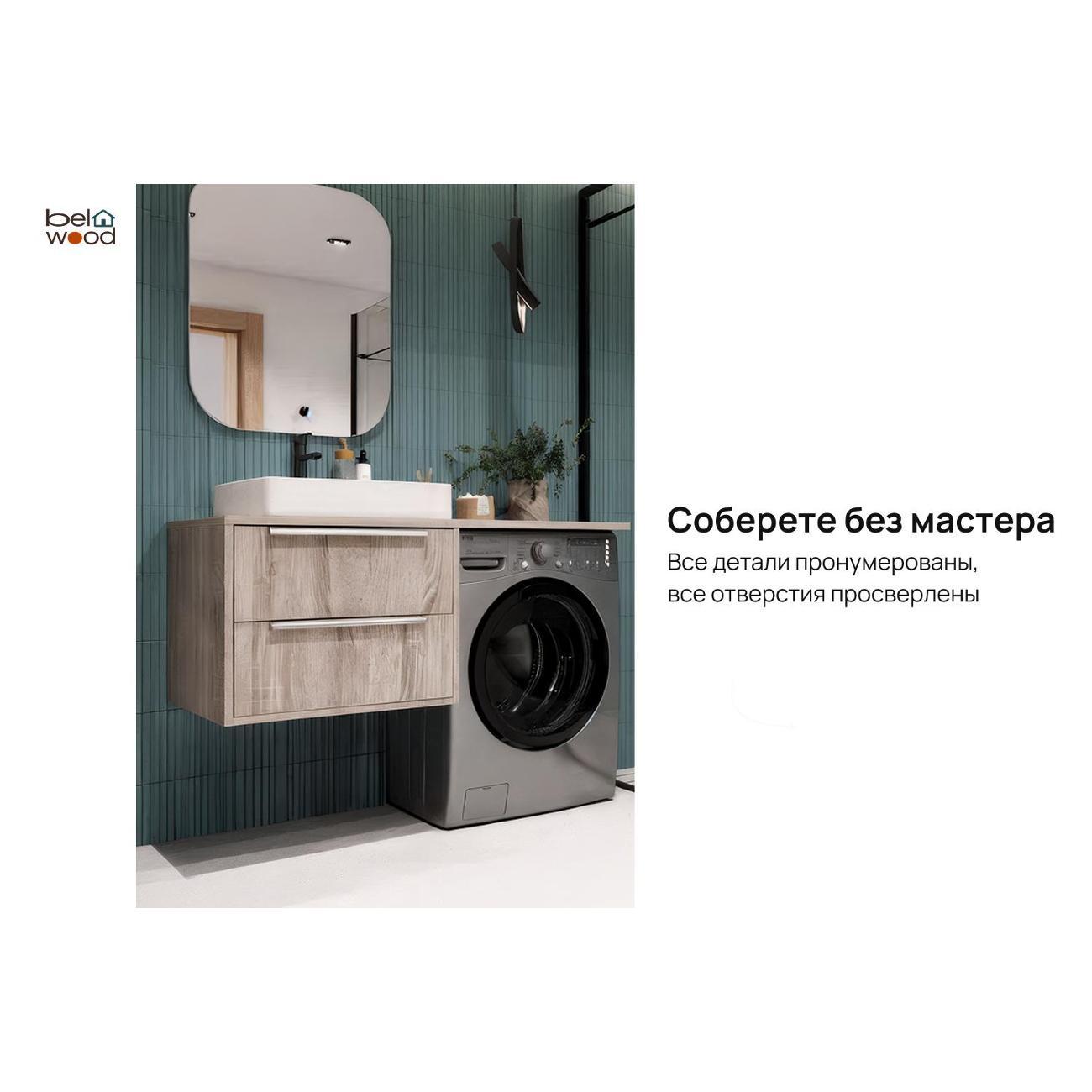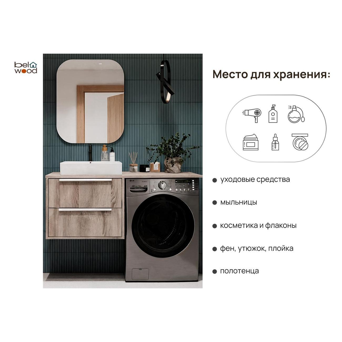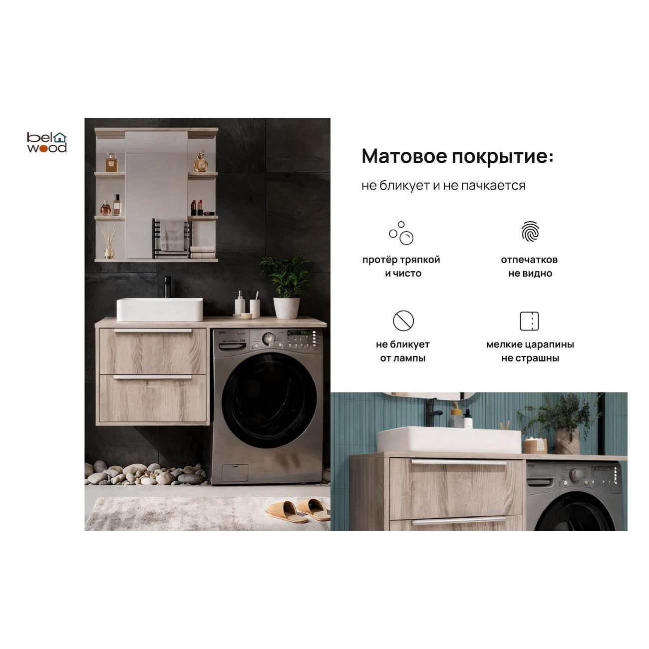 Модель оснащена двумя выдвижными ящиками, обеспечивающими удобный доступ к хранению всех необходимых принадлежностей. Столешницу тумбы можно установить над стиральной машиной, что позволяет рационально использовать пространство и особенно удобно для небольших ванных комнат.
