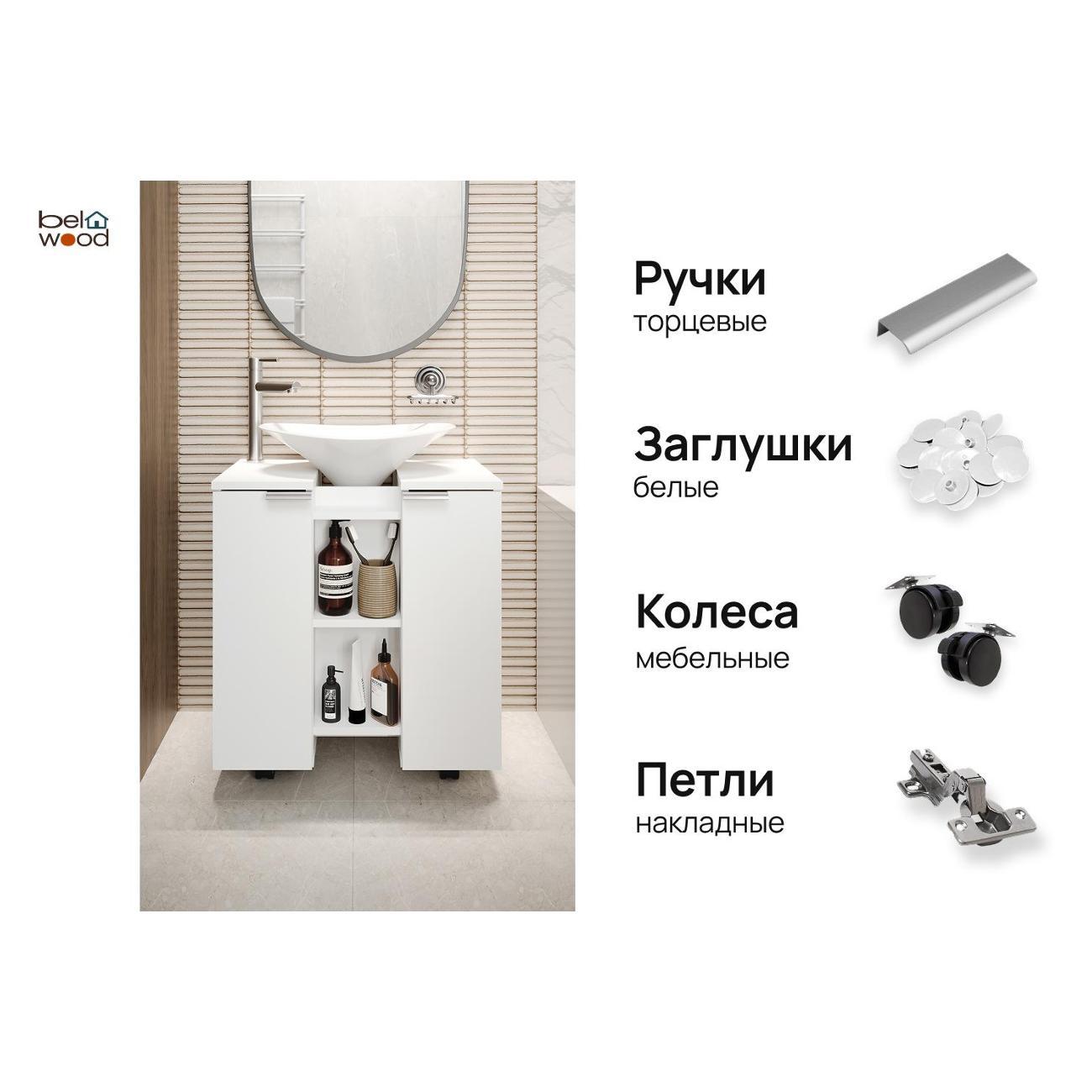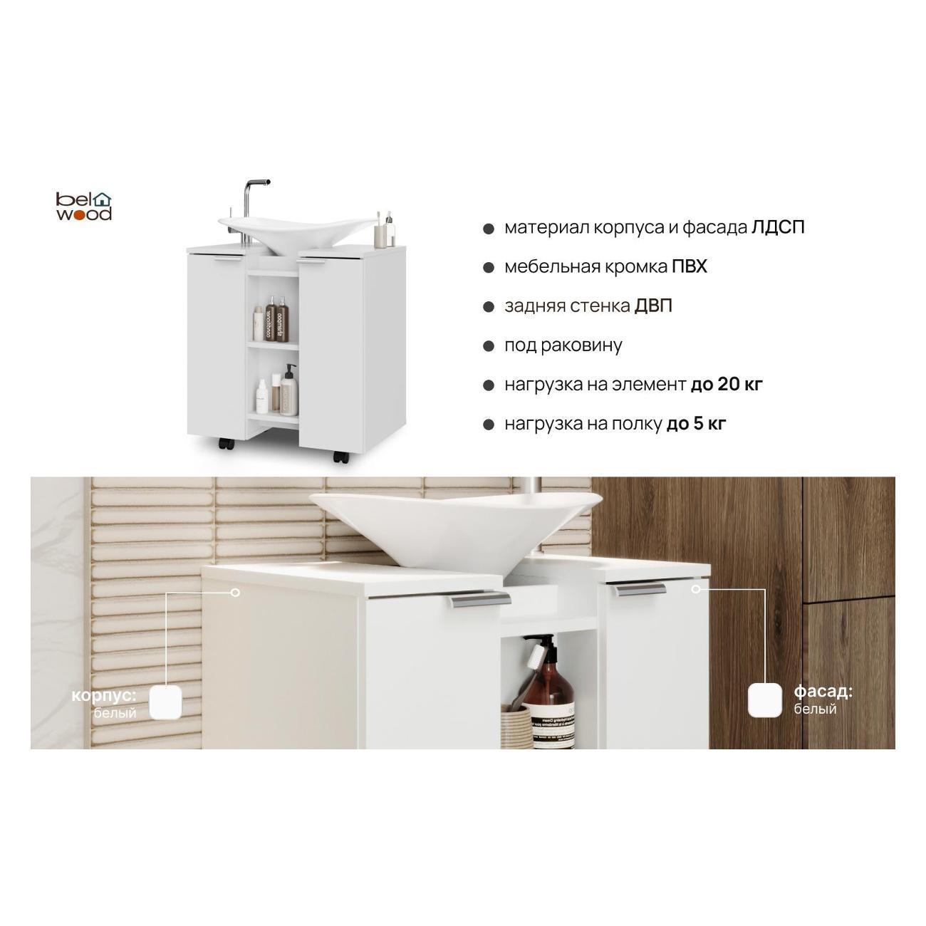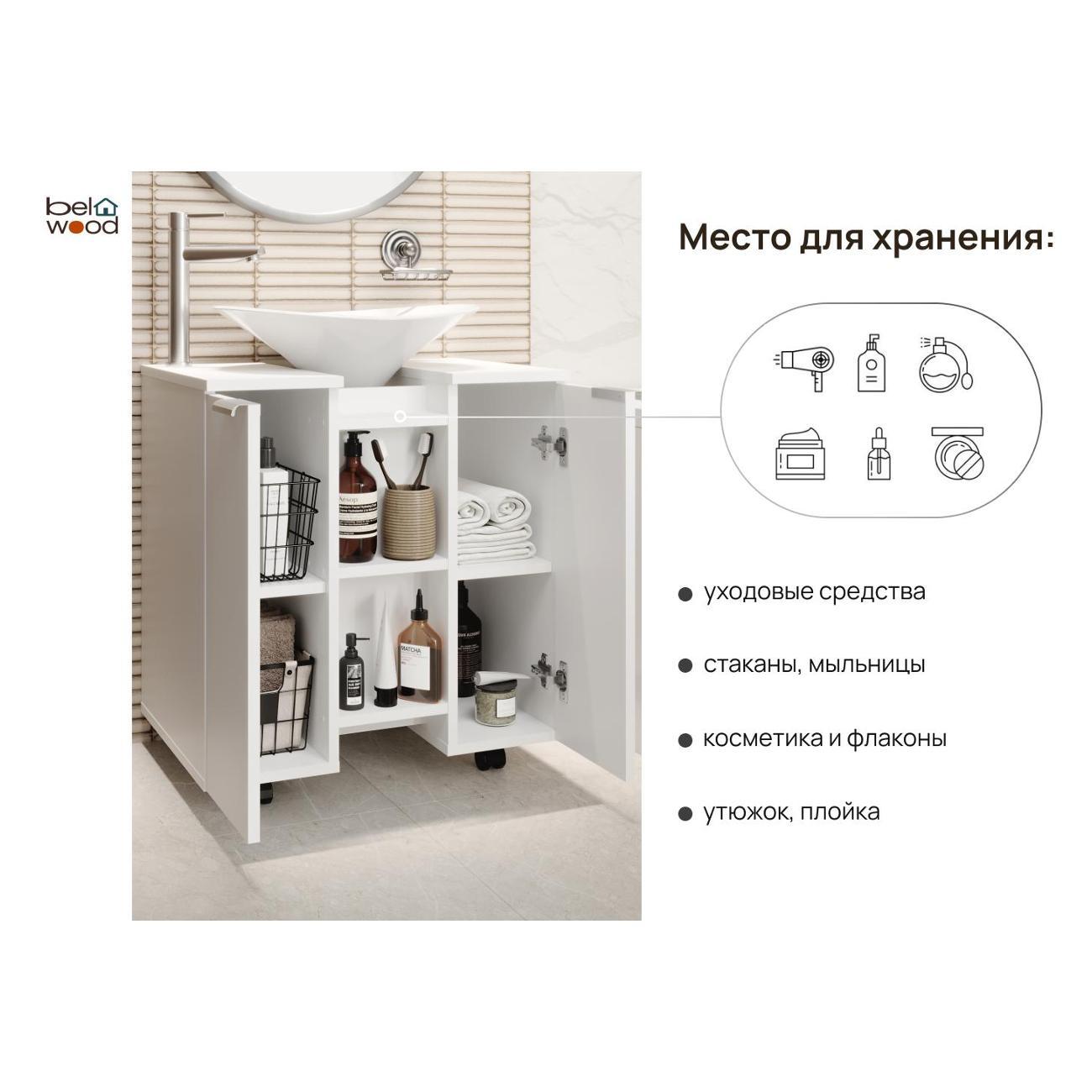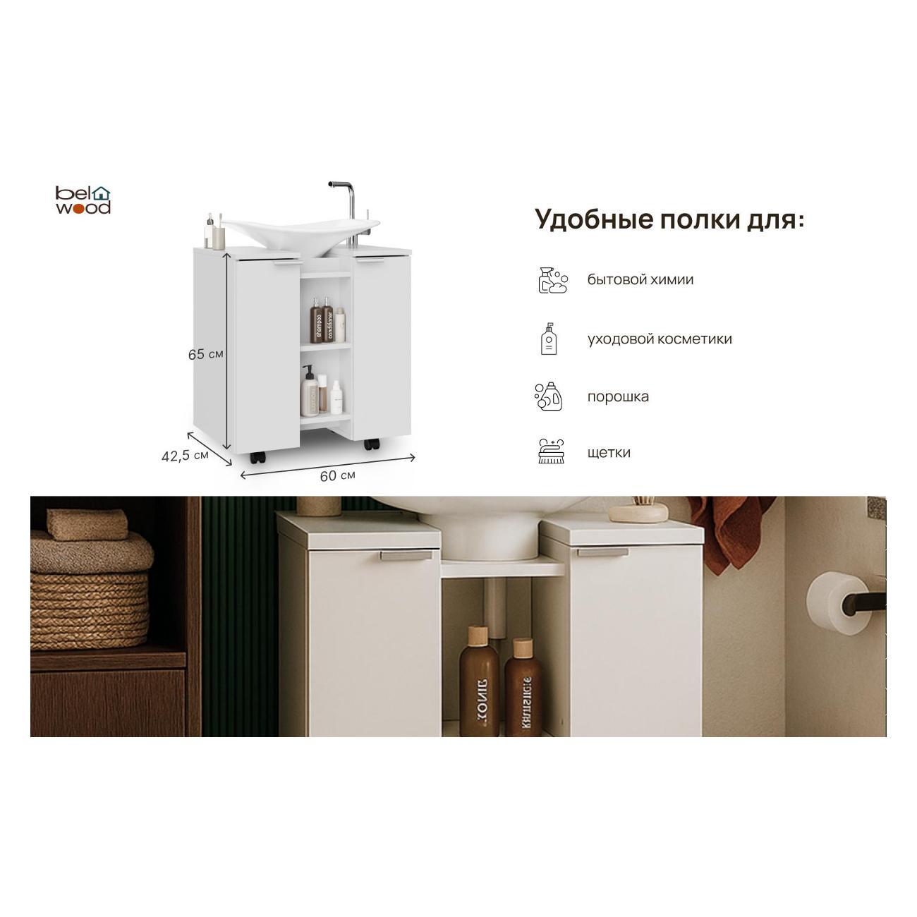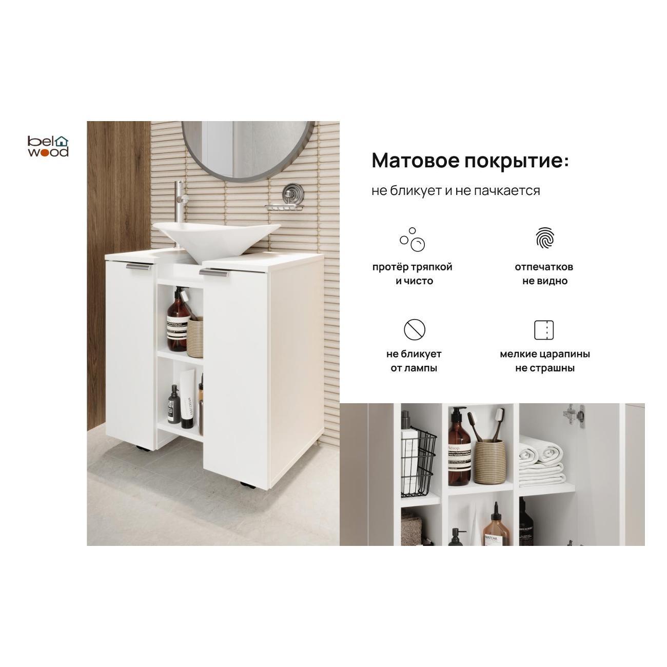 Тумба под раковину изготовлена из качественного ЛДСП с износостойкой ABS-кромкой, что обеспечивает долговечность, устойчивость к влаге и повседневным нагрузкам. Продуманная система хранения включает три отделения, позволяющие удобно разместить средства гигиены, бытовые принадлежности и аксессуары с быстрым доступом.