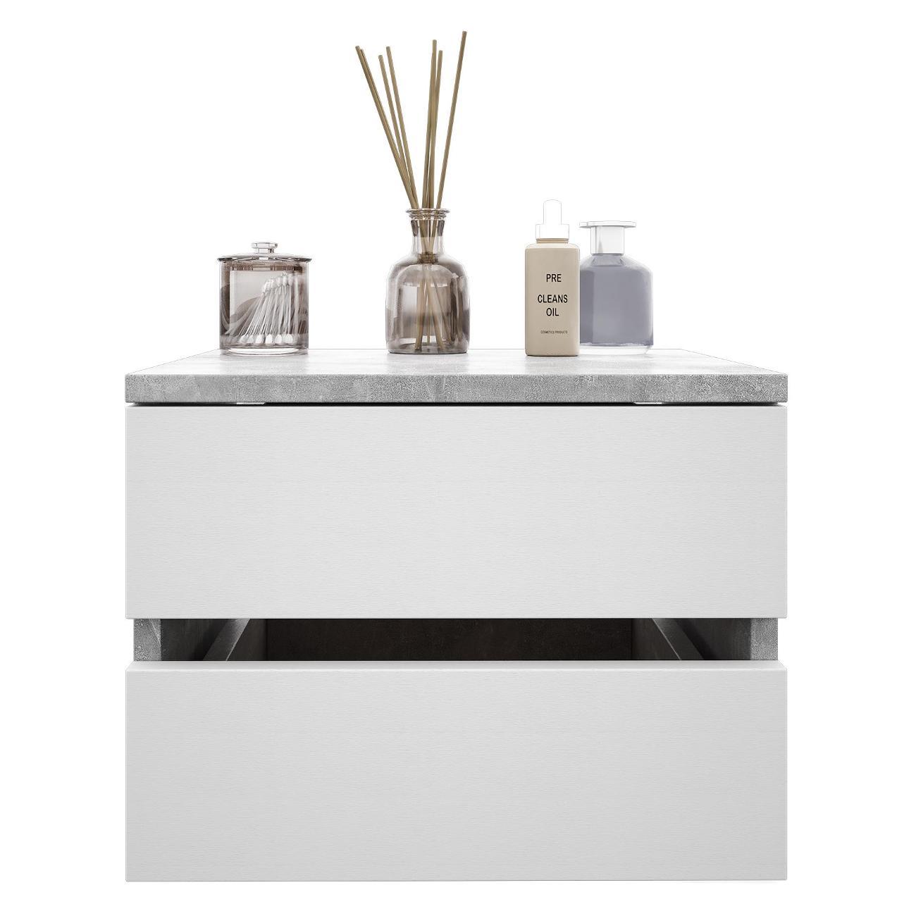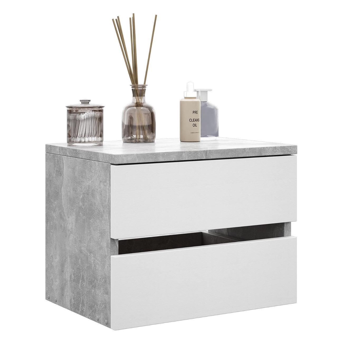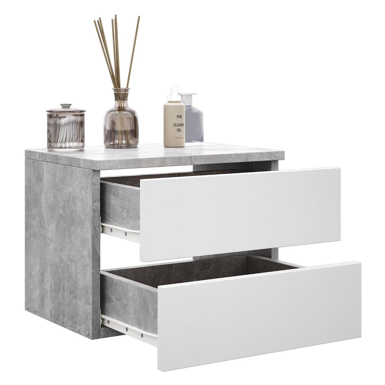 Компактные размеры (высота 28,7 см, глубина 27,2 см, ширина 37,4 см) позволяют удобно разместить изделие в различных помещениях. Два выдвижных ящика на роликовых направляющих открываются без ручки через вырез в фасаде, что обеспечивает современный и минималистичный вид.