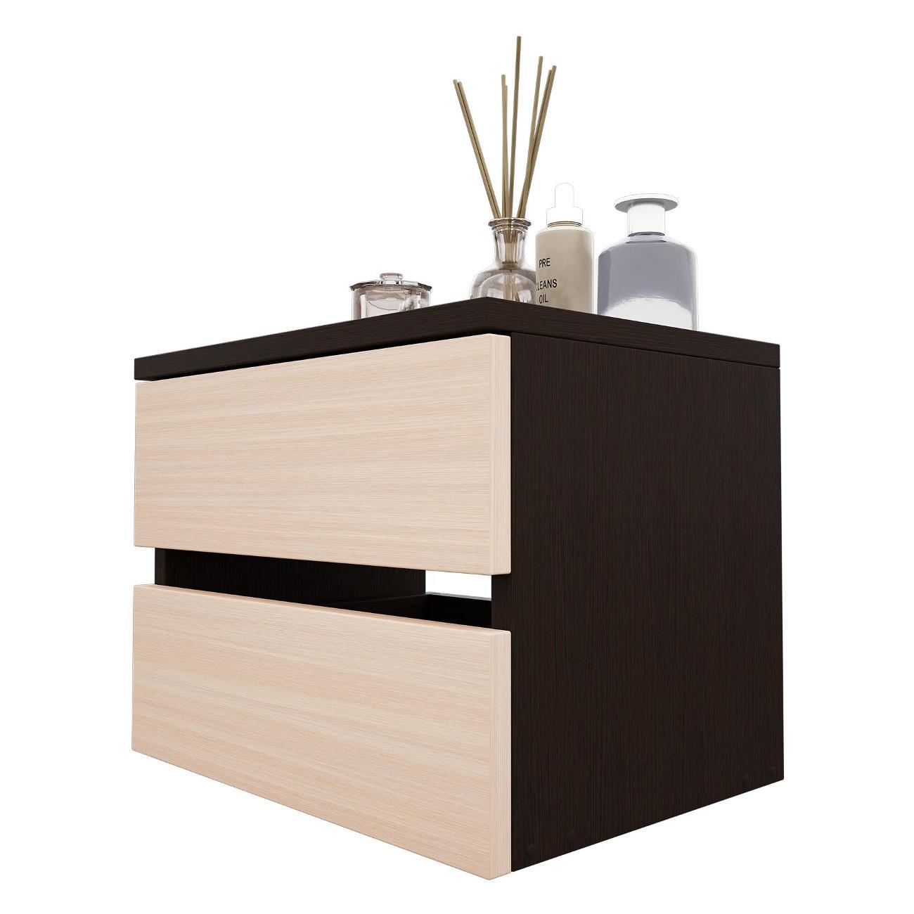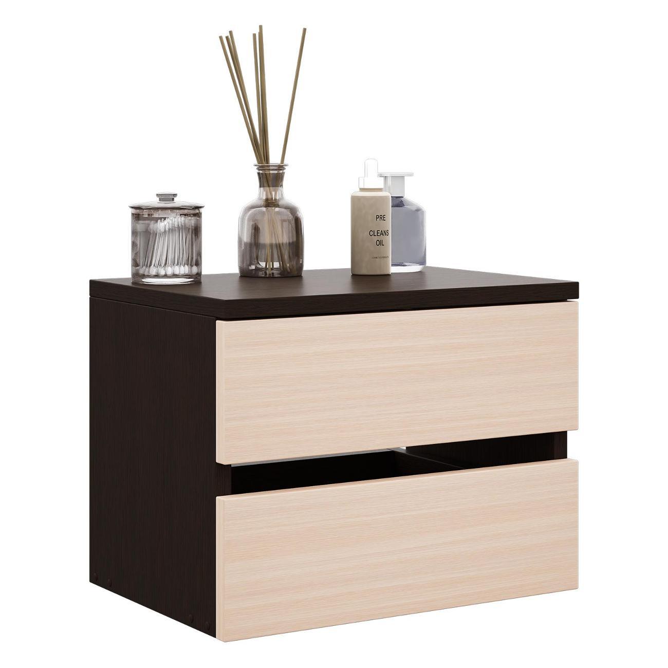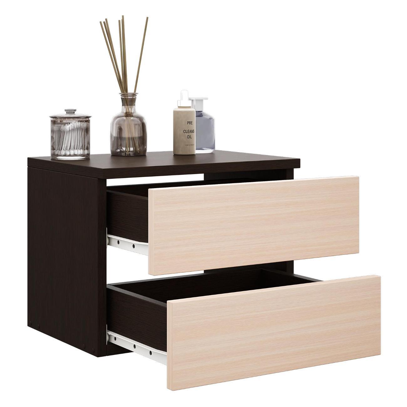 Компактные размеры (высота 28,7 см, глубина 27,2 см, ширина 37,4 см) позволяют удобно разместить изделие в различных помещениях. Два выдвижных ящика на роликовых направляющих открываются без ручки через вырез в фасаде, что обеспечивает современный и минималистичный вид.