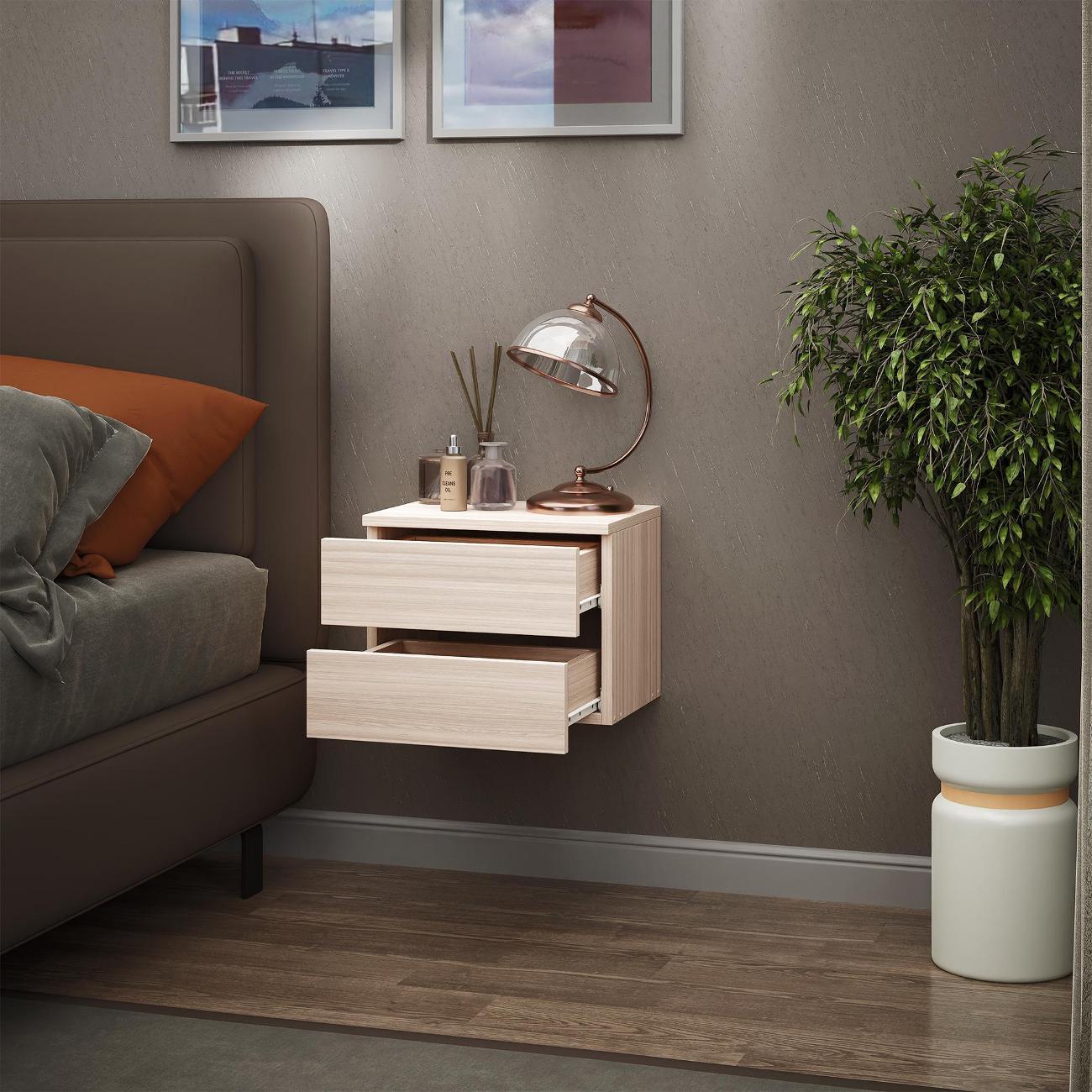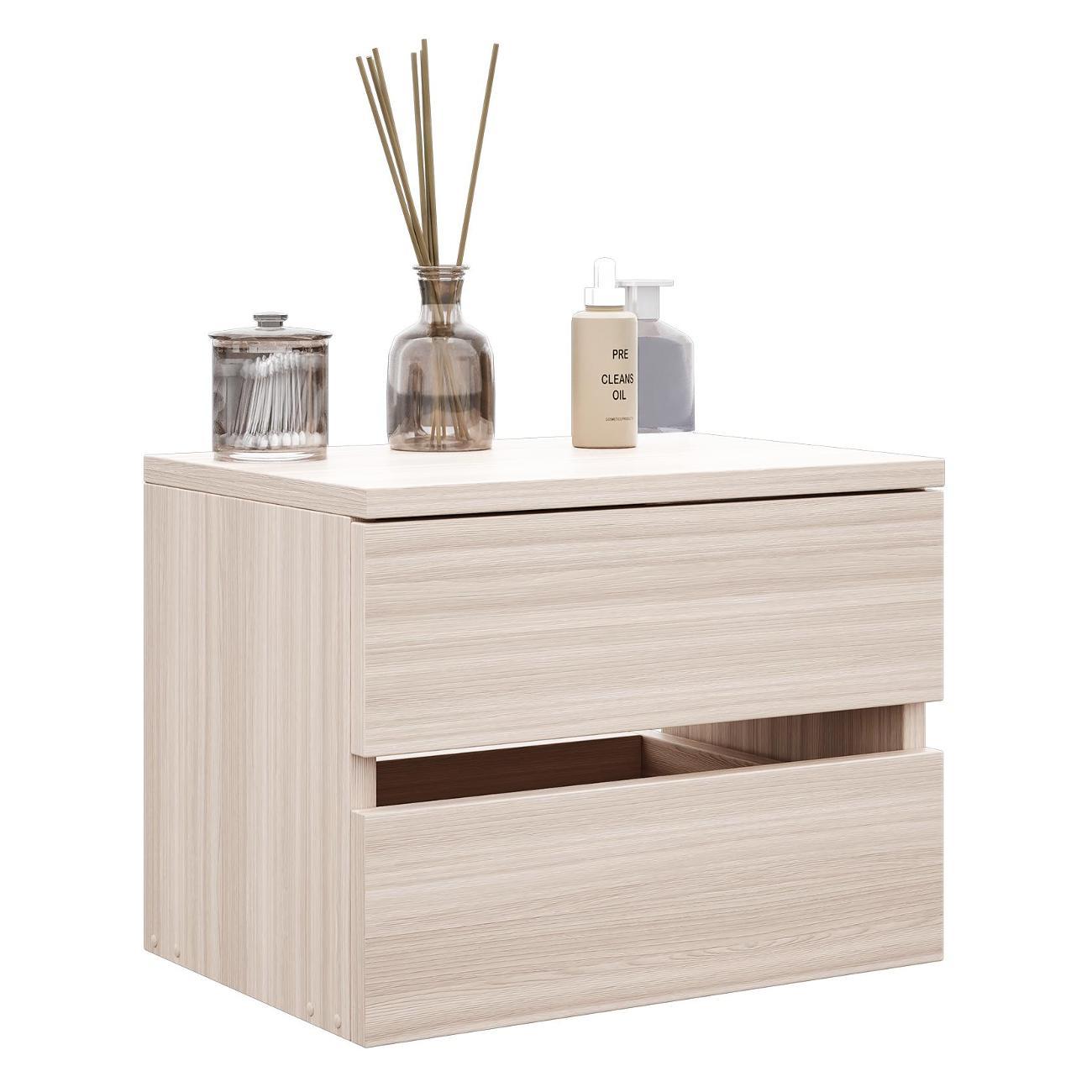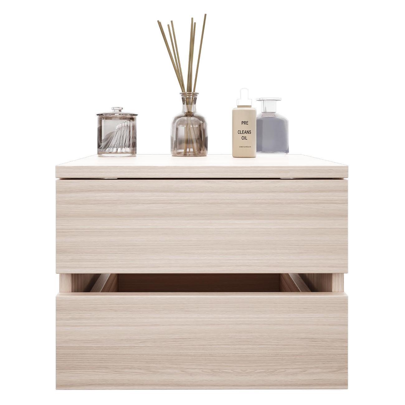 Компактные размеры (высота 28,7 см, глубина 27,2 см, ширина 37,4 см) позволяют удобно разместить изделие в различных помещениях. Два выдвижных ящика на роликовых направляющих открываются без ручки через вырез в фасаде, что обеспечивает современный и минималистичный вид.