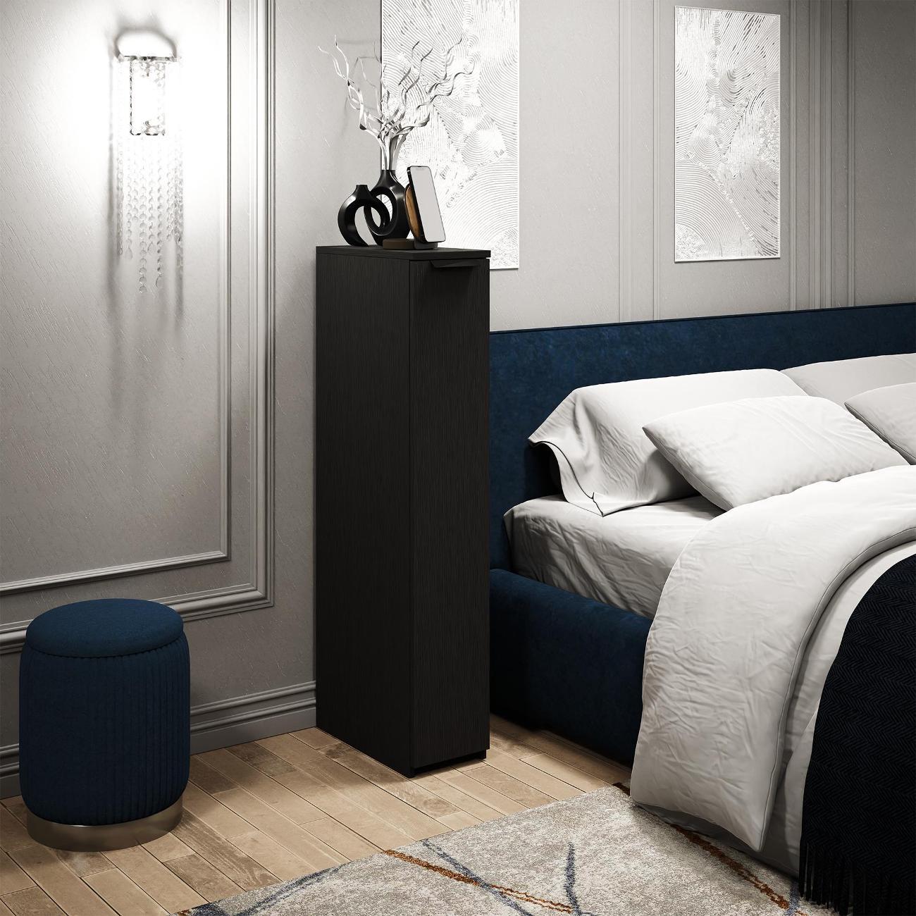 Напольная тумба в узком формате — это практичное решение для организации пространства. Модель «Витто-159» от бренда MFMaster отличается компактными размерами: высота составляет 110,8 см, ширина — 20,3 см, глубина — 40,4 см. Изготовление из ламинированного ДСП гарантирует прочность и долговечность.