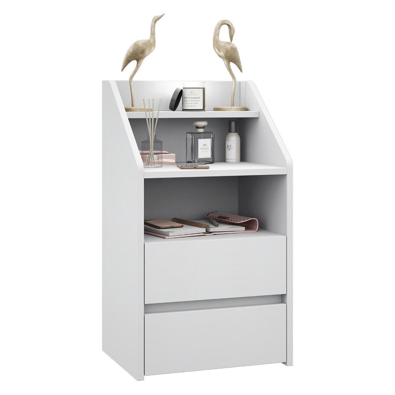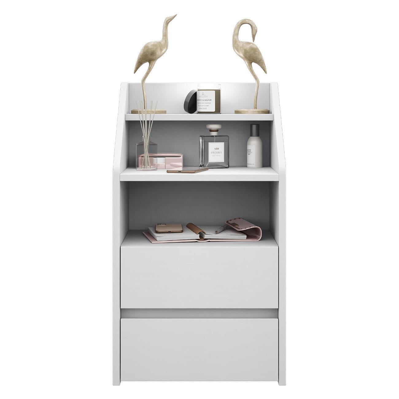 Представлена прикроватная тумба с двумя ящиками, нишей и полкой — функциональный элемент мебели для спальни, детской или гостиной.