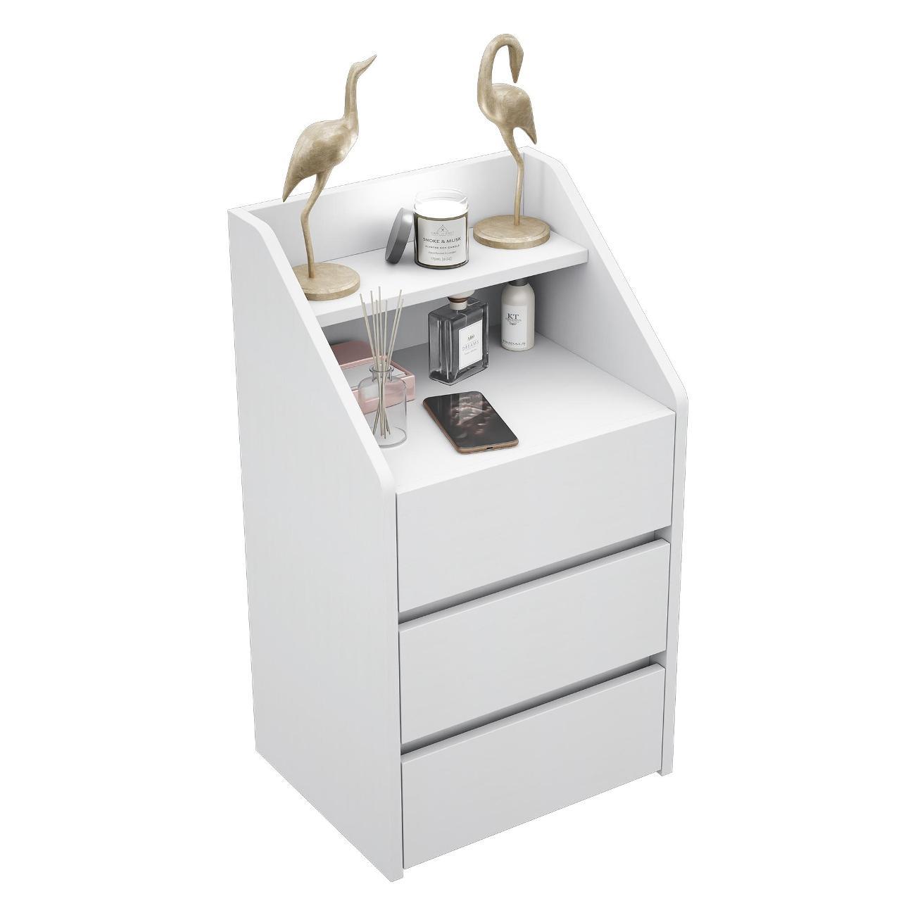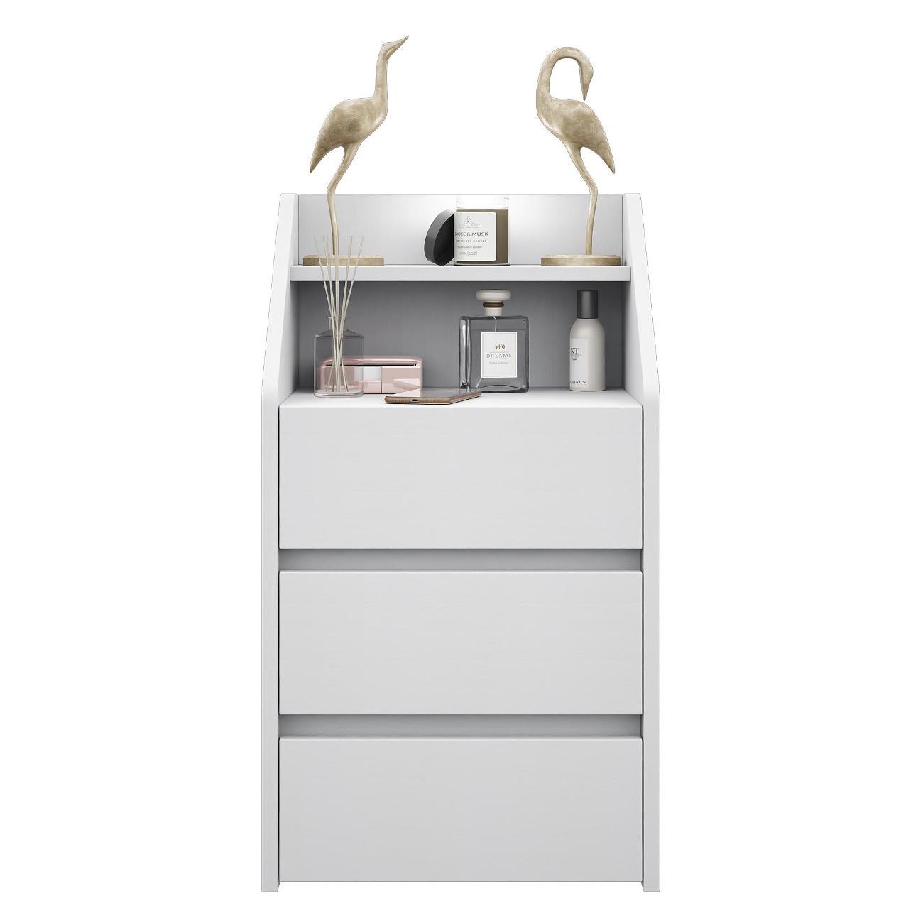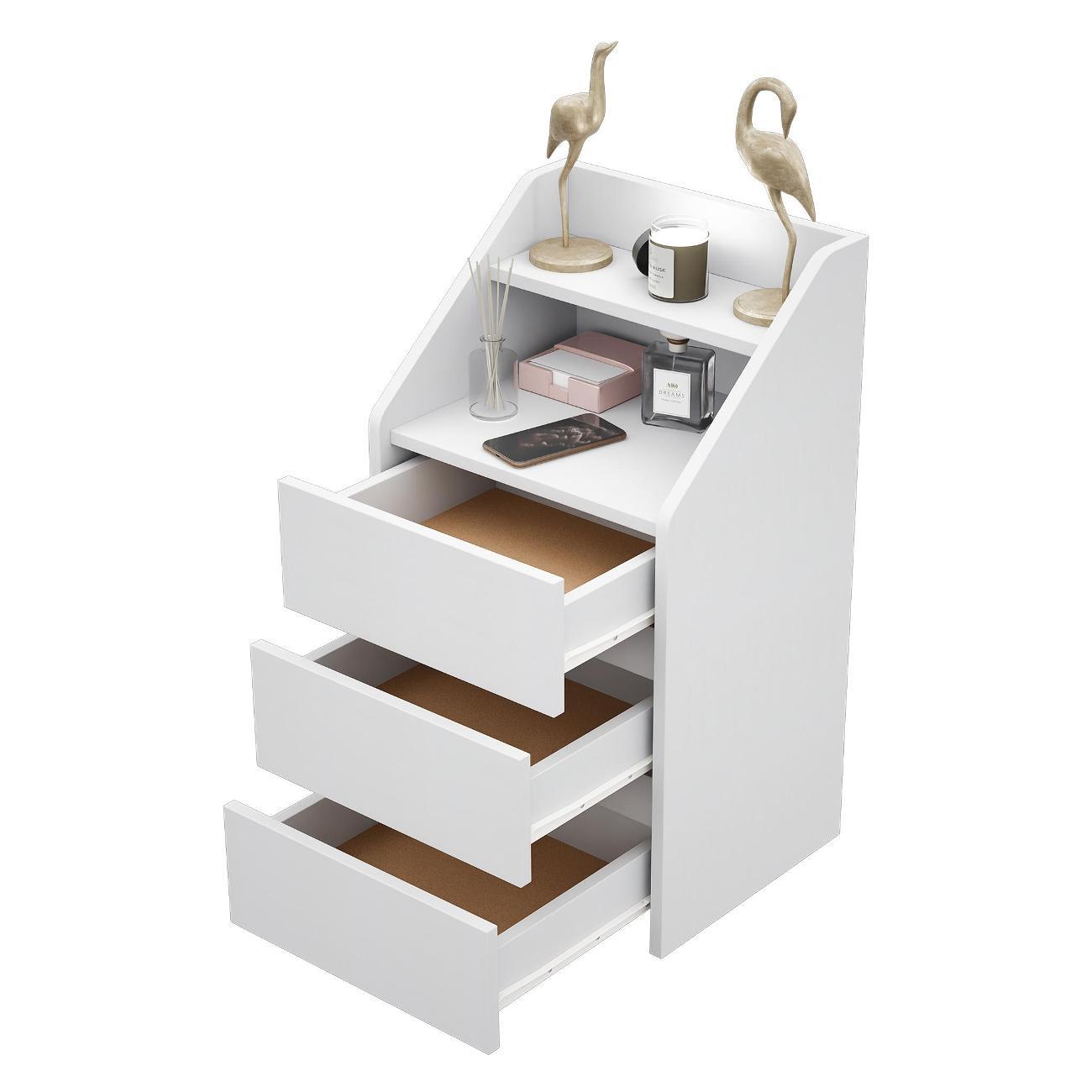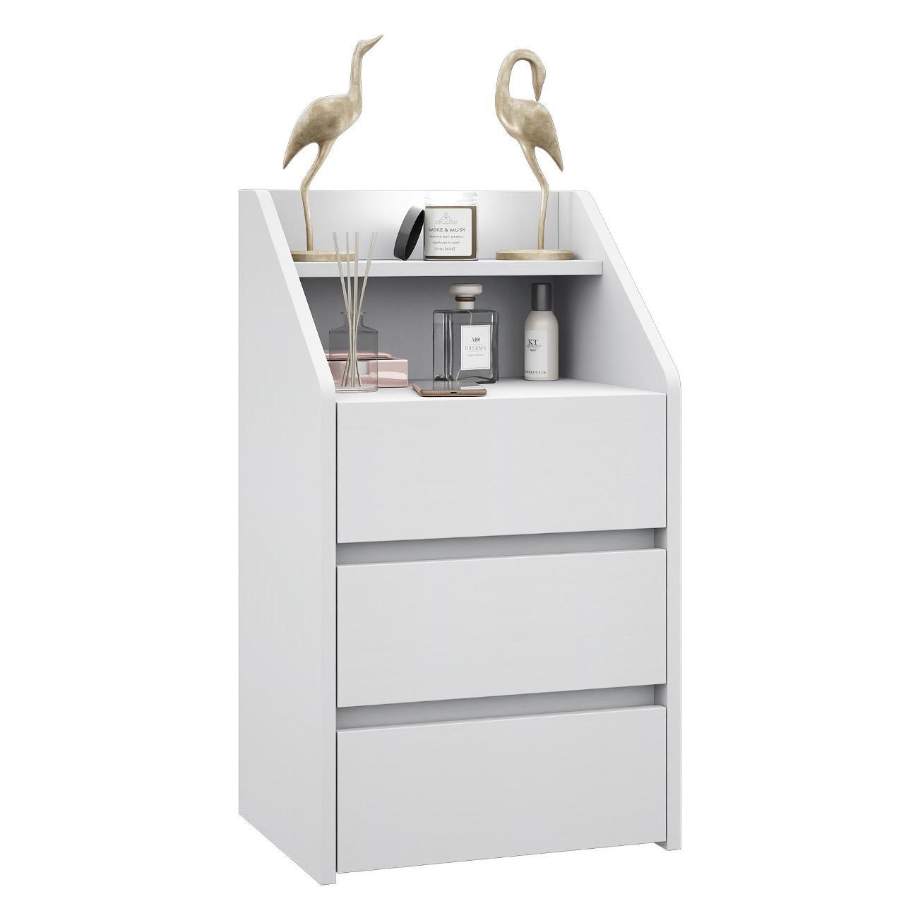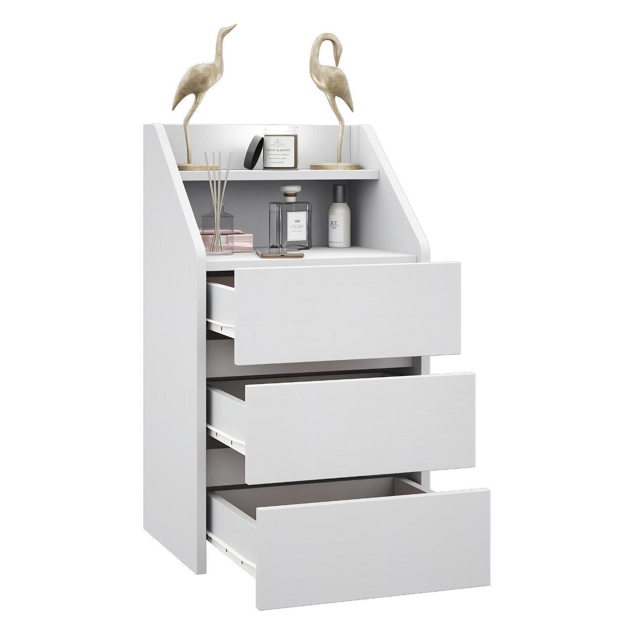 Функциональность: Три вместительных ящика идеально подходят для хранения косметики, аксессуаров и мелочей. Открытая ниша и полка позволяют разместить книги, декоративные элементы или лампу.