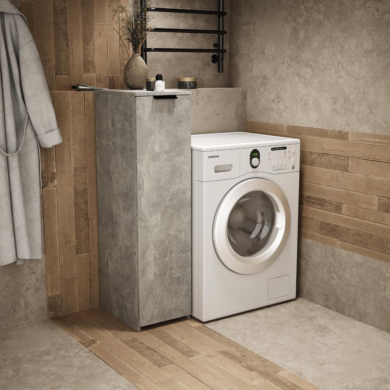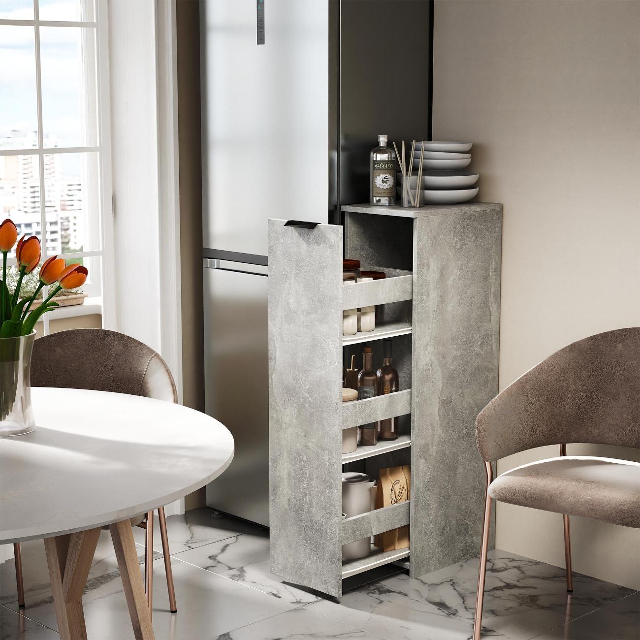 Тумбочка оснащена выкатной секцией с тремя полочками, что позволяет удобно хранить различные предметы. Она идеально подходит для ванной комнаты или туалета, где можно разместить моющие средства, туалетную бумагу и косметику. На кухне устройство удобно использовать для хранения сыпучих продуктов, специй и кухонных принадлежностей.