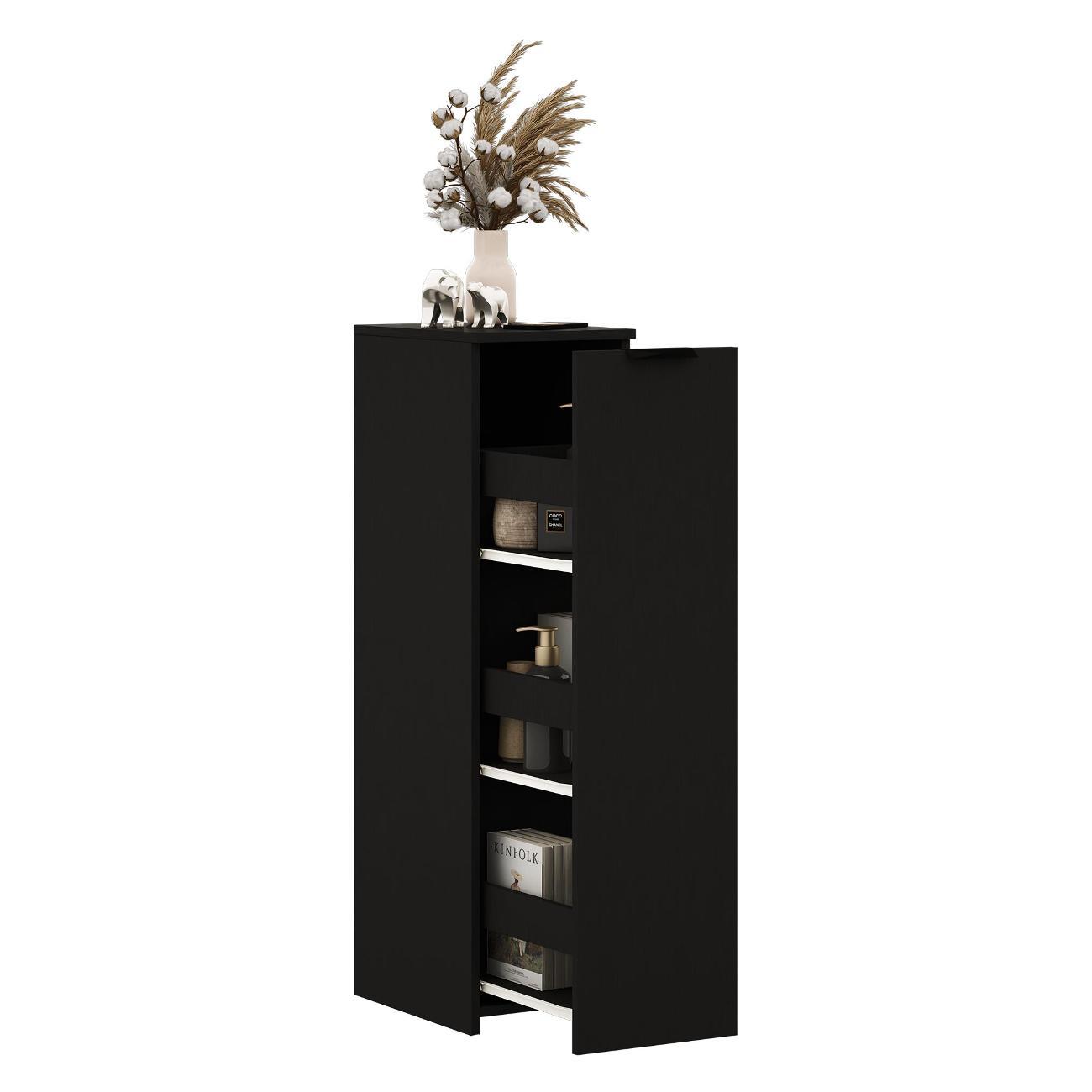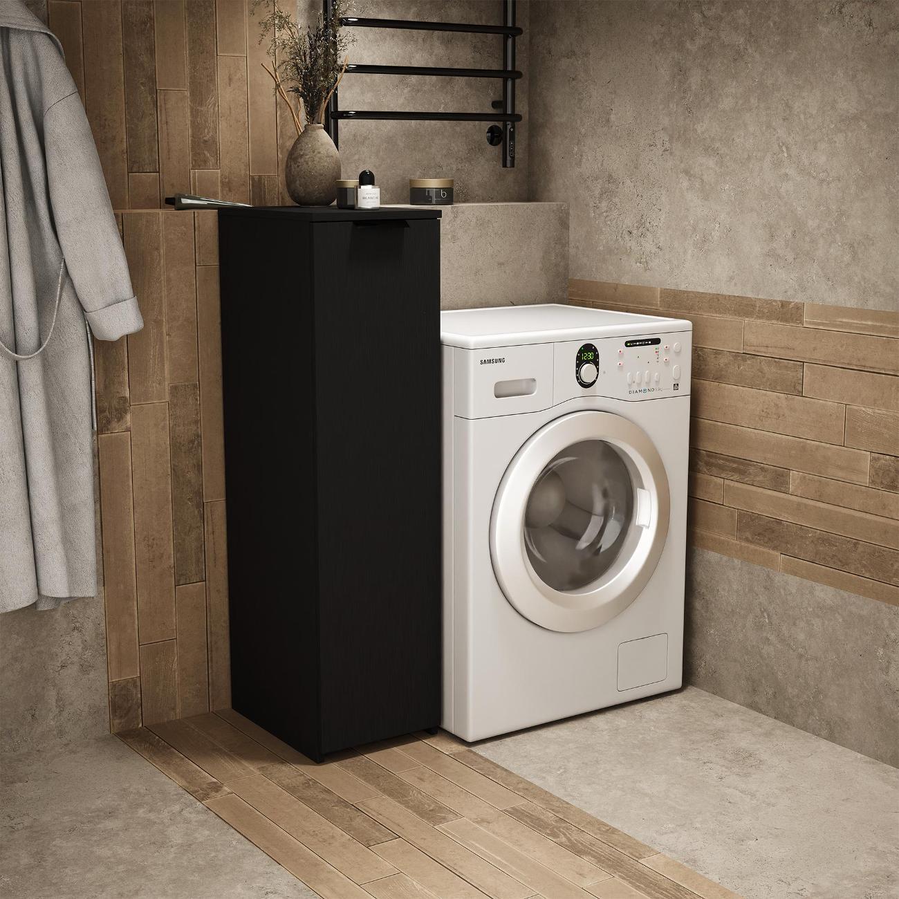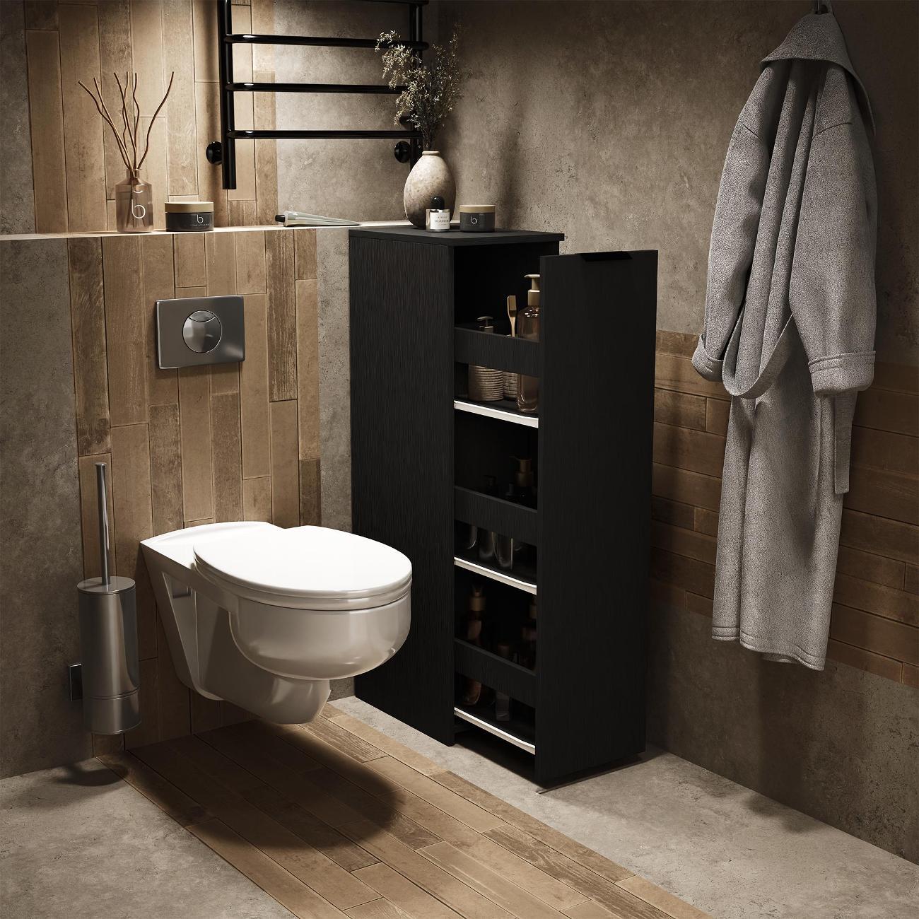 Тумбочка оснащена выкатной секцией с тремя полочками, что позволяет удобно хранить различные предметы. Она идеально подходит для ванной комнаты или туалета, где можно разместить моющие средства, туалетную бумагу и косметику. На кухне устройство удобно использовать для хранения сыпучих продуктов, специй и кухонных принадлежностей.