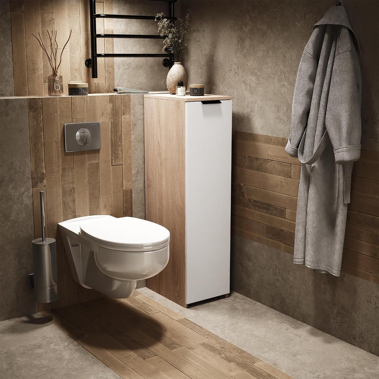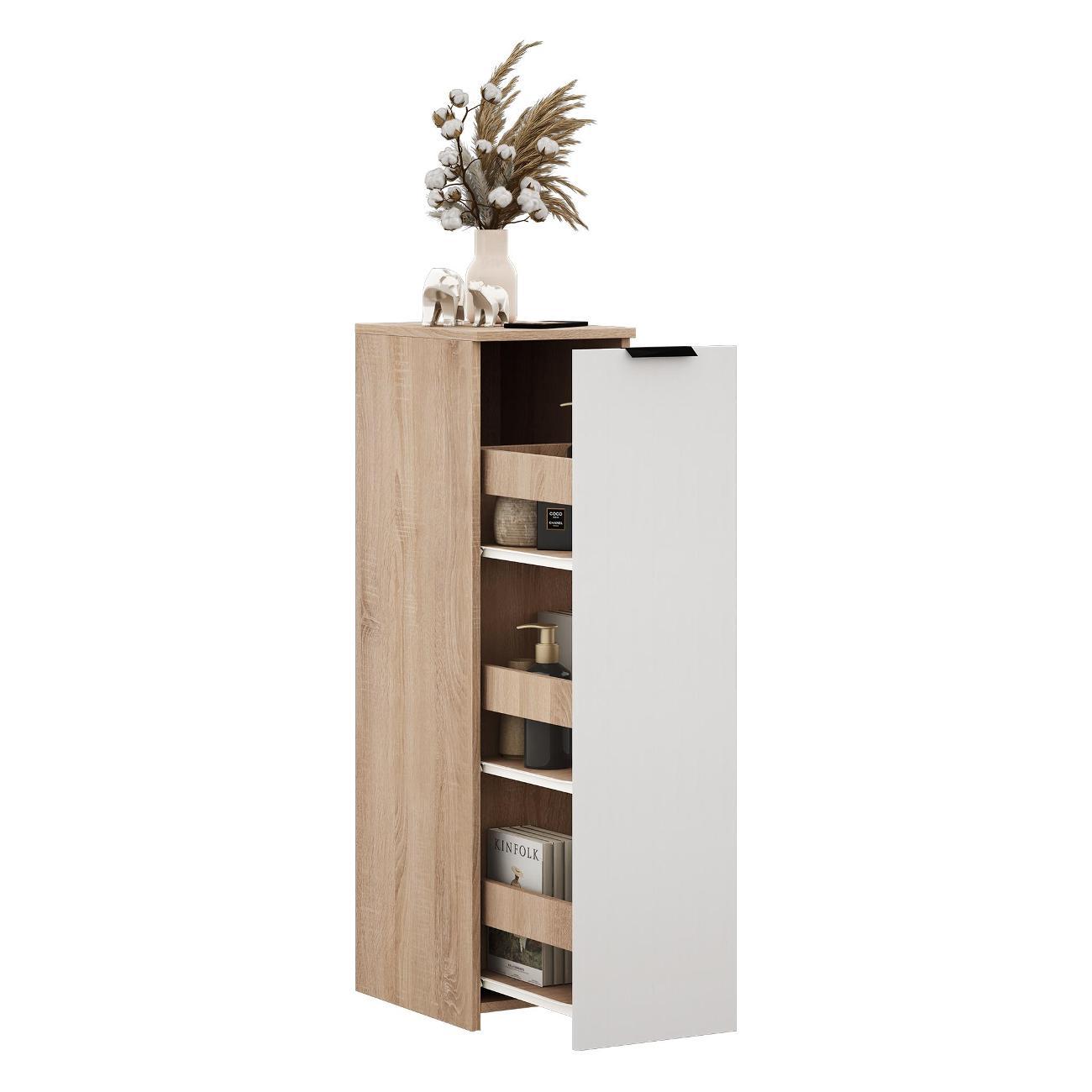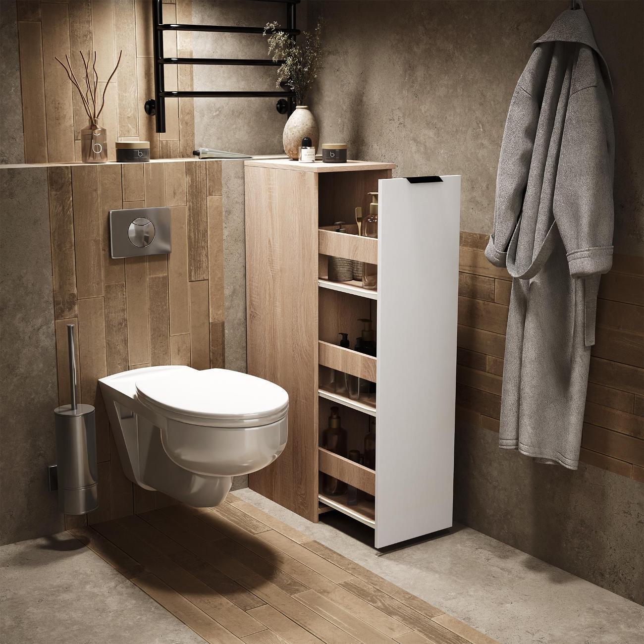 Тумбочка оснащена выкатной секцией с тремя полочками, что позволяет удобно хранить различные предметы. Она идеально подходит для ванной комнаты или туалета, где можно разместить моющие средства, туалетную бумагу и косметику. На кухне устройство удобно использовать для хранения сыпучих продуктов, специй и кухонных принадлежностей.