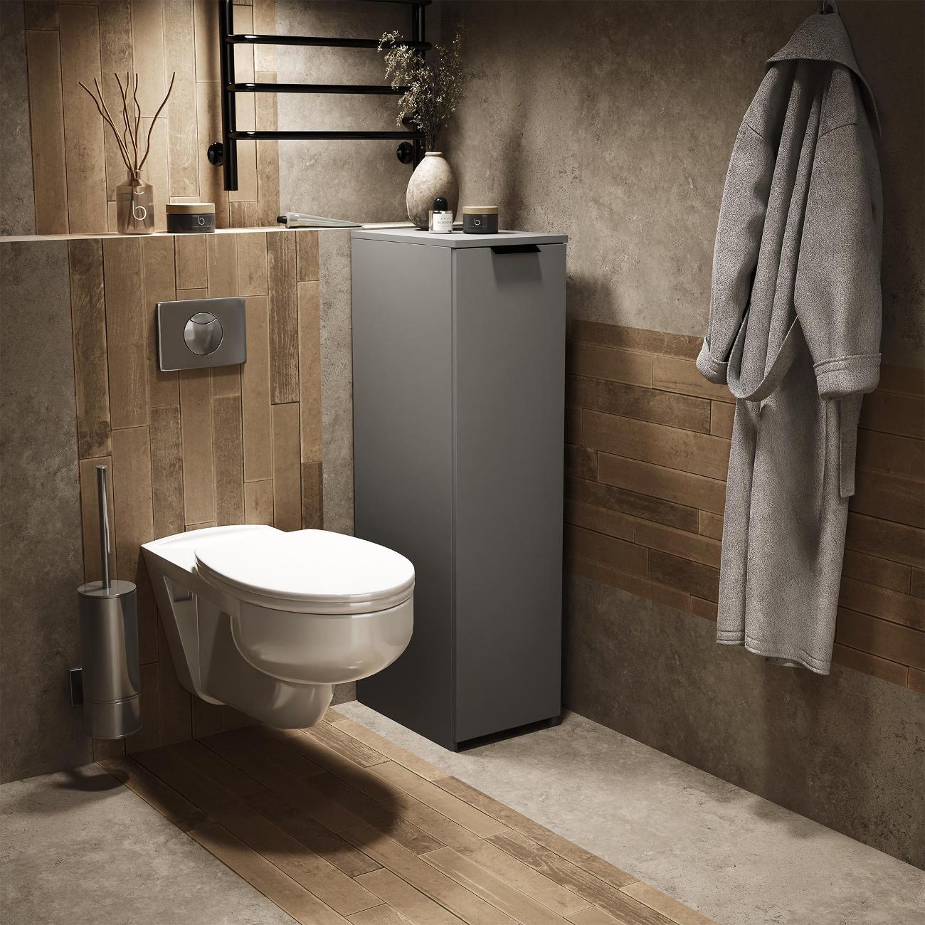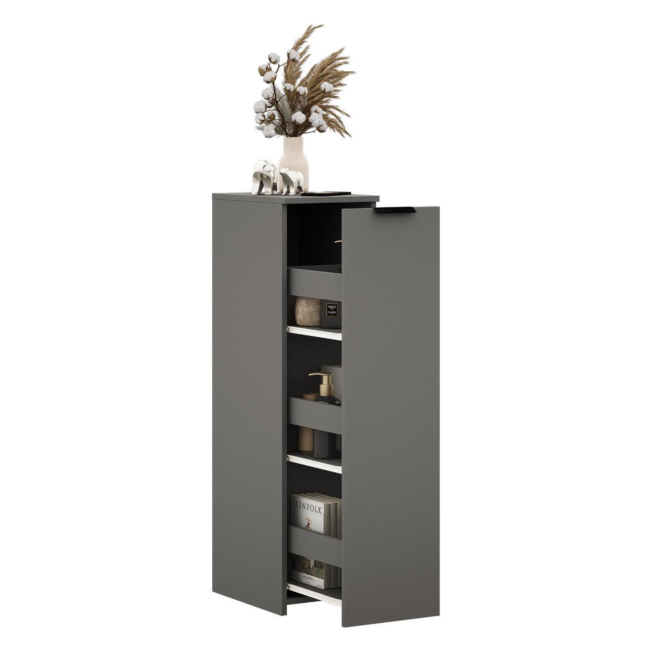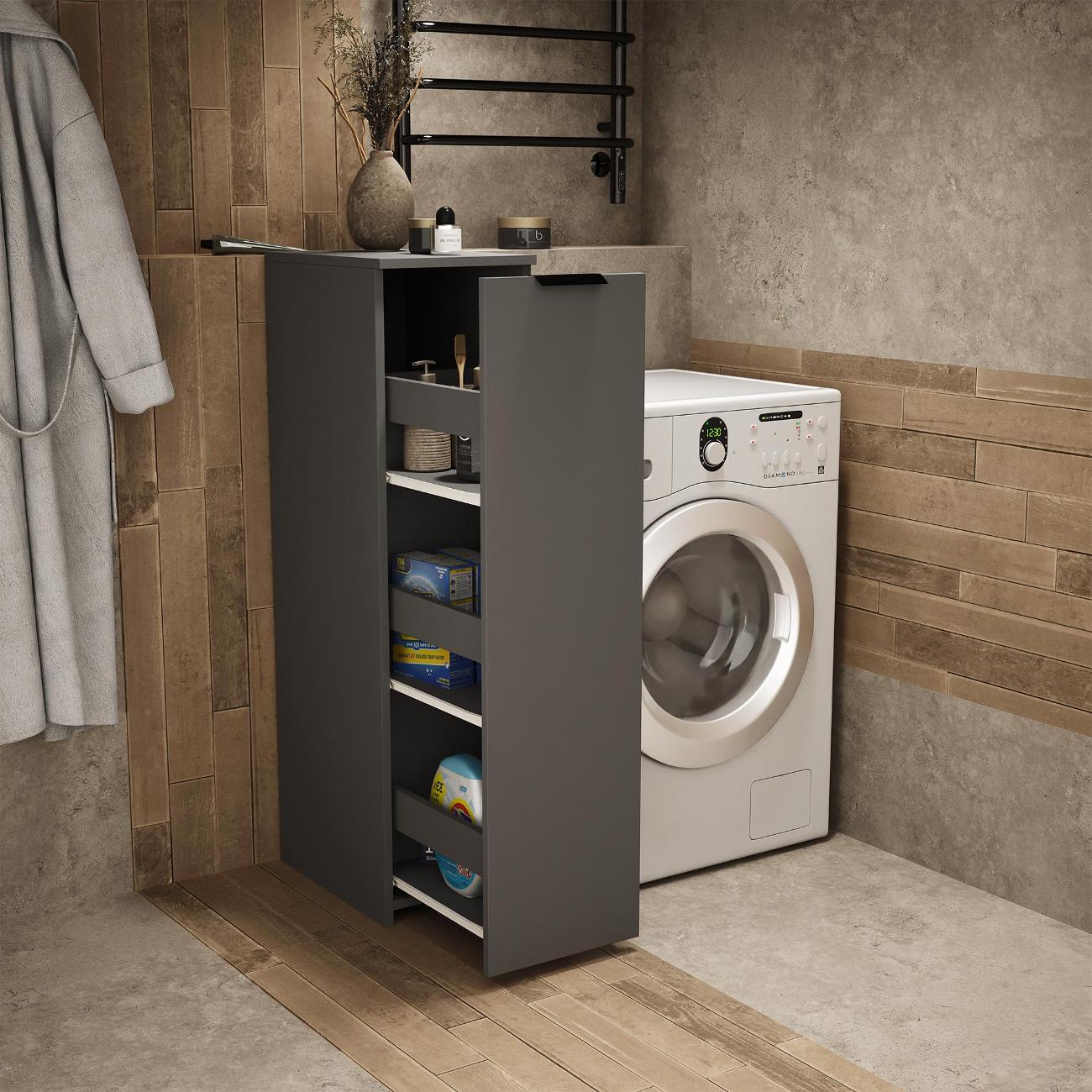 Тумбочка оснащена выкатной секцией с тремя полочками, что позволяет удобно хранить различные предметы. Она идеально подходит для ванной комнаты или туалета, где можно разместить моющие средства, туалетную бумагу и косметику. На кухне устройство удобно использовать для хранения сыпучих продуктов, специй и кухонных принадлежностей.