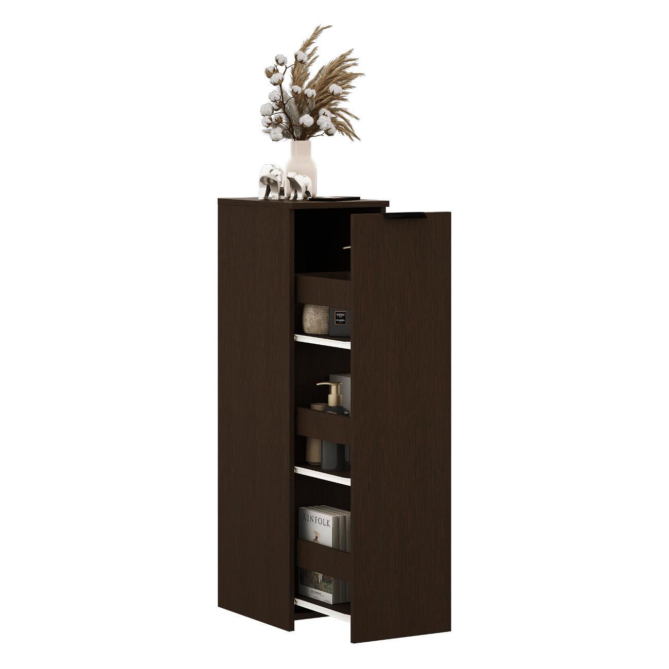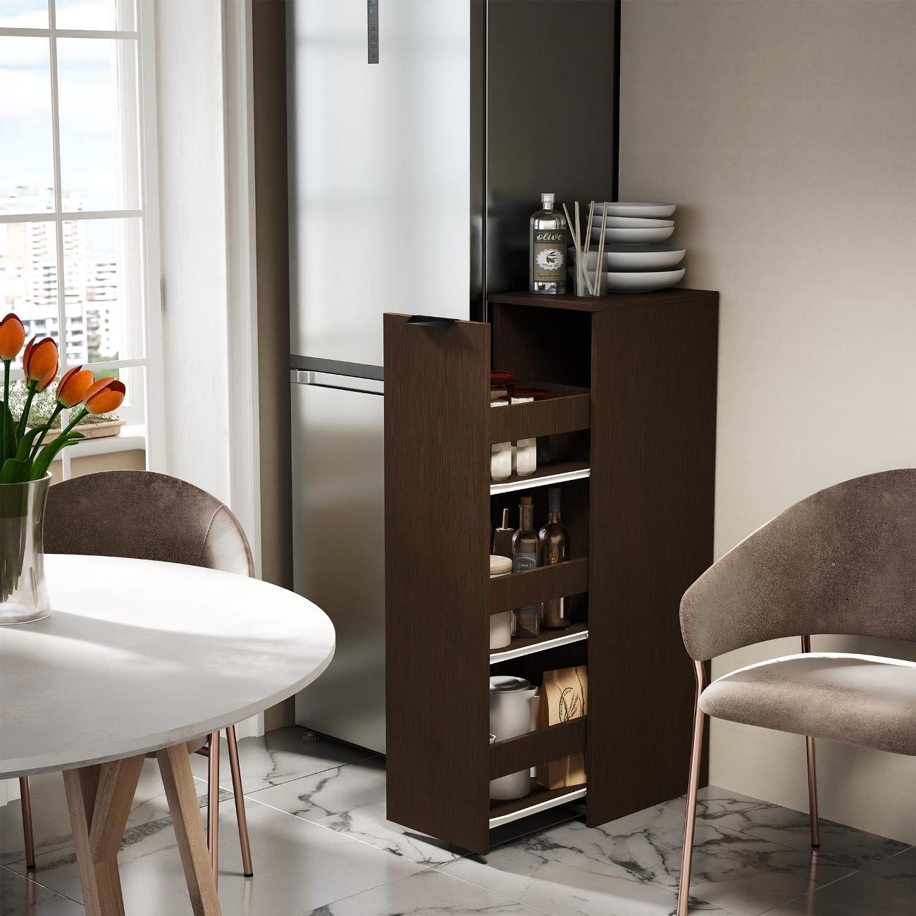 Тумбочка оснащена выкатной секцией с тремя полочками, что позволяет удобно хранить различные предметы. Она идеально подходит для ванной комнаты или туалета, где можно разместить моющие средства, туалетную бумагу и косметику. На кухне устройство удобно использовать для хранения сыпучих продуктов, специй и кухонных принадлежностей.