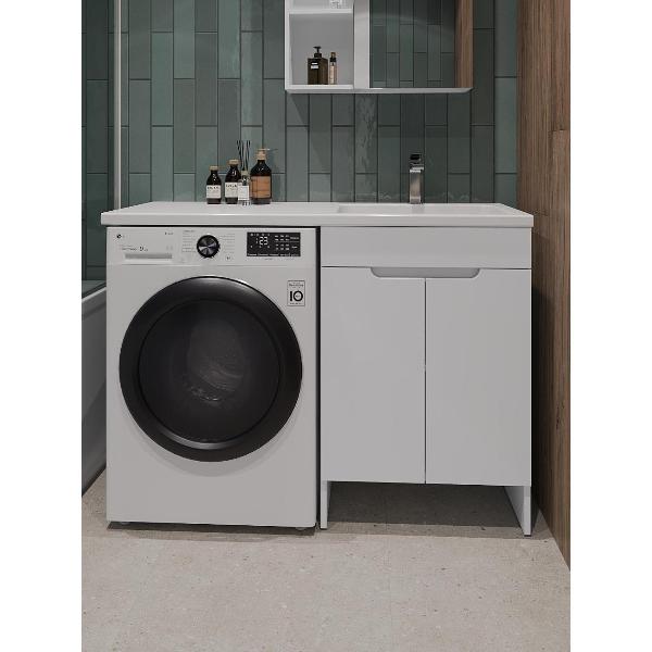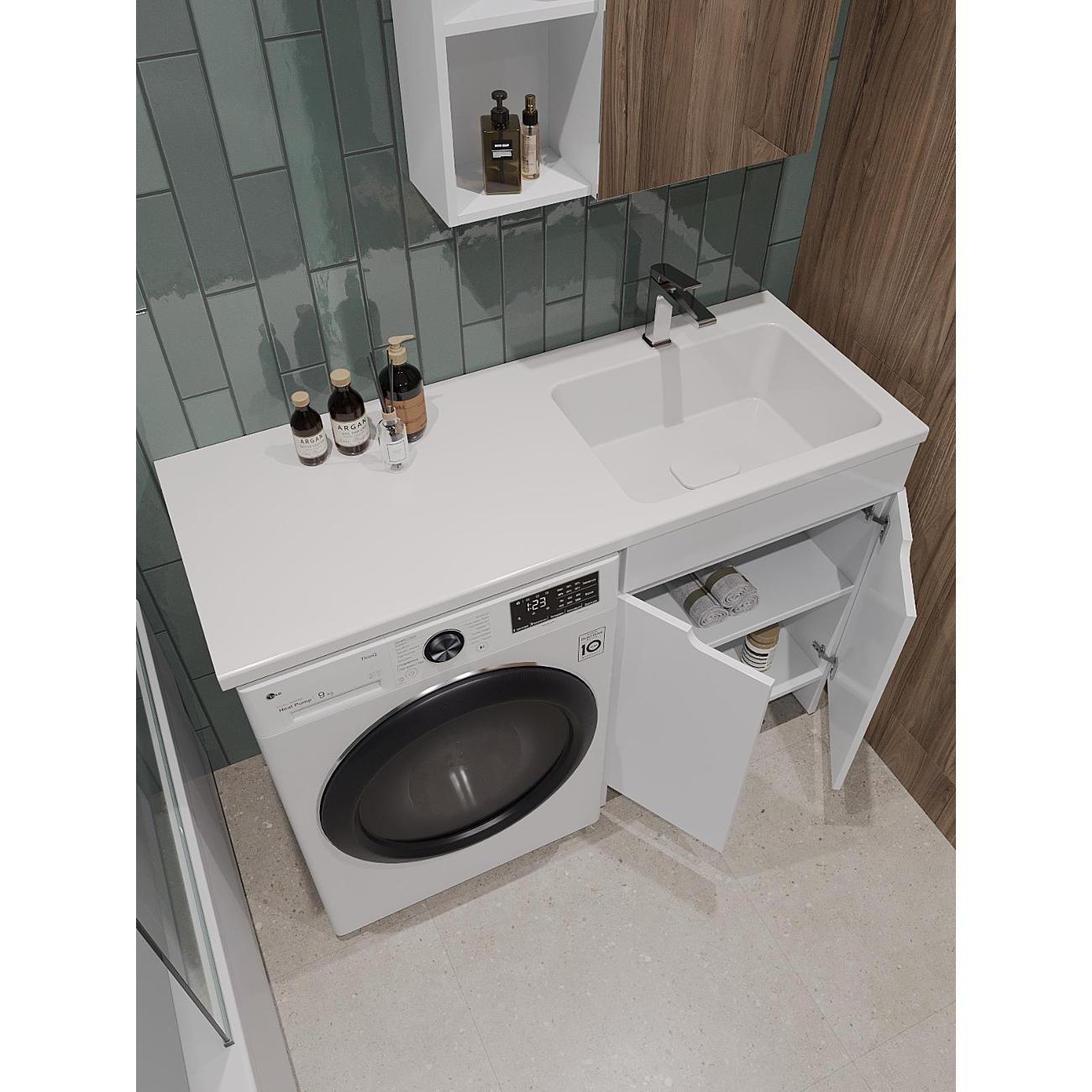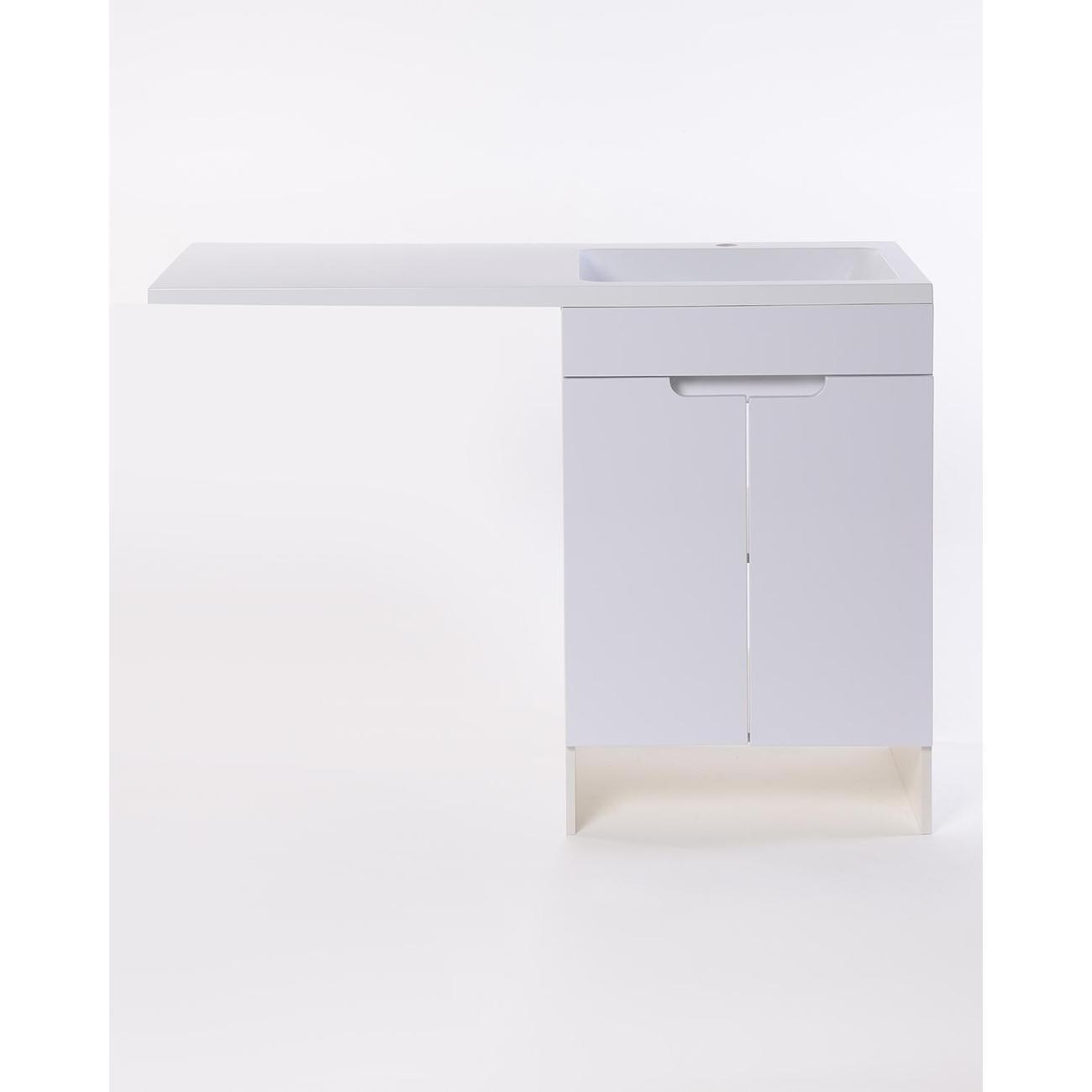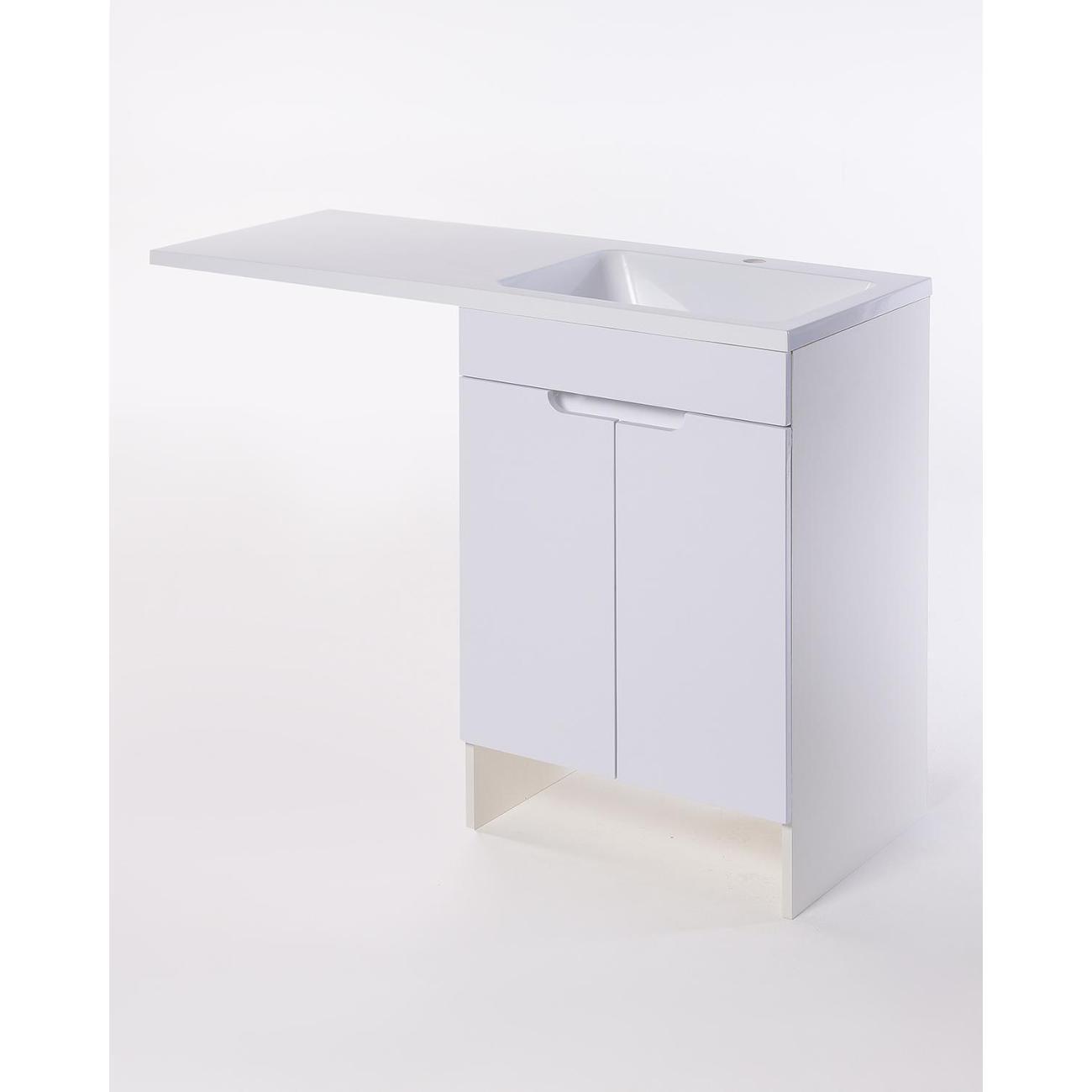 Orange Optima Напольная тумба с правой раковиной напольная под стиральную машину - исполнение правое (тумба справа). Предназначена для использования в ванных комнатах с повышенной влажностью. Фасад - МДФ в цвете белый глянец, корпус - ЛДСП в цвете белый глянец. В комплекте полка ЛДСП и ножки подпятники 4 шт (регулировка по высоте до 10 мм). Раковина с одним отверстием под смеситель (материал - искусственный камень). Зеркальный шкаф OP-60ZSW приобретается дополнительно.