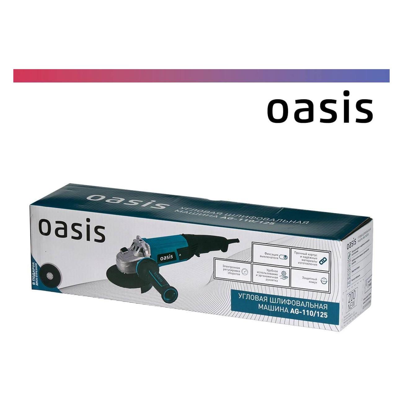 Угловая шлифовальная машина Oasis AG-110/125 оснащена системами быстрой переустановки щеток и эффективного охлаждения, препятствующей преждевременному износу двигателя. Безопасность эксплуатации обеспечивает кожух, не позволяющий стружке и фрагментам деталей разлетаться. Кнопка управления блокируется, повышая удобство работы.