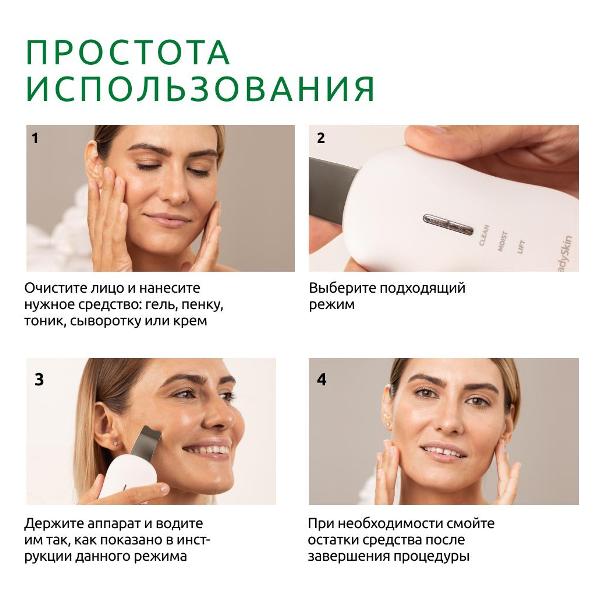 Ультразвуковая чистка ReadySkin Diva (1048660) — устройство, предназначенное для всех типов кожи,которое обеспечивает бережное очищение, способствует омоложению и тонизированию, улучшает кровообращение. При помощи этого прибора можно избавиться от отеков, акне и черных точек, улучшить цвет лица.