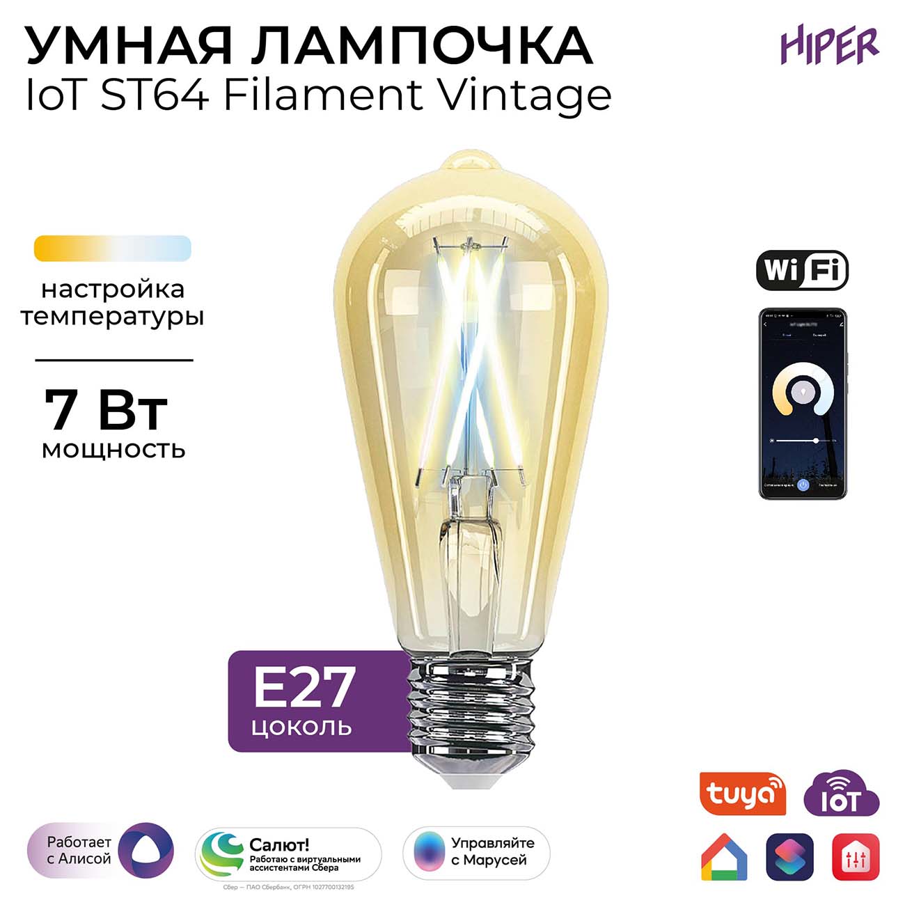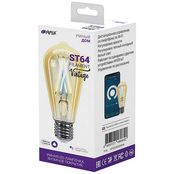 Филаментный LED-элемент создаёт равномерное свечение во всех направлениях. Лампочка обеспечивает световой поток 600 lm, при этом потребляет всего 7 Вт/ч, что говорит о её энергосберегающих свойствах. Управлять Hiper IoT можно с помощью специального приложения на смартфоне или дав команду голосовым помощникам «Яндекс Алиса» и Google Home.