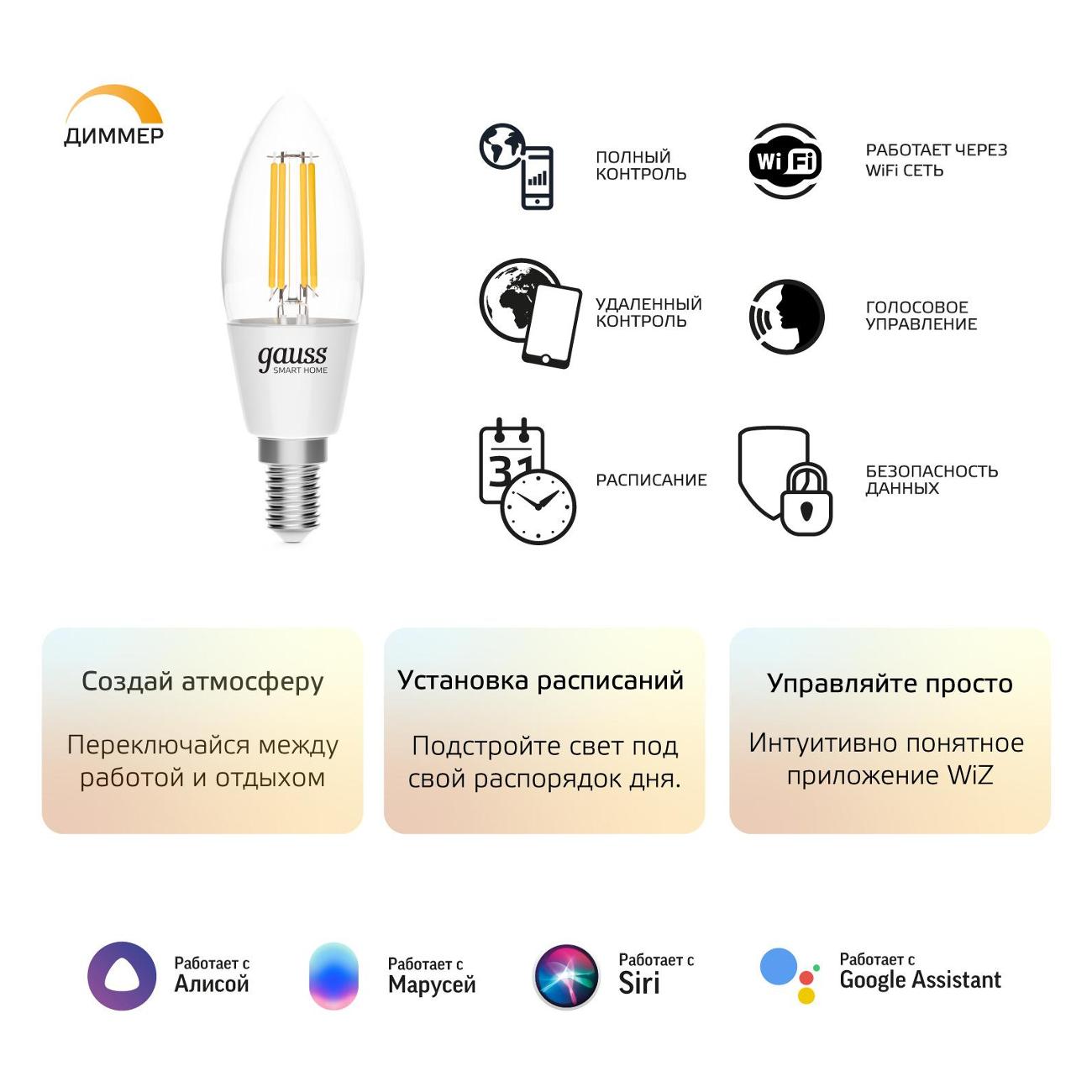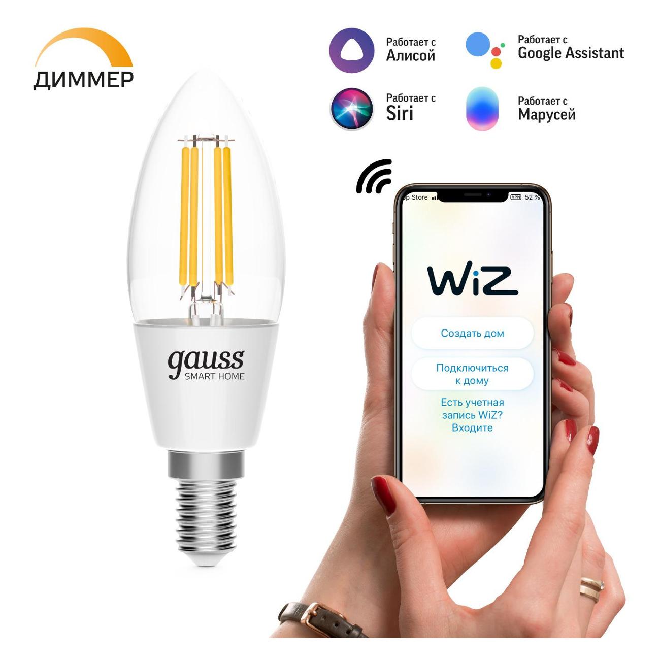 Умная лампочка Gauss SmartHome 1230112 питается от электросети 220 В. Стеклянный корпус выполнен в форме свечи. Передача сигнала осуществляется беспроводным способом через Wi-Fi. Модель работает в системе «Умный дом», обладает сменным режимом свечения. Световой поток изделия составляет 495 Лм. Модель оснащена цоколем E14. Характеризуется возможностью управления прибором через смартфон и с помощью голосовых помощников: Alexa, Google, Siri, «Алиса», «Маруся» и «Салют». Габариты: 141х78х141 мм. Вес — 122 г.