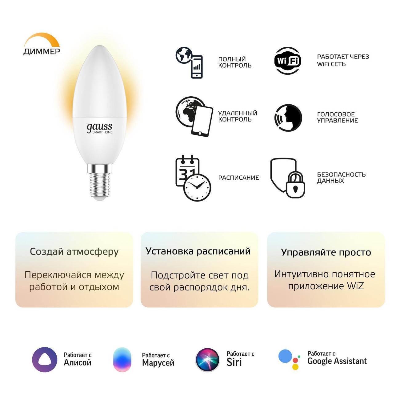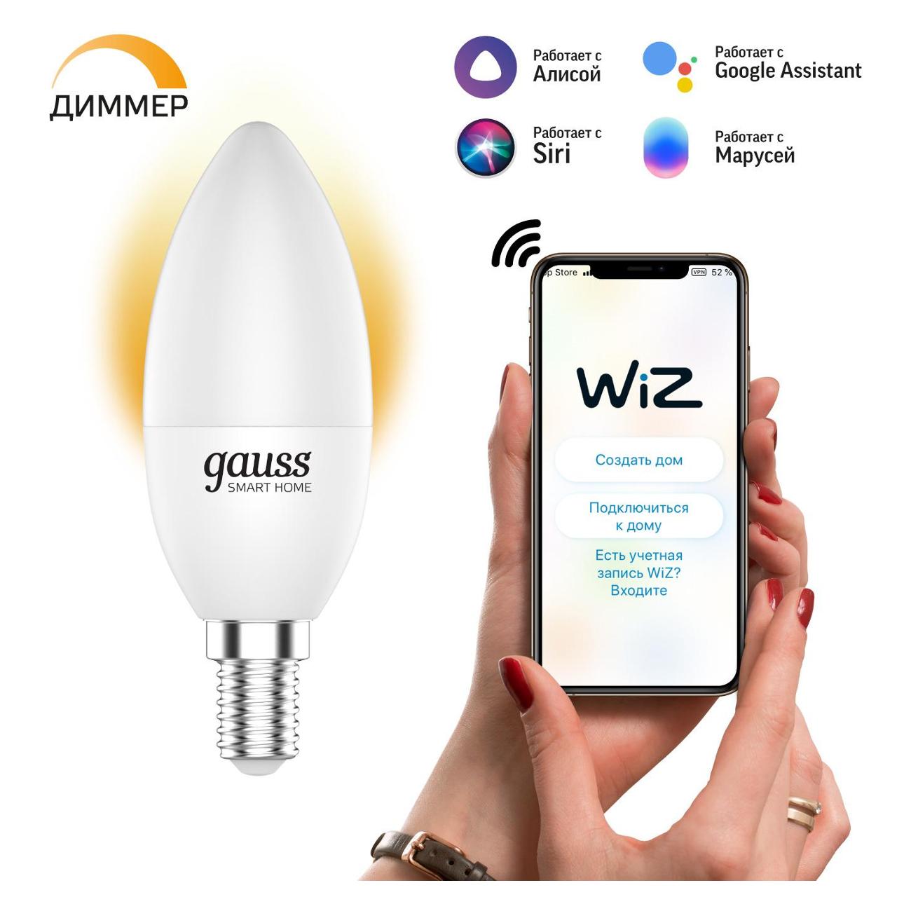 Белая умная лампочка Gauss SmartHome 1100112 управляется с помощью голосового помощника. Цветовая температура — 2700 K. Габариты изделия — 13,8х7,7х13,8 см. Вес модели — 107 г. Корпус в форме свечи выполнен из прочного стекла с матовым покрытием. Тип патрона — Е14. Устройство встраивается в систему «Умный дом». Способ передачи данных — с помощью Wi-Fi. Световой поток составляет 470 Lm. Радиус действия беспроводного соединения — до 20 м. Угол рассеивания света — 220°. Мощность лампочки — 5 Вт. Срок службы светодиодной лампы — до 15000 часов.