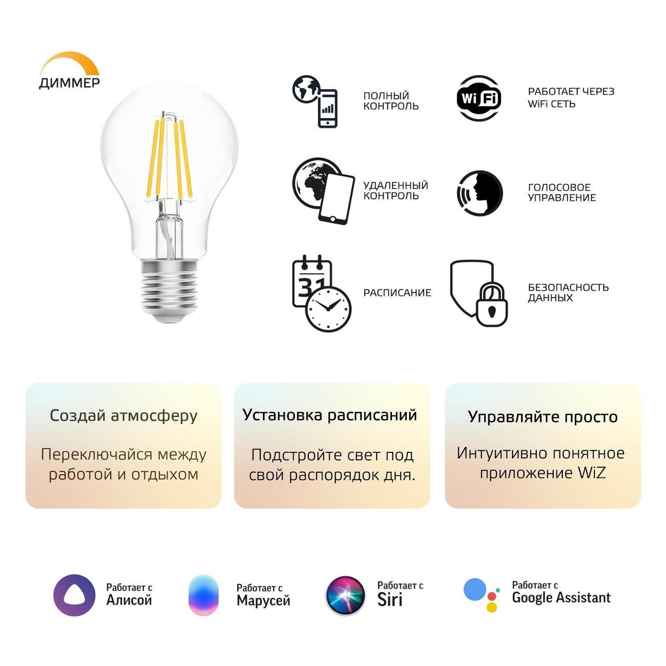Умная лампочка Gauss SmartHome 1200112 характеризуется световым потоком 806 Лм. Работает от электросети 220 В. Прибор обладает сменным режимом свечения и работает в системе «Умный дом». Изделием можно управлять с помощью смартфона. Модель оборудована цоколем Е27. Поддерживаются голосовые помощники: Alexa, Google, Siri, «Алиса», «Маруся» и «Салют». Корпус устройства выполнен из стекла в форме груши. Габариты: 141х79х141 мм. Вес — 129 г.