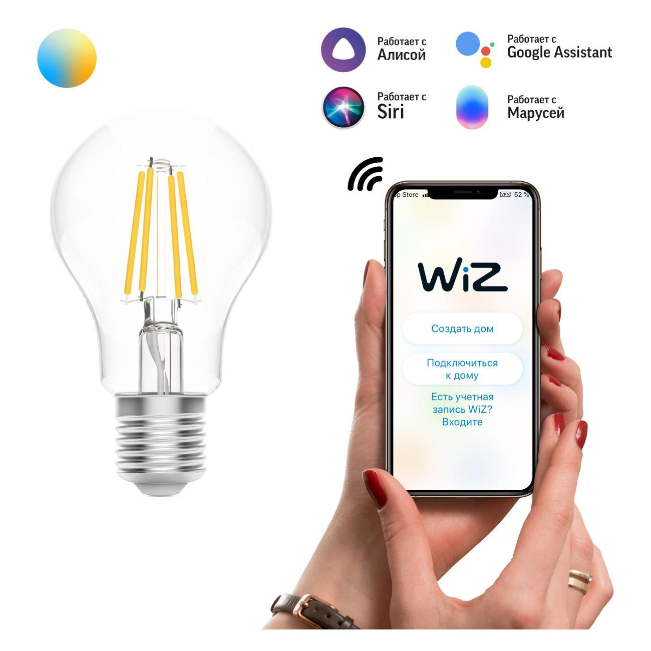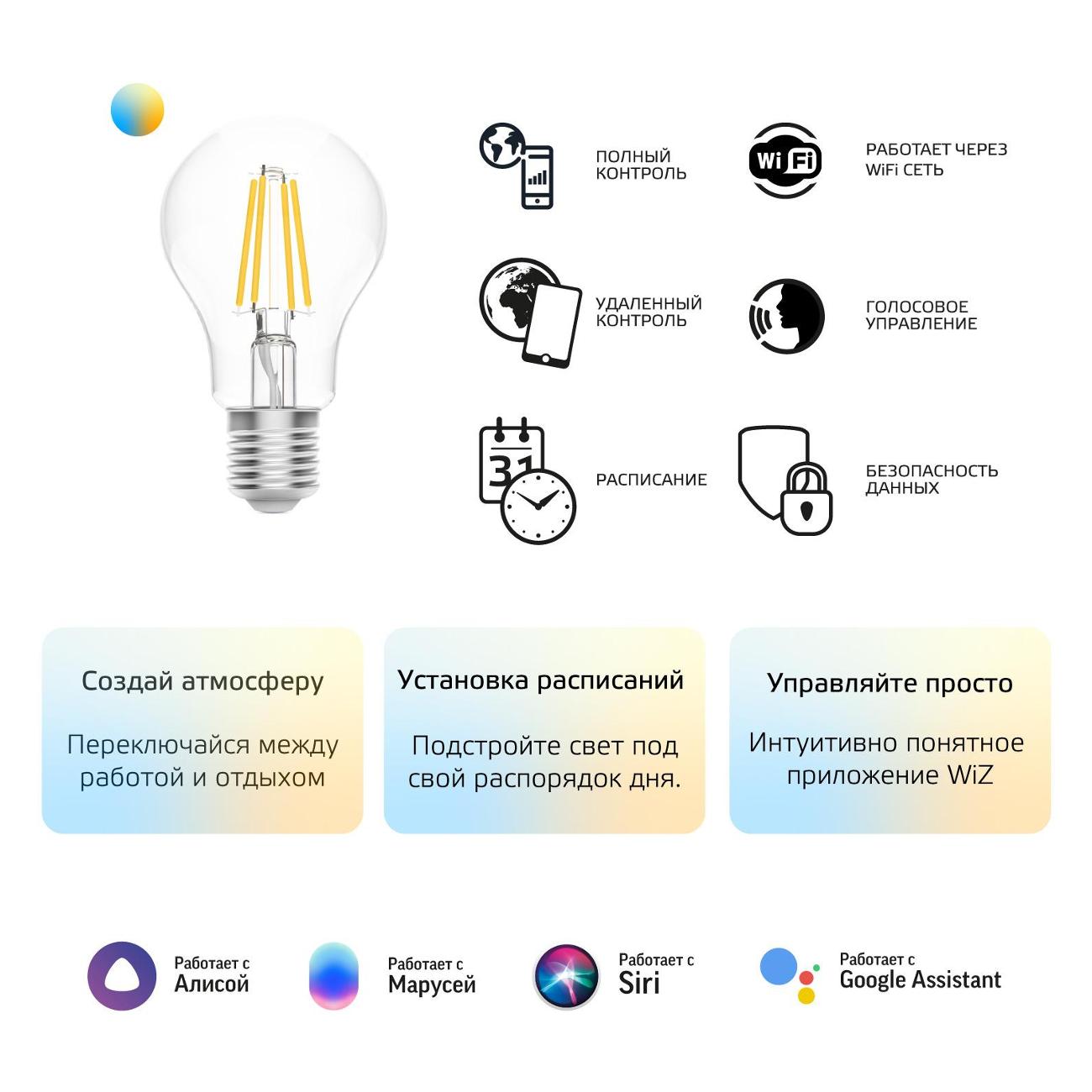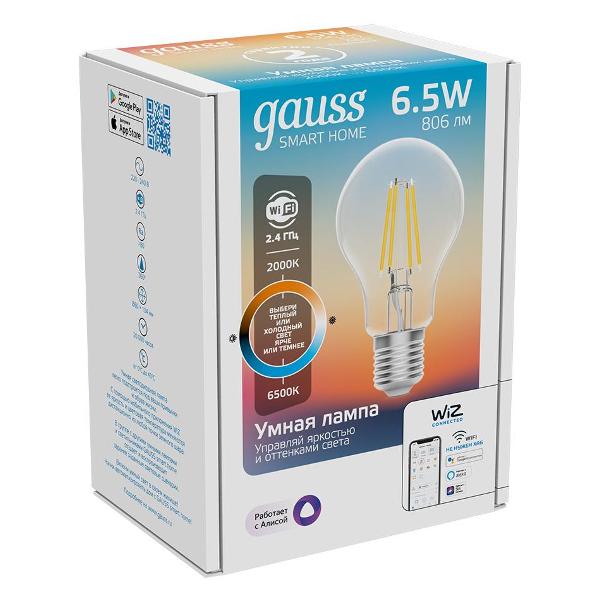 Умная лампочка Gauss SmartHome 1220112 характеризуется световым потоком 806 Лм. Работает от электросети 220 В. Прибор обладает сменным режимом свечения и работает в системе «Умный дом». Изделием можно управлять с помощью смартфона. Модель оборудована цоколем Е27. Поддерживаются голосовые помощники: Alexa, Google, Siri, «Алиса», «Маруся» и «Салют». Корпус устройства выполнен из стекла в форме груши. Габариты: 141х79х141 мм. Вес — 133 г.