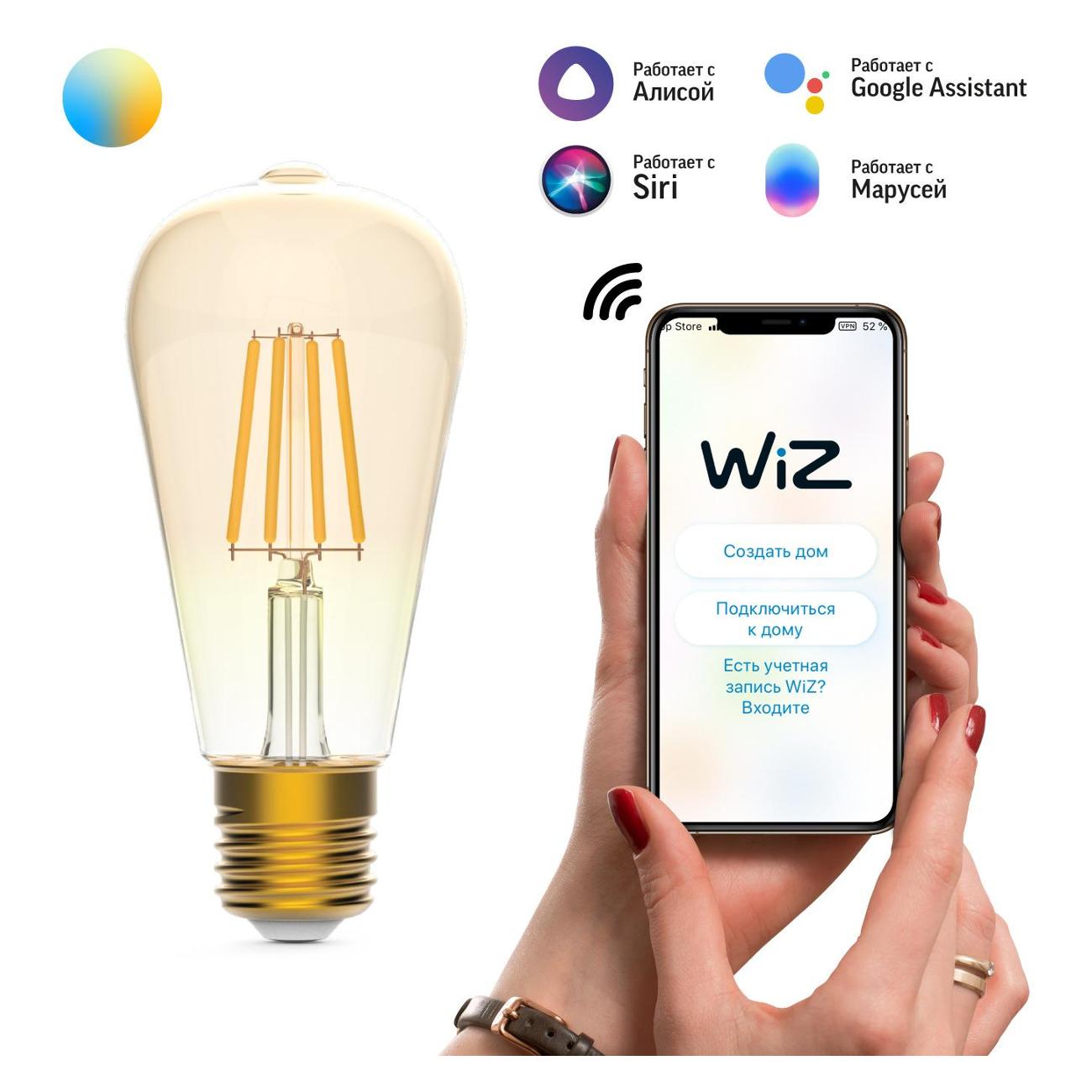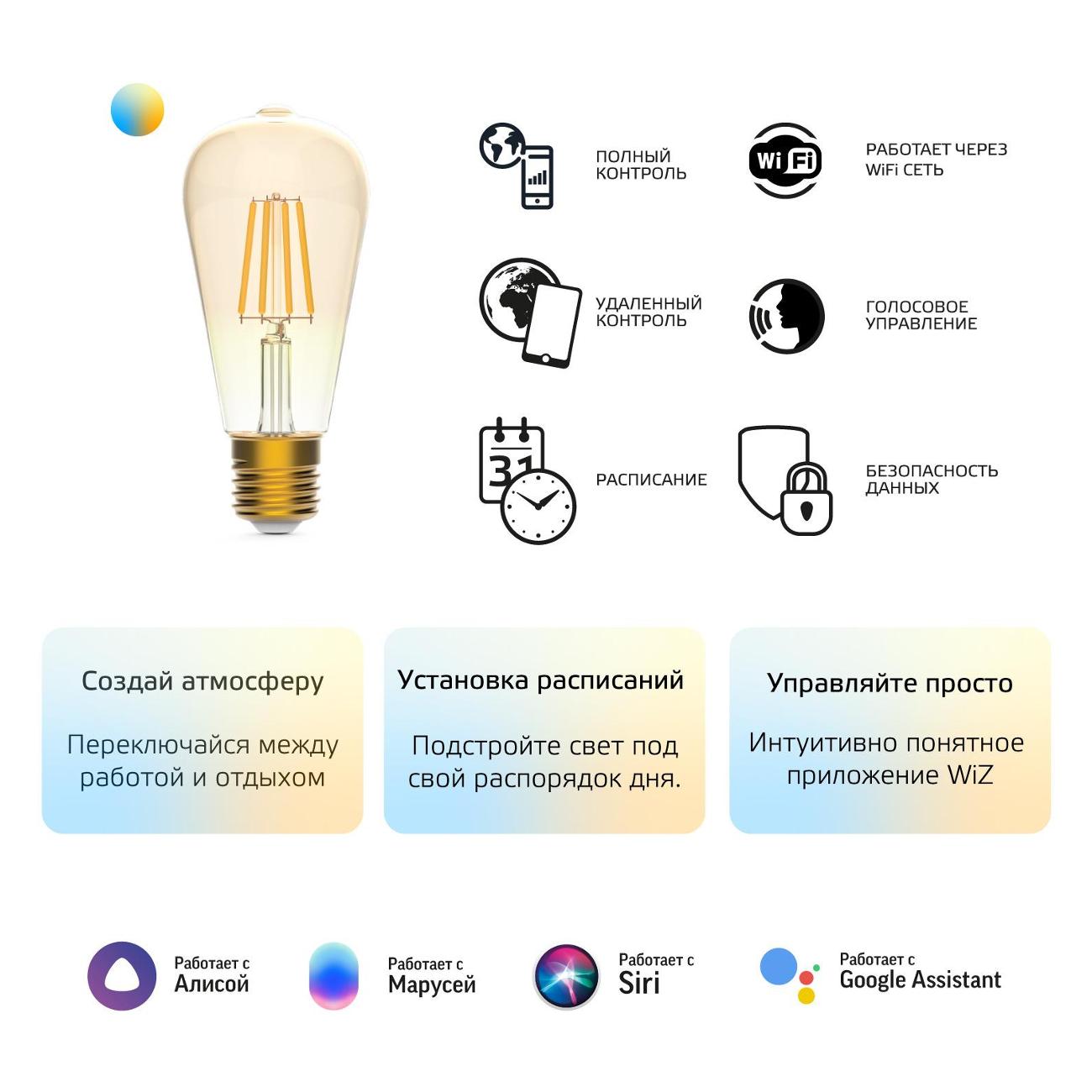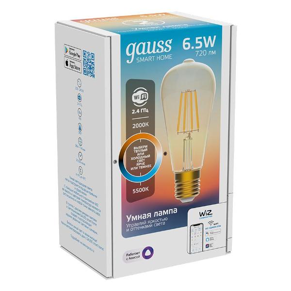 Умная лампочка Gauss SmartHome 1310112 цилиндрической формы обладает стеклянным корпусом. Характеризуется сменным режимом свечения. Питается от электросети 220 В. Световой поток модели равен 720 Лм. Устройство может работать в системе «Умный дом», оснащено беспроводной передачей сигнала через Wi-Fi. Модель поддерживает голосовые помощники: Alexa, Google, Siri, «Алиса», «Маруся» и «Салют». Цоколь прибора относится к типу Е27. Управлять работой можно с помощью смартфона. Габариты: 171х79х171 мм. Вес — 165 г.