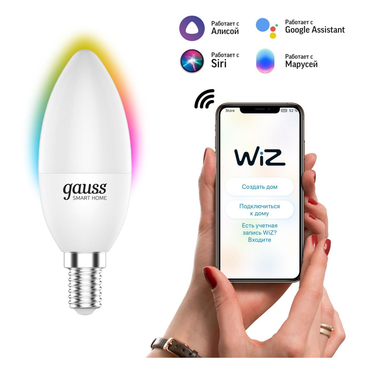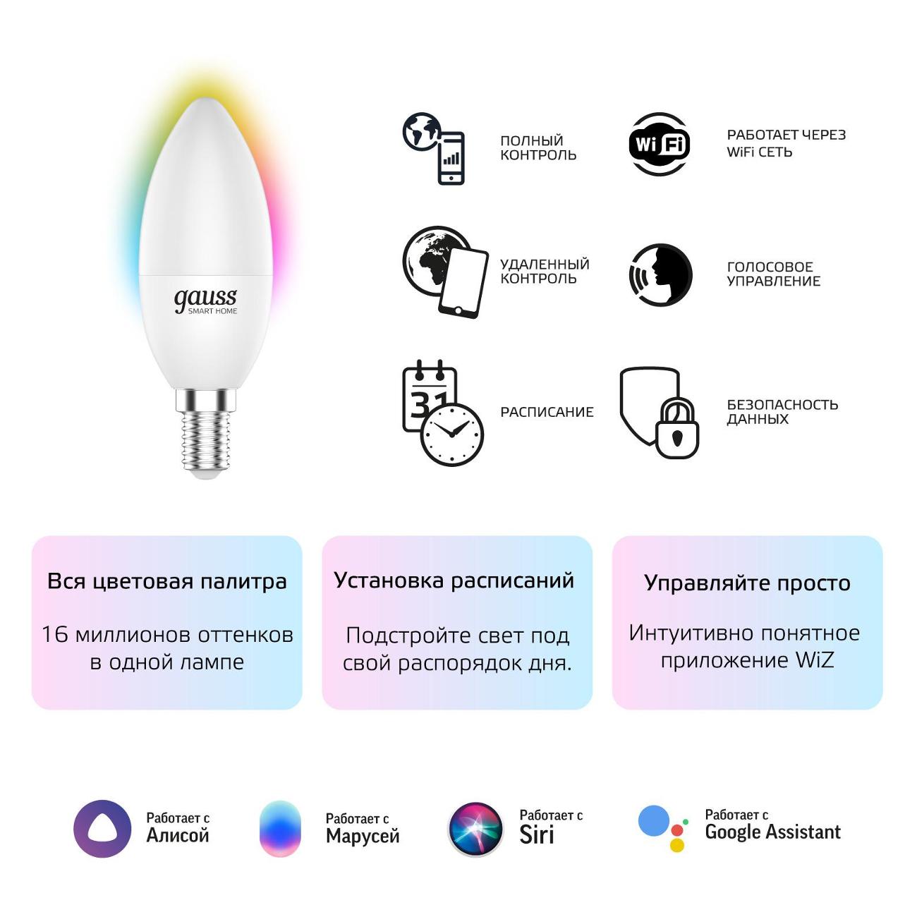 Белая умная лампочка Gauss SmartHome 1190112 в форме свечи сделана из прочного матового стекла. Способ управления устройством — с помощью голосового помощника или приложения на смартфоне. Габариты изделия — 13,7х7,7х13,7 см. Вес модели — 118 г. Тип цоколя — Е14. Световой поток составляет 470 Lm. Мощность лампочки — 5 Вт. Напряжение — от 180 до 240 В. Присутствует функция диммирования. Модель оснащена 32 режимами освещения. Радиус беспроводного подключения — до 20 м. Угол освещения — 240°. RGB-cветодиоды позволяют выбрать нужный оттенок света. Срок службы — до 15000 часов.