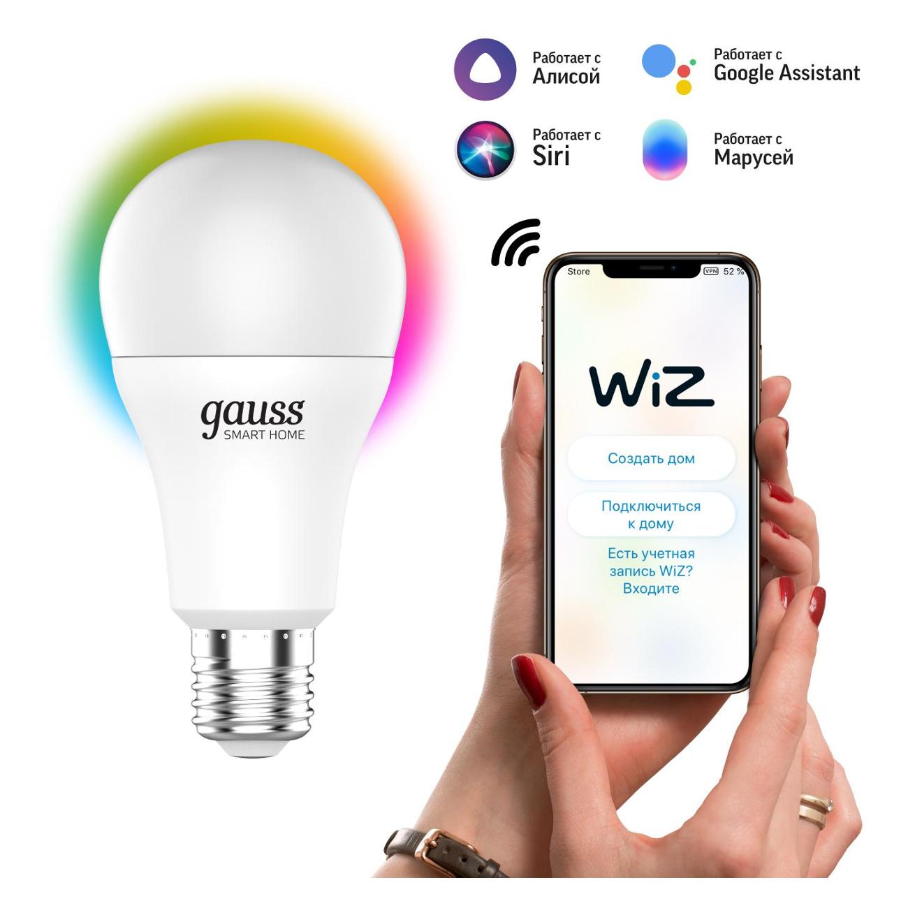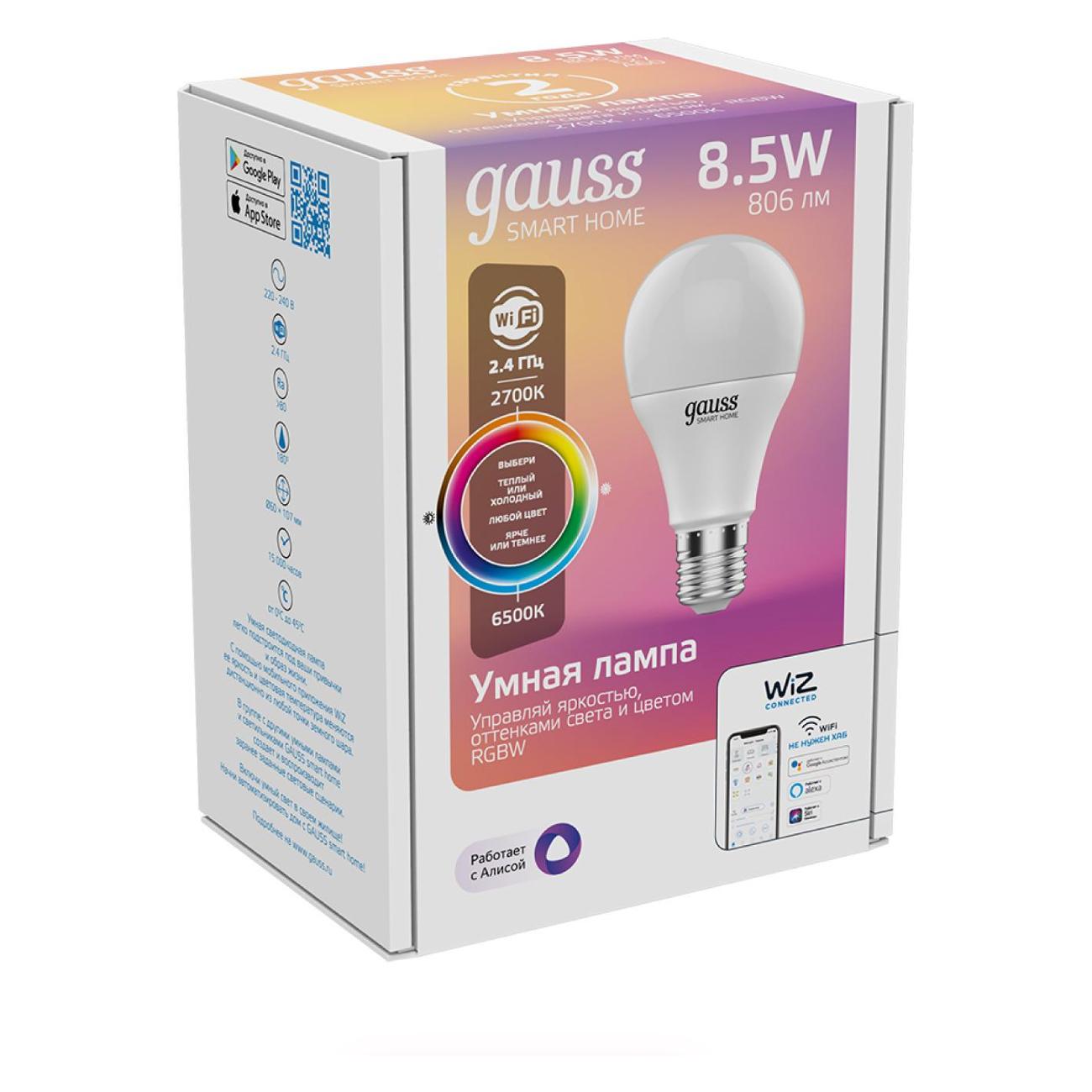 Белая умная лампочка Gauss SmartHome 1170112 оснащена 32 режимами освещения. Грушевидный корпус сделан из прочного матового стекла. Габариты изделия — 13,7х7,7х13,7 см. Вес модели — 133 г. Присутствует поддержка Wi-Fi, функция диммирования. Способ дистанционного управления — с помощью приложения на смартфоне или голосового помощника. Тип цоколя — Е27. Световой поток составляет 806 Lm. Расстояние беспроводного соединения — до 20 м. Угол рассеивания света — 180°. Мощность лампочки — 8,5 Вт. Возможно создание дополнительных режимов освещения.
