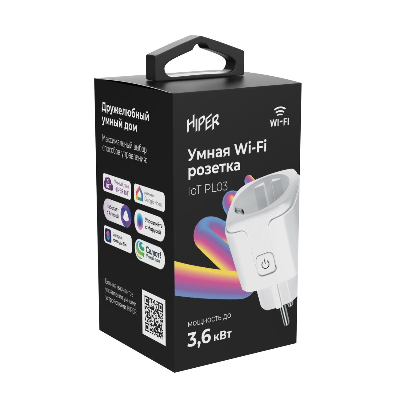 «Умная» розетка Hiper Iot PL03 размером 8,4х5х5 см весит 0,085 г и потребляет до 3,6 кВт электроэнергии. Устройство со встроенным модулем Wi-Fi поддерживает Google Home. Модель управляется сенсорной кнопкой на корпусе, дистанционно, через приложение на смартфоне или при помощи громкой связи и голосовых помощников.