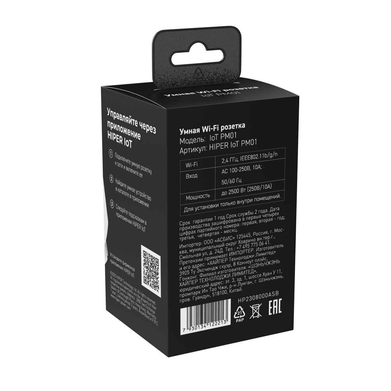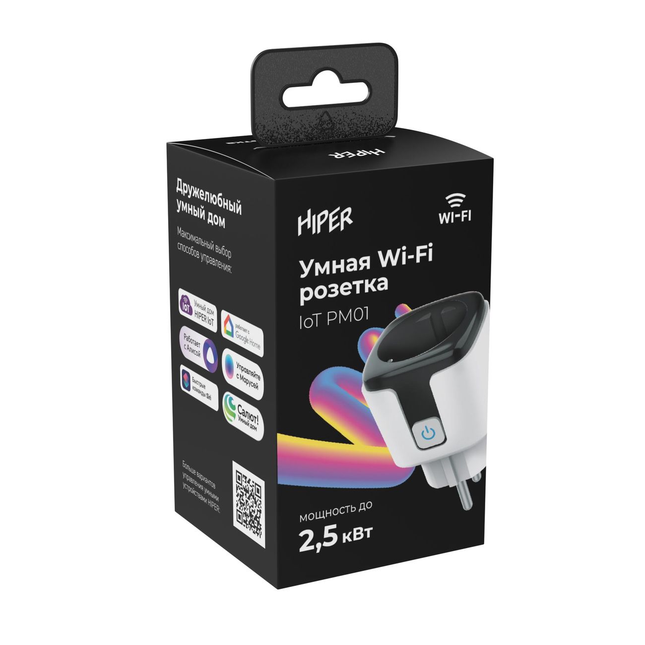 Умная розетка Hiper Iot Pm01 — удобное и надежное в использовании устройство, которое может работать по таймеру. Прибор предназначен для установки внутри помещения. Поддерживается управление через смартфон или умные колонки — подключение к интернету осуществляется посредством Wi-Fi (2,4 ГГц). Для взаимодействия с розеткой можно вызывать голосового помощника Google Assistant, «Алиса», «Маруся» и других. Максимальное количество включений в сутки, на которое рассчитано устройство, достигает 1000. Мощность — до 2500 Вт. Размеры умной розетки составляют 5,2х5,2х8,5 см, вес — 50 г.