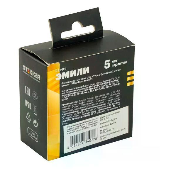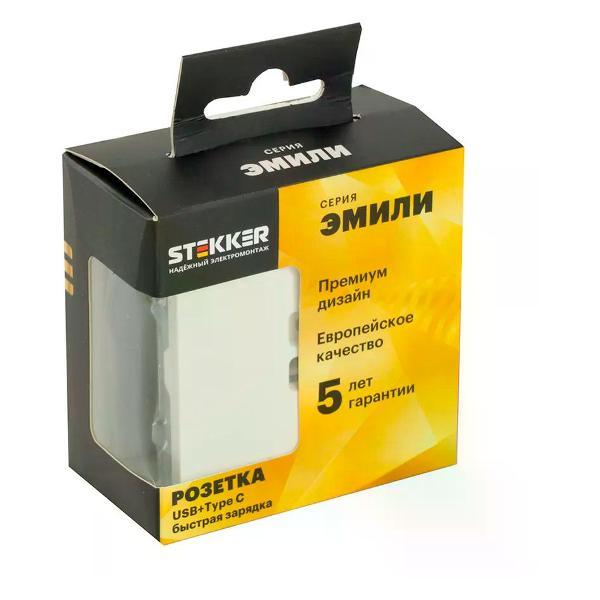 Розетка STEKKER Эмили - встраиваемая розетка для подключения электрических приборов с USB-A и USB-C разъемами. Изготовлена из пластика с покрытием Soft-touch. Устанавливается в установочную коробку совместно с рамкой (приобретается отдельно).Особенности и преимущества:- высокая устойчивость к потертостям и царапинам;- защита от ультрафиолетового излучения;- возможность комбинировать с рамками различных цветов коллекции Эмили STEKKER.. Тип: Розетки; Вид розетки: Розетка USB; Наличие крышки: Нет; Цвет: Белый; Водозащищенный корпус: Нет; Степень защиты (IP): 20; Наличие USB: Да; Бренд: STEKKER; Серия: Эмили; Вес 0.105; Гарантия производителя: 5 лет; Страна производства: Китай