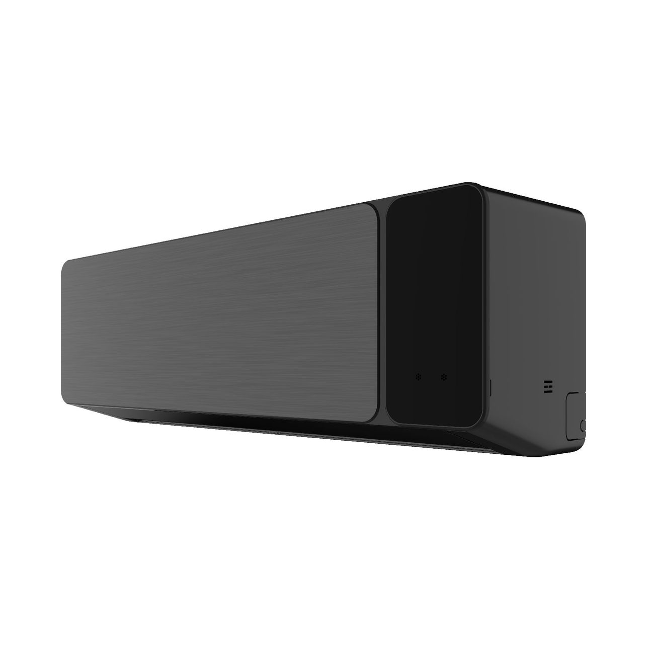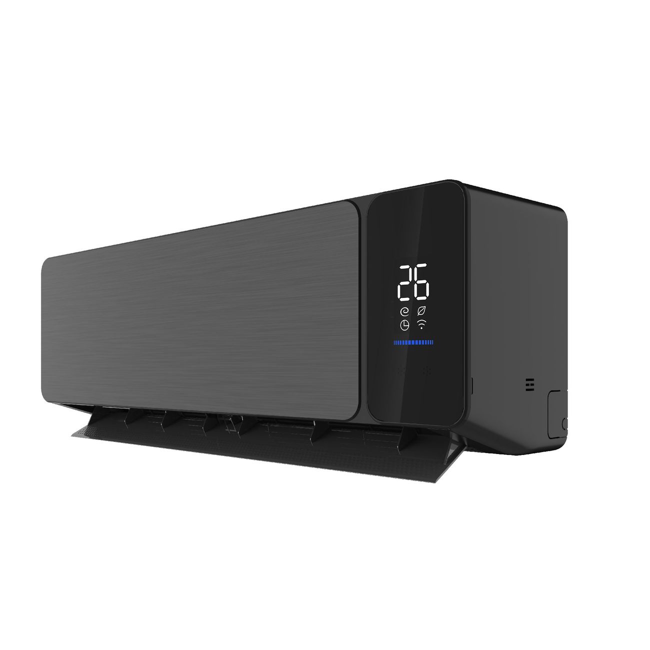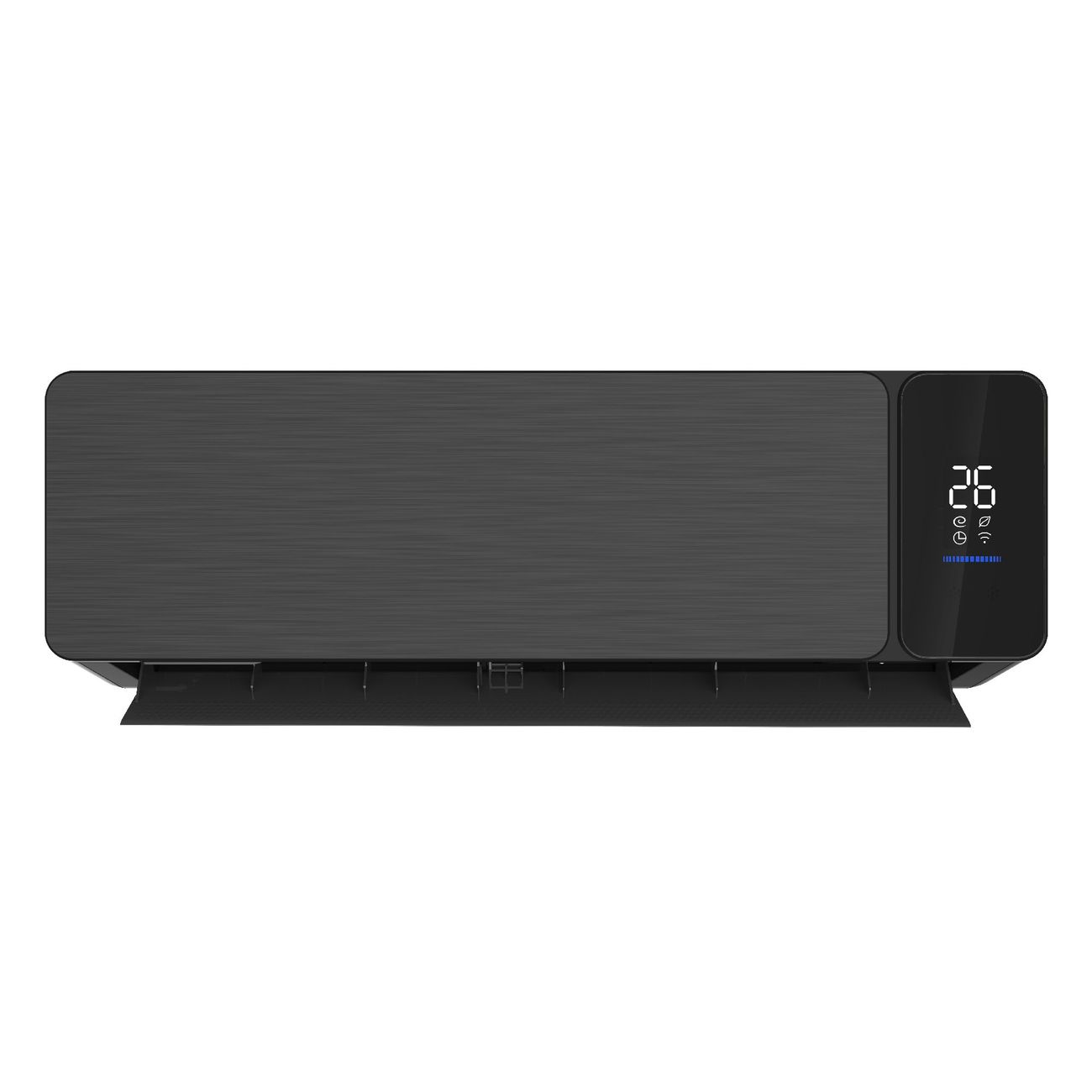 Особый рельеф на шторке способствует более мягкому обдуву. Положение жалюзи регулируется в вертикальном и горизонтальном положении. Передняя панель внутреннего блока выполнена из пластика и имитирует шлифованный металл. Большой цифровой дисплей отображает параметры работы.