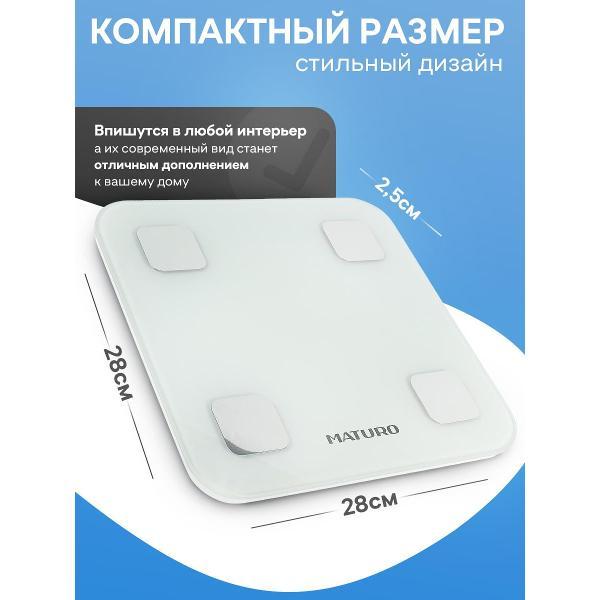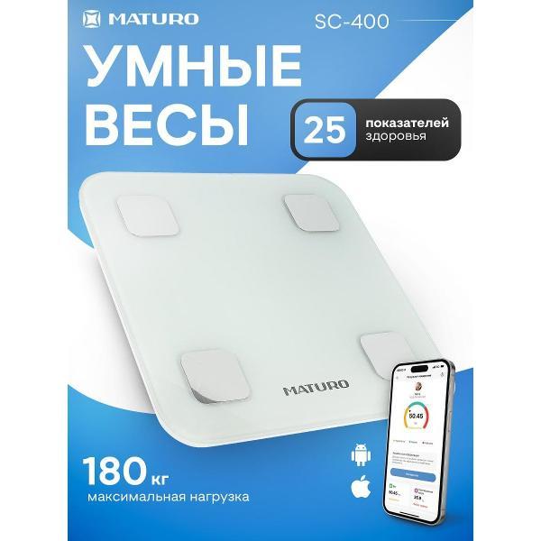 Умные весы Maturo SC-400 — устройство для комплексного анализа состава тела методом биоимпедансометрии. Помимо контроля веса, измеряют ключевые параметры: жира, мышц и воды в организме.